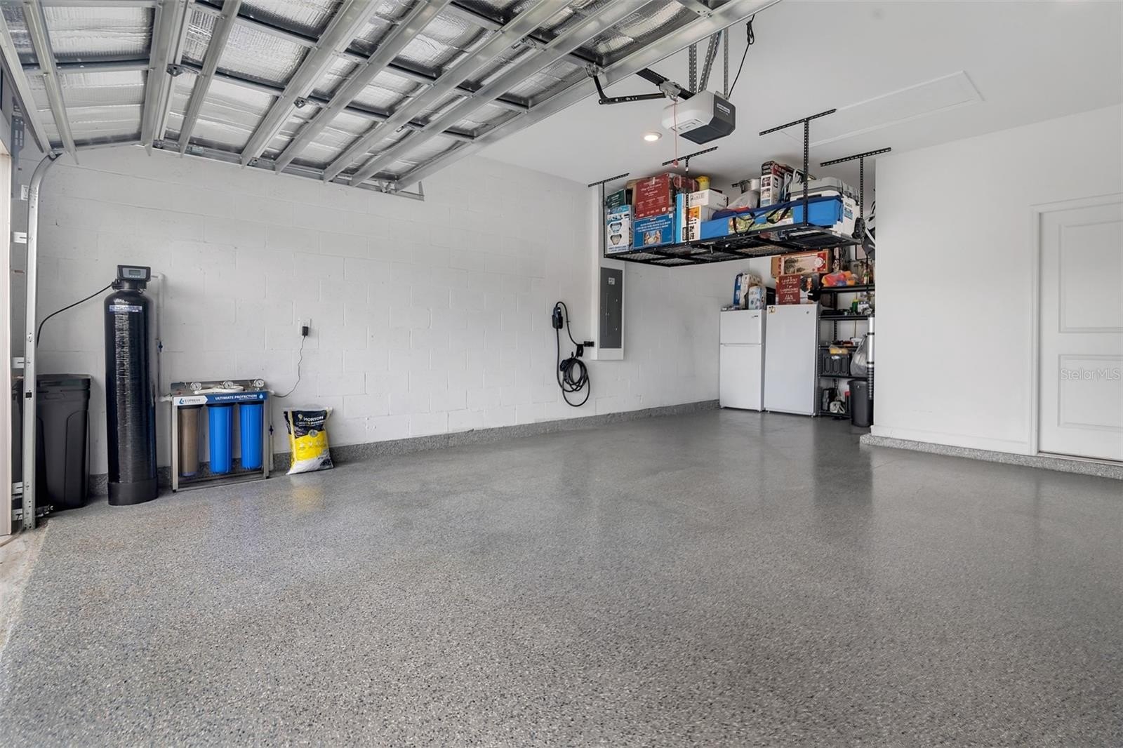 The garage features storage rails, a rolling storage cage, and an additional refrigerator and freezer. A whole-house water softener, triple filtration system, and reverse osmosis system at the kitchen sink are included.