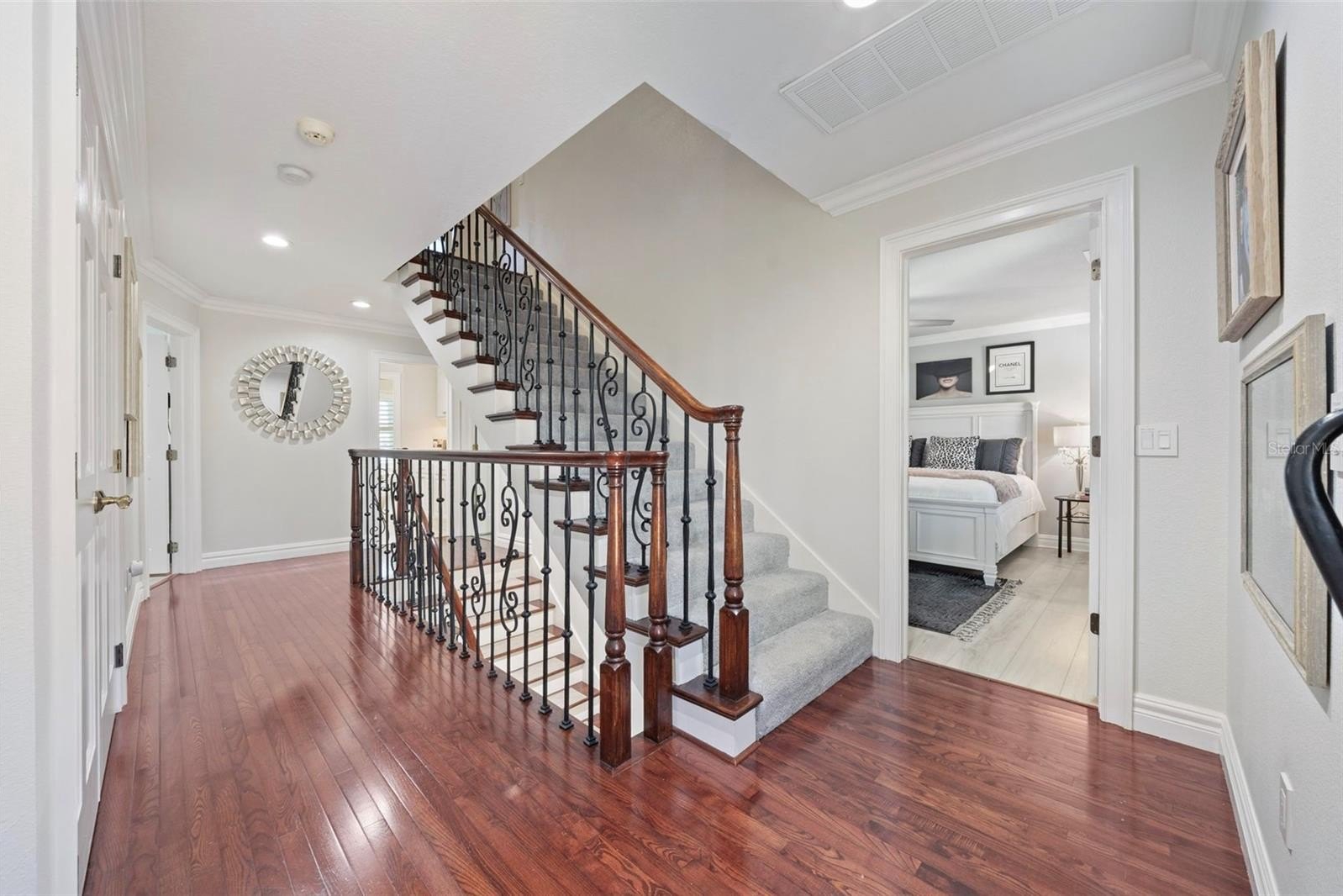 Welcome to true lakefront living on stunning 100-acre ski Lake Cooper! This exceptional 4-bedroom, 3.5-bath home offers the perfect blend of modern upgrades, comfort, and waterfront lifestyle in the heart of Lutz. The primary suite is located on the second floor along with the laundry room, providing privacy and everyday convenience. The spacious master retreat features its own electric fireplace and tranquil lake views. There is a full bath on the main floor. 2nd floor has 2 additional bedrooms and full bath. Third floor features a large bedroom, 1/2 bath and 3 walk in attic spaces that is amazing storage.
