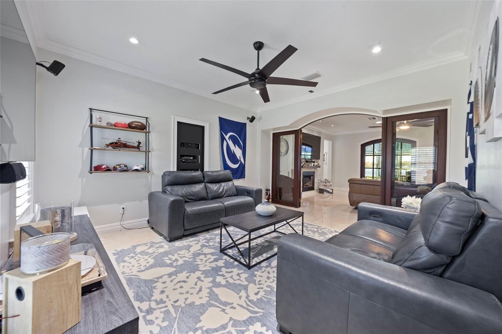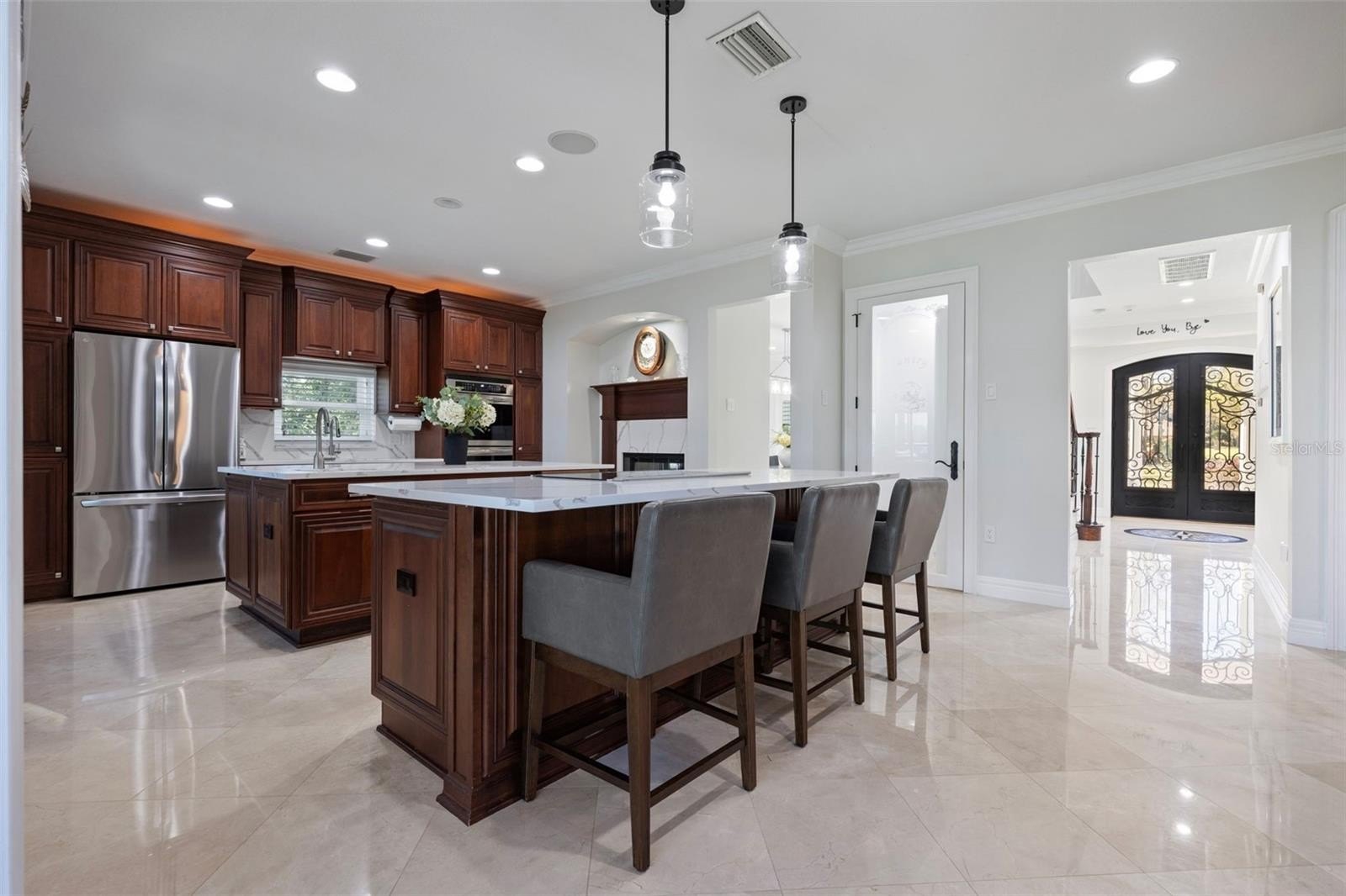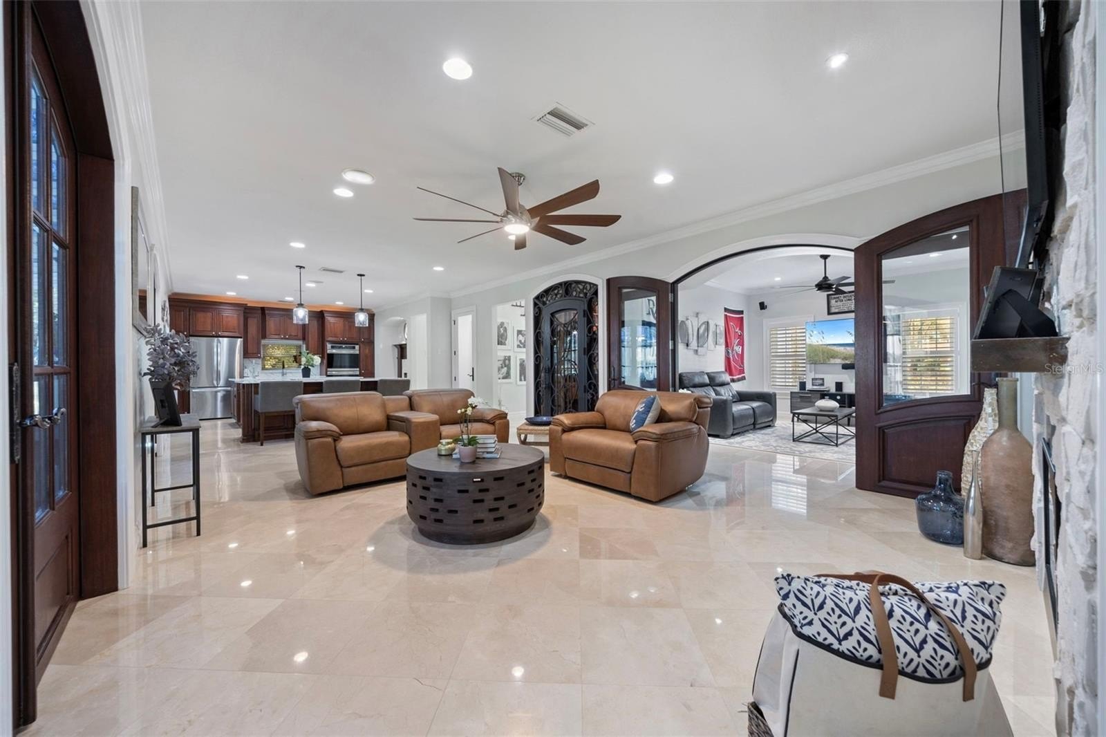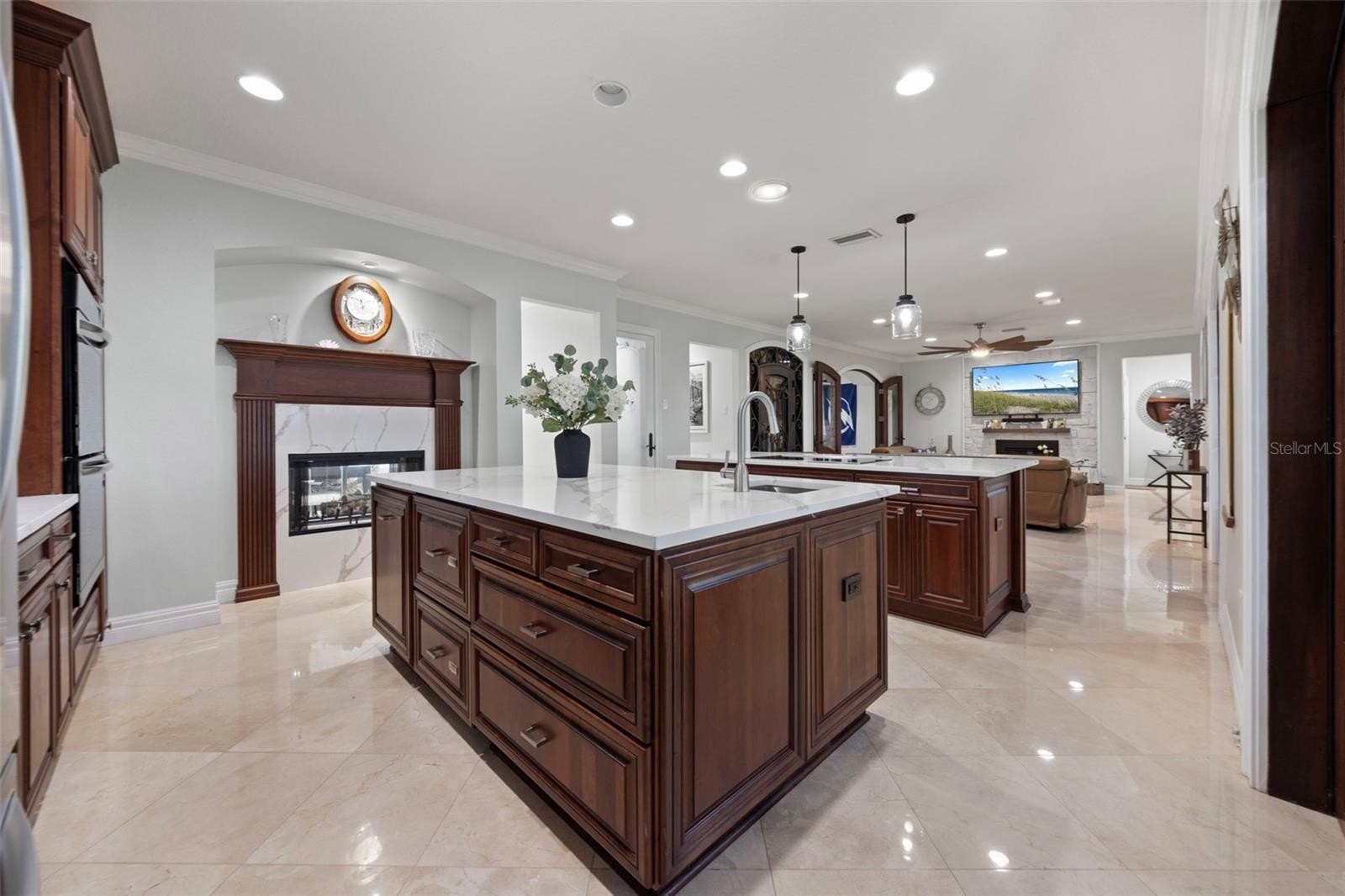 Designed for entertaining and relaxing alike, the home features a large climate-controlled sunroom with its own dedicated A/C, opening to the backyard and water beyond. Enjoy multiple fireplaces including two electric fireplaces and a double-sided wood-burning fireplace between the kitchen and dining room, creating a warm and inviting ambiance.