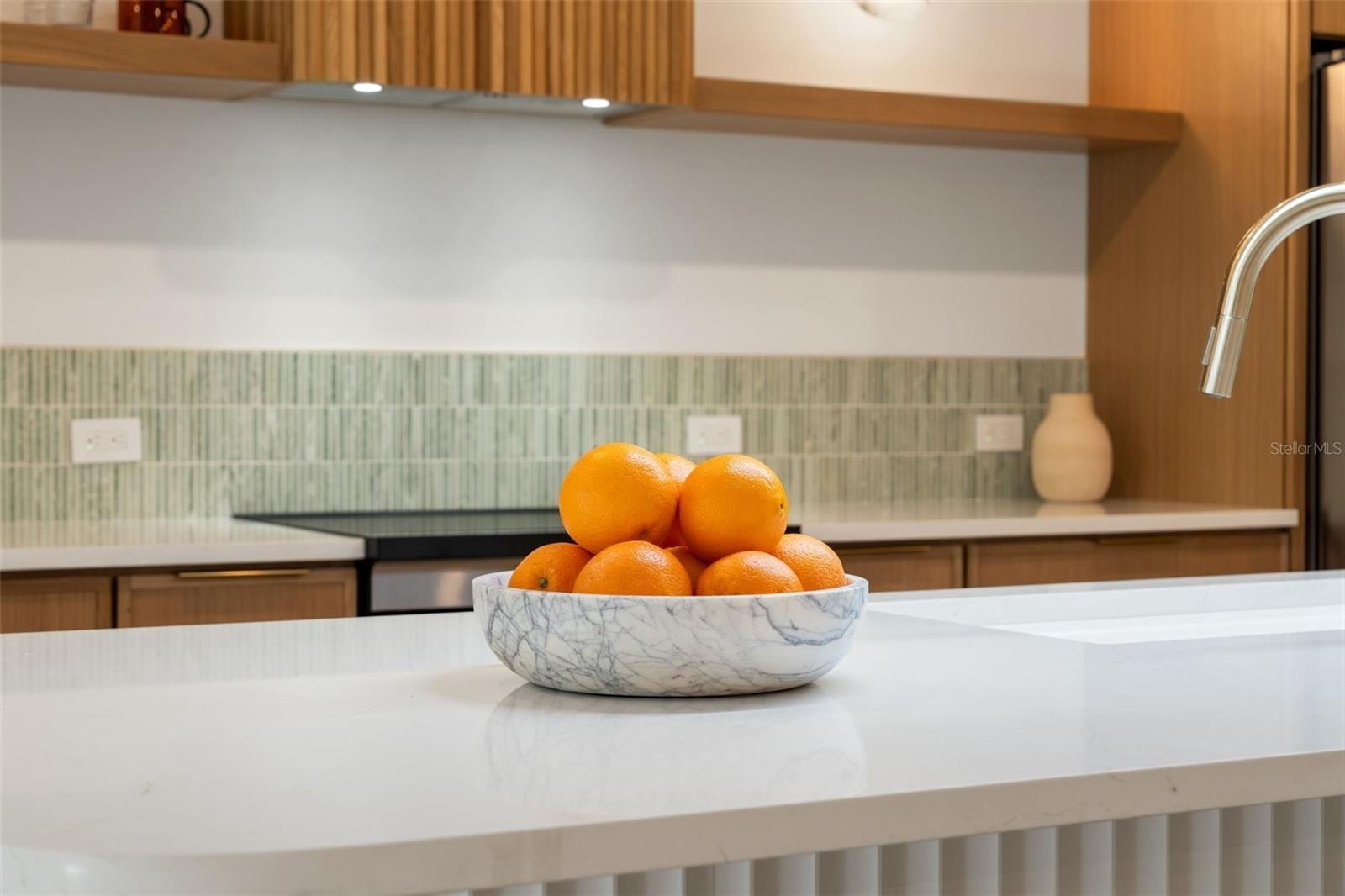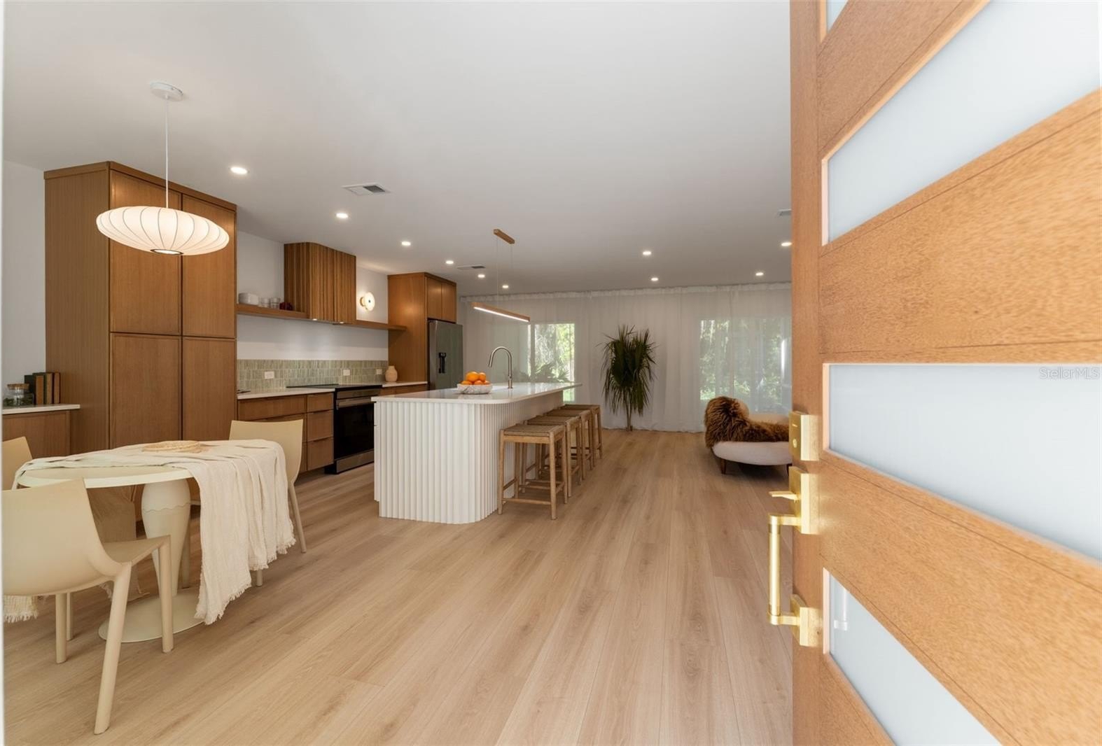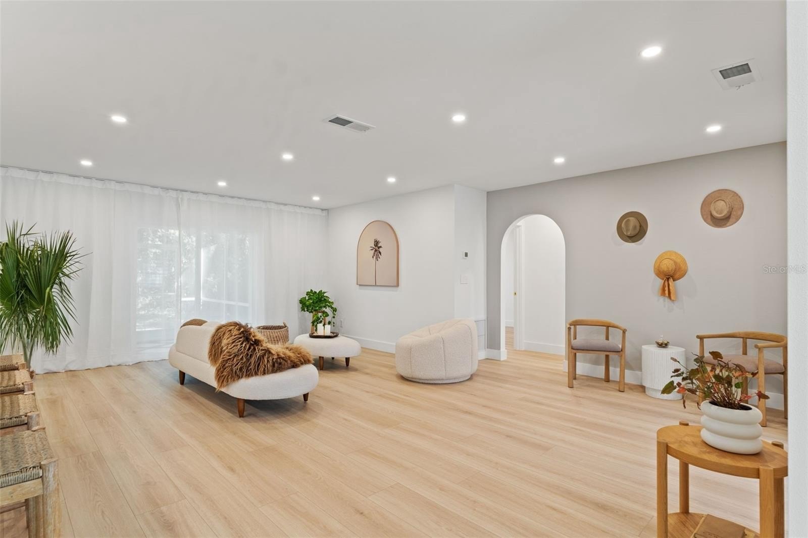 Calm Contemporary Design awaits! From intentional curb appeal to a curated interior with immense attention to detail that shows. The front door sets the precedence of what awaits behind; a warm and earthy interior with customization throughout. The large open concept kitchen offers a wall of cabinets, floating shelves, custom designed range hood, custom lighting and a large island featuring quartz counters, a white quartz composite single bowl sink, champagne bronze Kraus faucet and custom fluted island. The space is open allowing for ease of flow and functionality between the breakfast nook, kitchen and living room. Off the kitchen enjoy a devoted office space, library or even an additional bedroom featuring ample natural light and frosted soft close modern metal doors for privacy. The arch entryway leads into the hallway where you will find two bedrooms with a full bathroom and a linen closet. The hall bath offers a soft minimalistic look with custom floating vanity, Kohler bathtub, shower glass and wall and Delta champagne bronze fixtures. On the opposite side the second archway leads into the primary suite full of natural light and ample closet space. The primary bathroom continues the minimalist, soft-toned design with large-format tile, a custom floating vanity with double vessel sinks, champagne bronze fixtures, and a curbless shower featuring a lighted niche and fluted glass enclosure. Additionally, under-cabinet lighting adds a warm, ambient glow, enhancing the home’s serene and sophisticated design. Enjoy the serene backyard with no rear neighbors, offering a private and peaceful setting. The covered and newly screened patio will be your oasis for morning coffee or relaxing evenings, beautifully finished with tile and turf flooring. Location is ideal walking distance to elementary school, Whole Foods and Aldi are down the street along with all other shopping in the area and dining, local coffee shops are a skip away, close access to the Veterans makes it an ideal quick connection to Tampa International Airport or downtown Tampa.