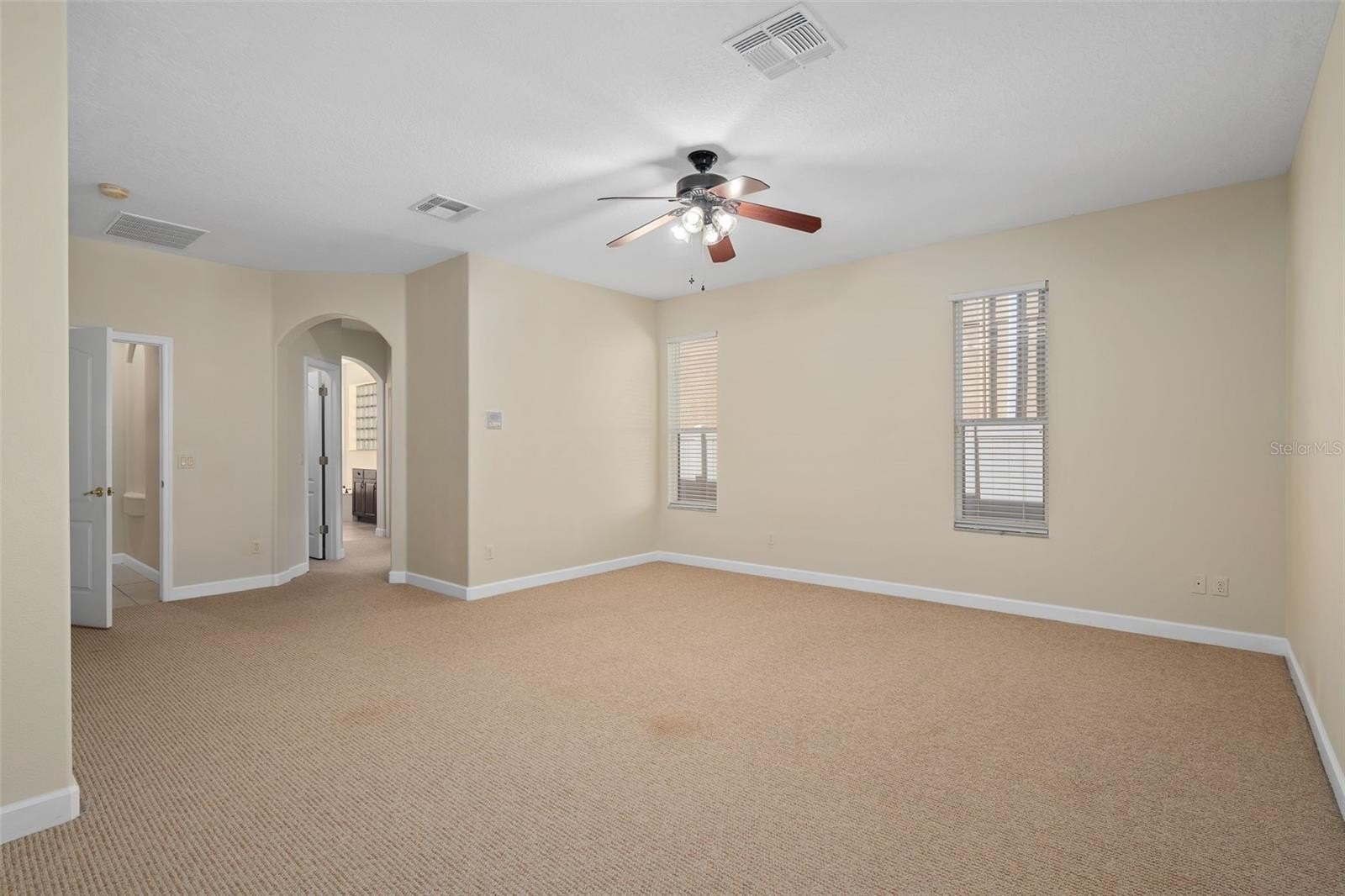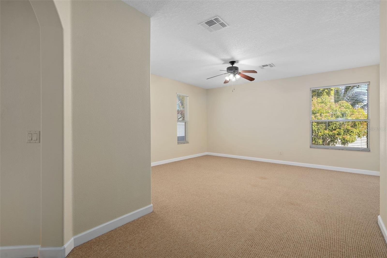 Inside, the home is open, airy, and filled with natural light. A neutral color palette, crown molding, and elegant arches create a timeless and inviting atmosphere. The versatile floor plan includes split formal living and dining spaces, a main-floor primary suite, and a large second-floor bonus area.