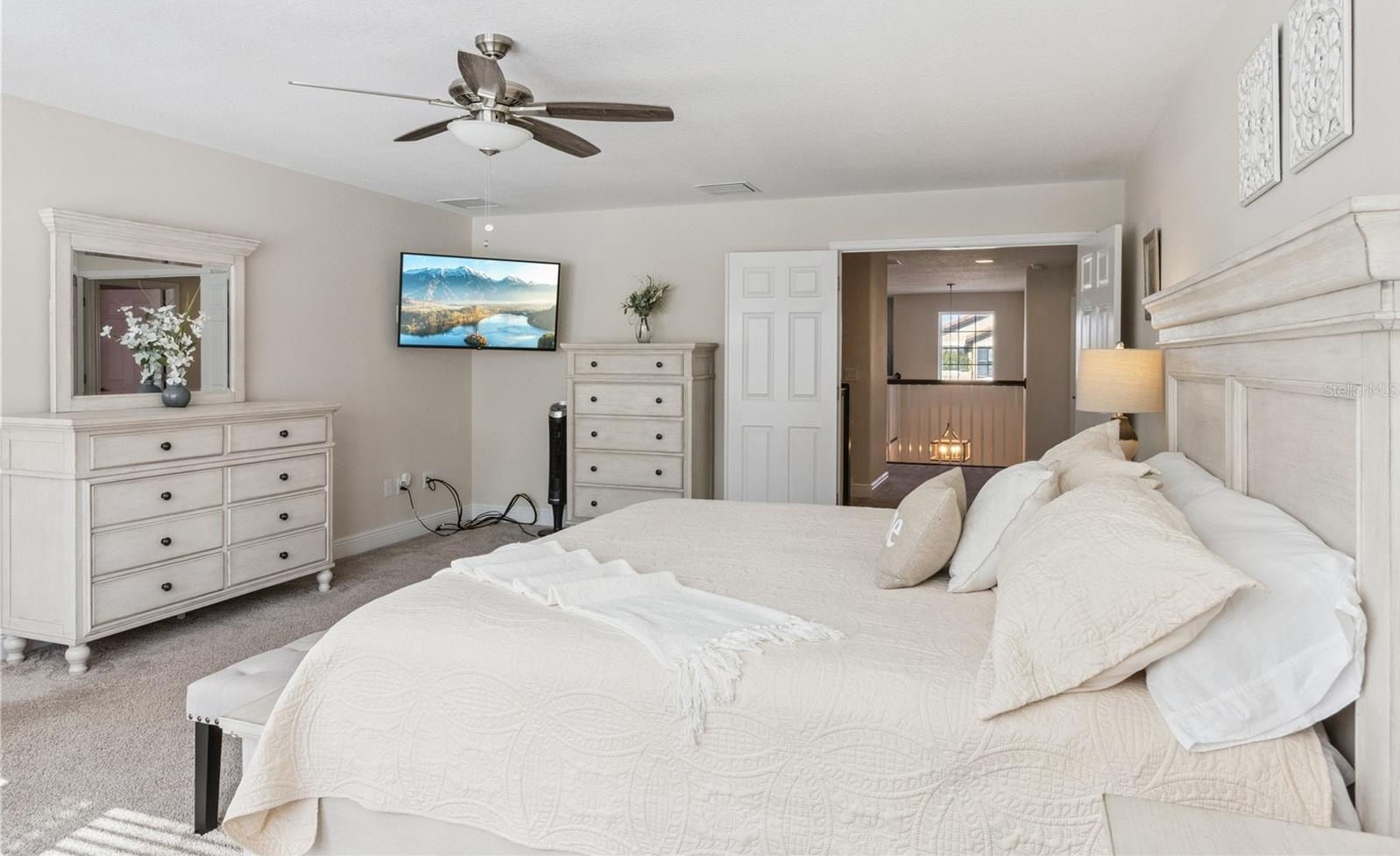 The downstairs primary retreat features a spa-inspired en suite with a large tiled walk-in shower, dual vanities, makeup vanity, and oversized walk-in closet. The upstairs primary suite impresses with double entry doors and a spa-like en suite offering a soaking tub, separate shower stall, makeup vanity, and generous walk-in closet.