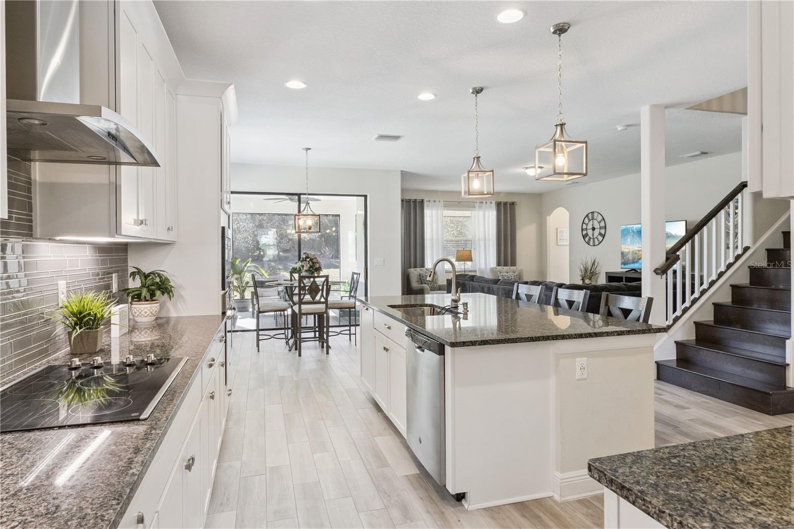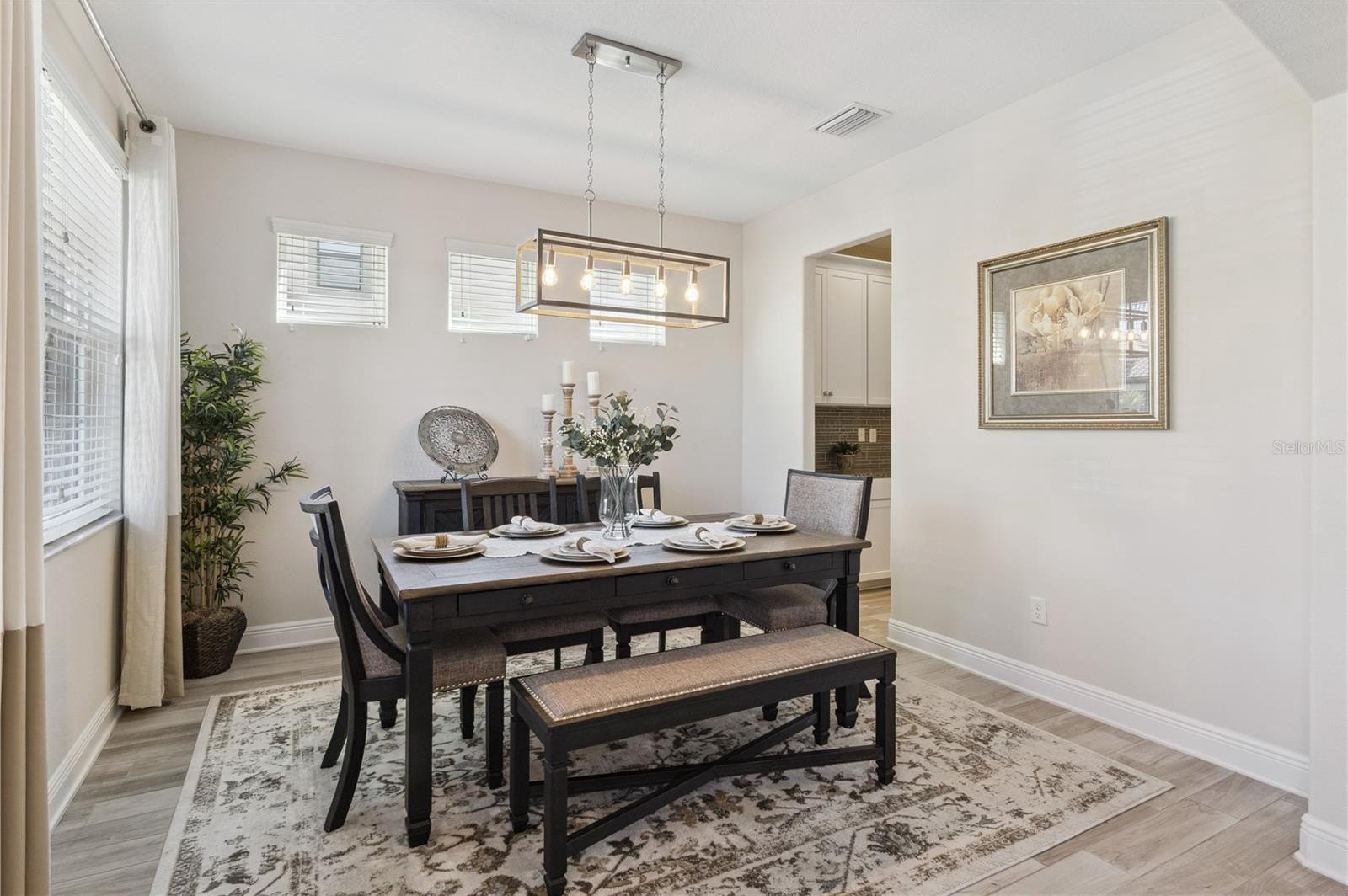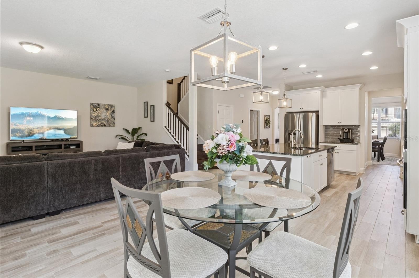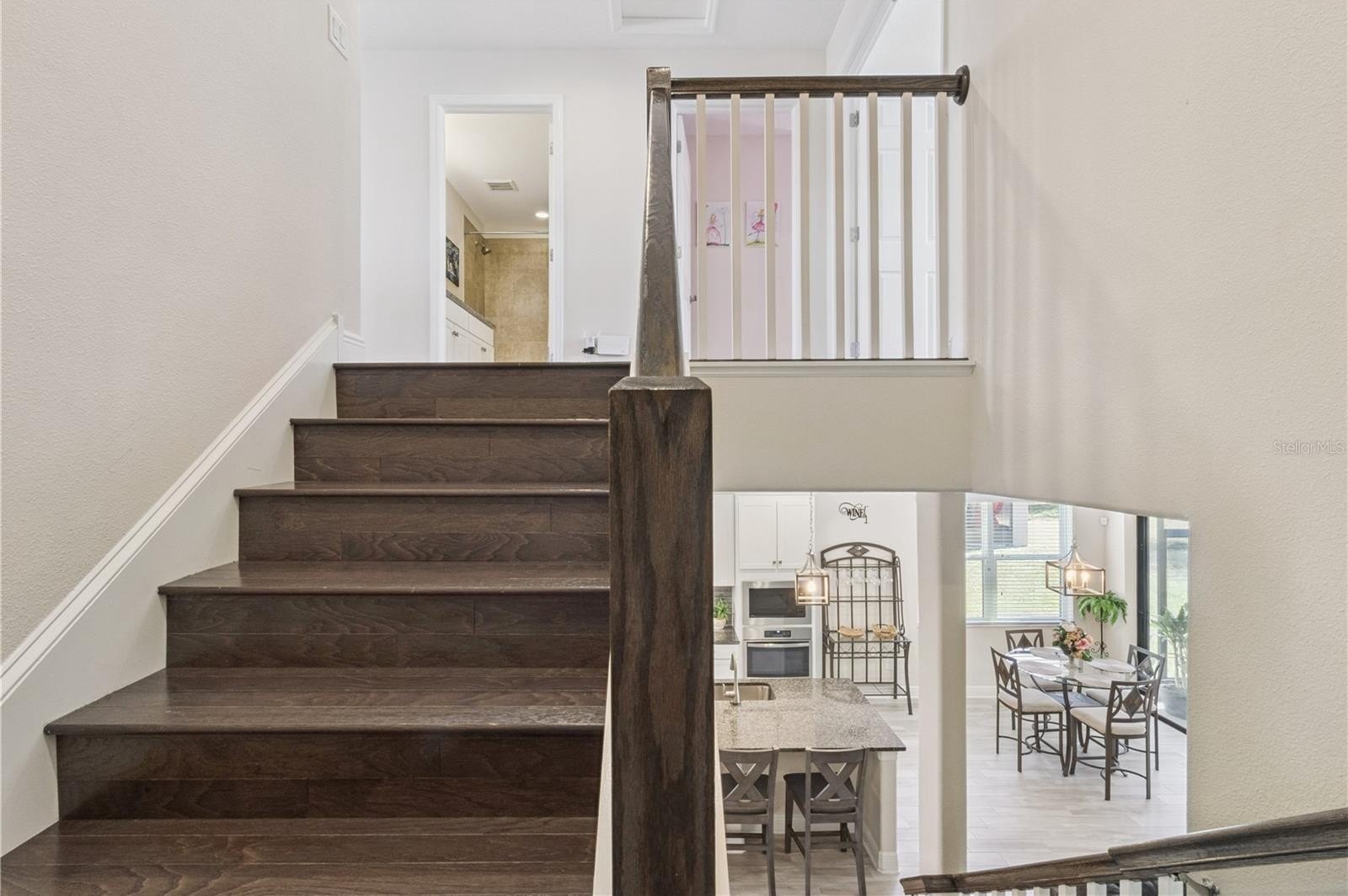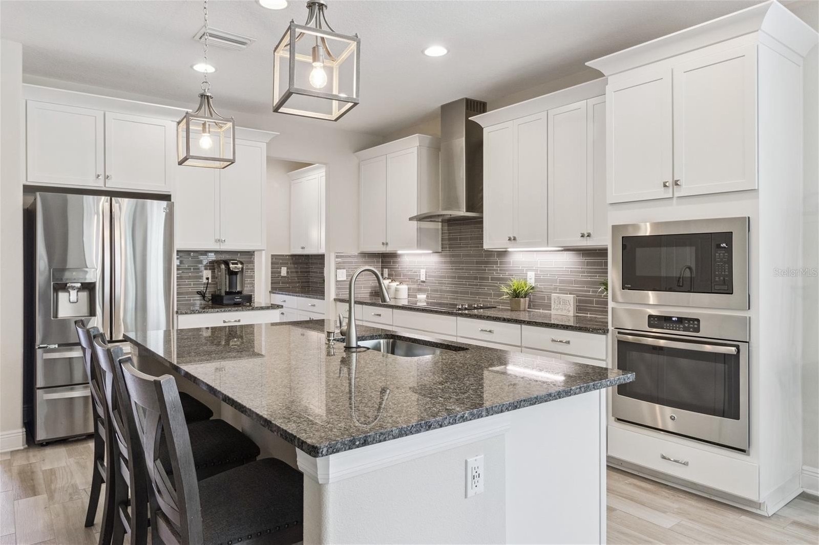 The chef’s kitchen is beautifully appointed with crown-molded cabinetry, hood vent, convection oven, a dedicated butler’s area, and an expansive walk-in pantry. Wood-look tile flows through the main living areas, complemented by designer lighting, solid wood stairs, and elegant wood railings.