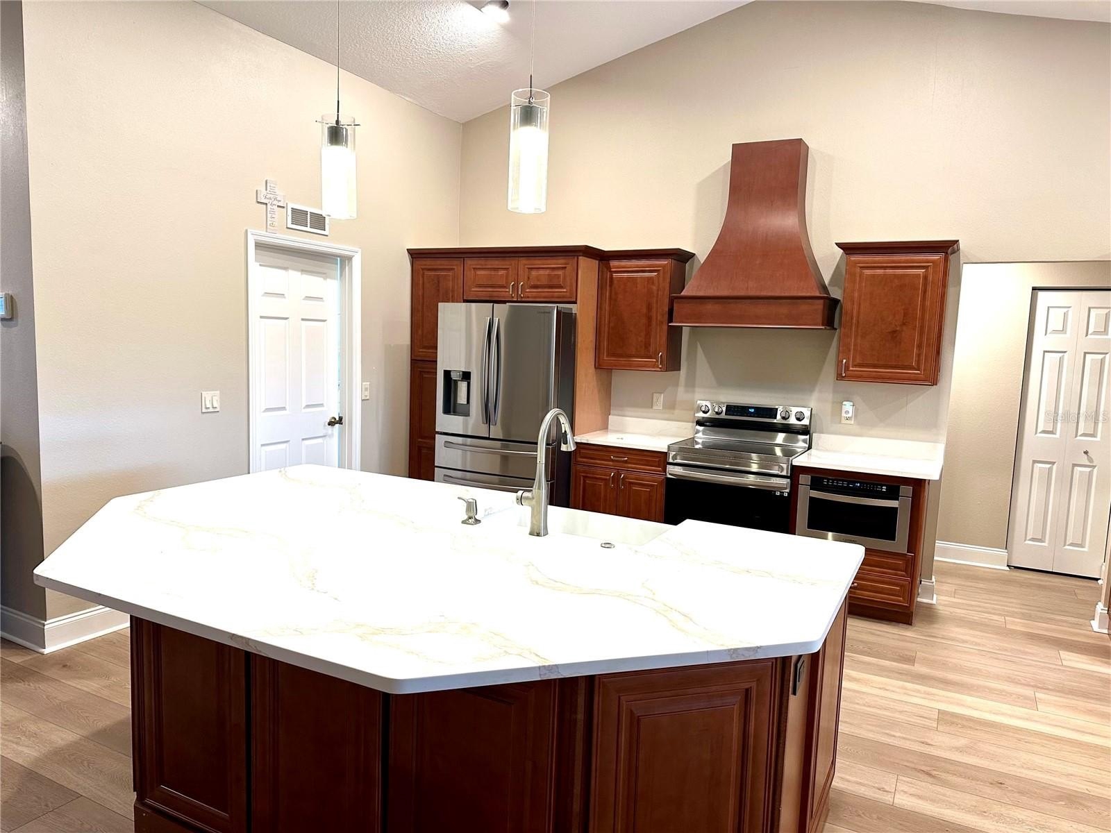 BACK ON THE MARKET after the completion of a FABULOUS full home renovation! This absolutely stunning GOLF COURSE home with SPECTACULAR VIEWS is a MUST SEE located in beautiful STONECREST, a 55+ active golf community. This rare one of a kind floor plan features 3 bedrooms and 2 full baths with a expansive GREAT ROOM, cathedral ceiling, oversized island kitchen with quartz countertops, upgraded stainless appliance, new fixtures and solid wood cabinetry as well as fantastic eat in area overlooking the golf course. The PRIMARY SUITE has amazing golf course views and a sliding door leading to your lanai with two separate custom closets and a stunning completely renovated bathroom with walk-in shower, two vanities, separate bathtub and water closet. This home offers a split floor plan with bedrooms 2 and 3 on the opposite side on the home with fully renovated bathroom. The NEW commercial grade luxury vinyl flooring is absolutely stunning and runs seamlessly through the entire home.