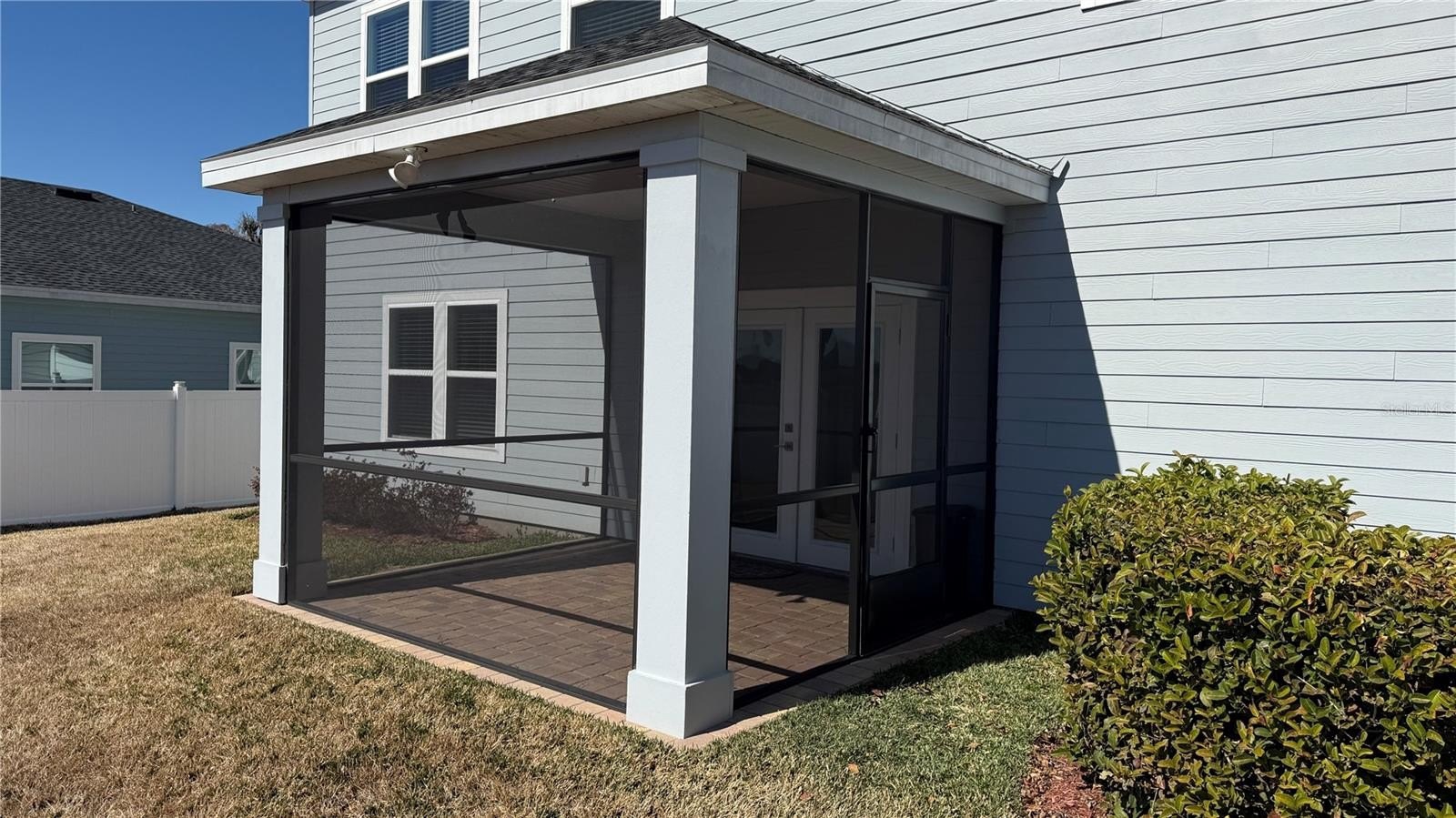 This home includes Lennar’s sought-after Classic Series upgrades, showcasing wood-look tile flooring, crown molding in the kitchen, paver accents, blinds throughout, and a covered and screened-in lanai. French doors from the dining area lead seamlessly outdoors, where custom pavers extend the living space and create a perfect setting for morning coffee or evening relaxation.