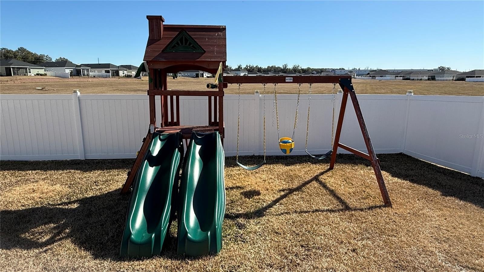 The fully fenced backyard offers privacy and peace of mind with a 6-foot vinyl fence topped with lighted caps. A built-in playset is already in place, making this backyard ideal for energetic children or future outdoor fun—with plenty of room to personalize the space.