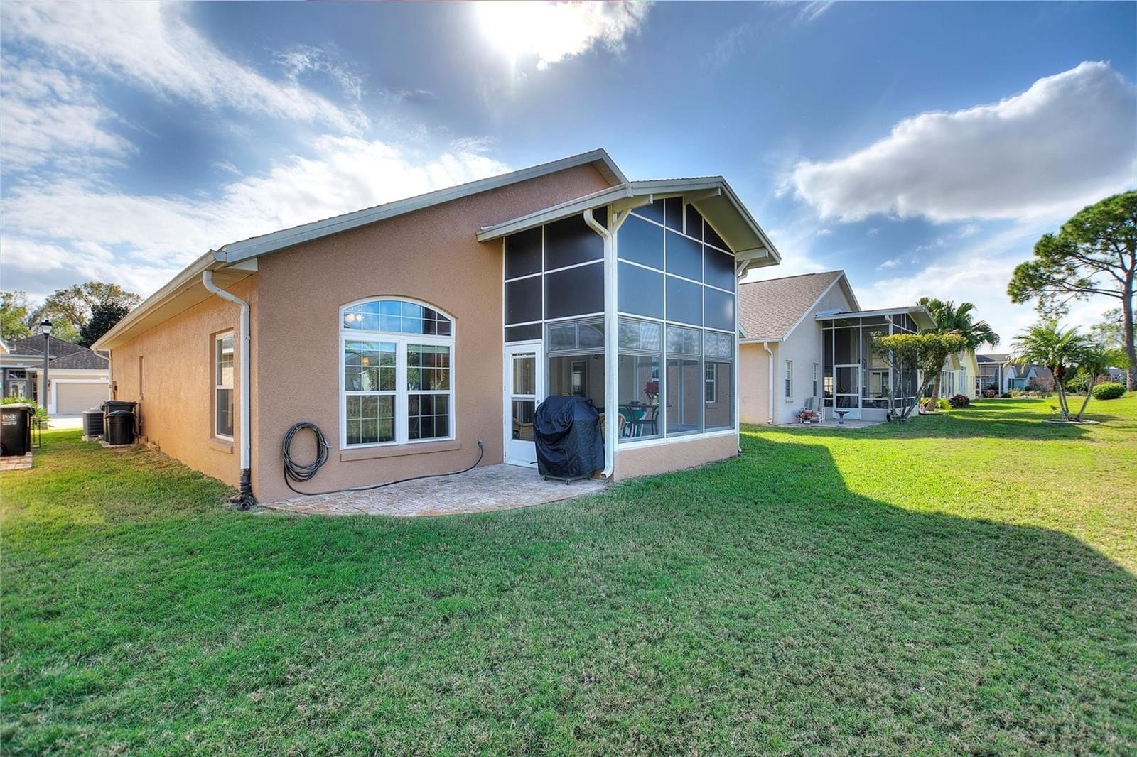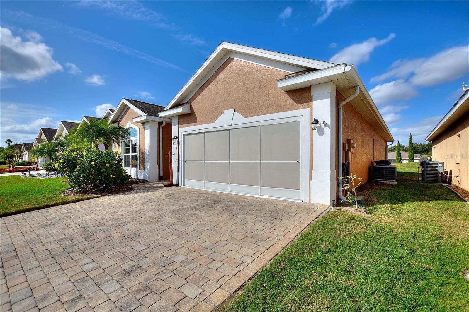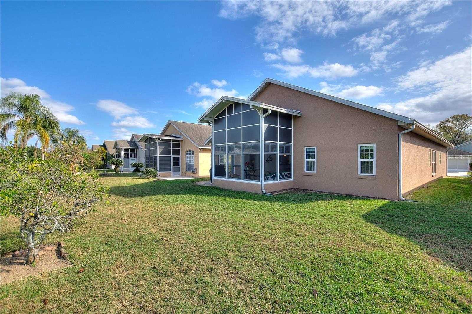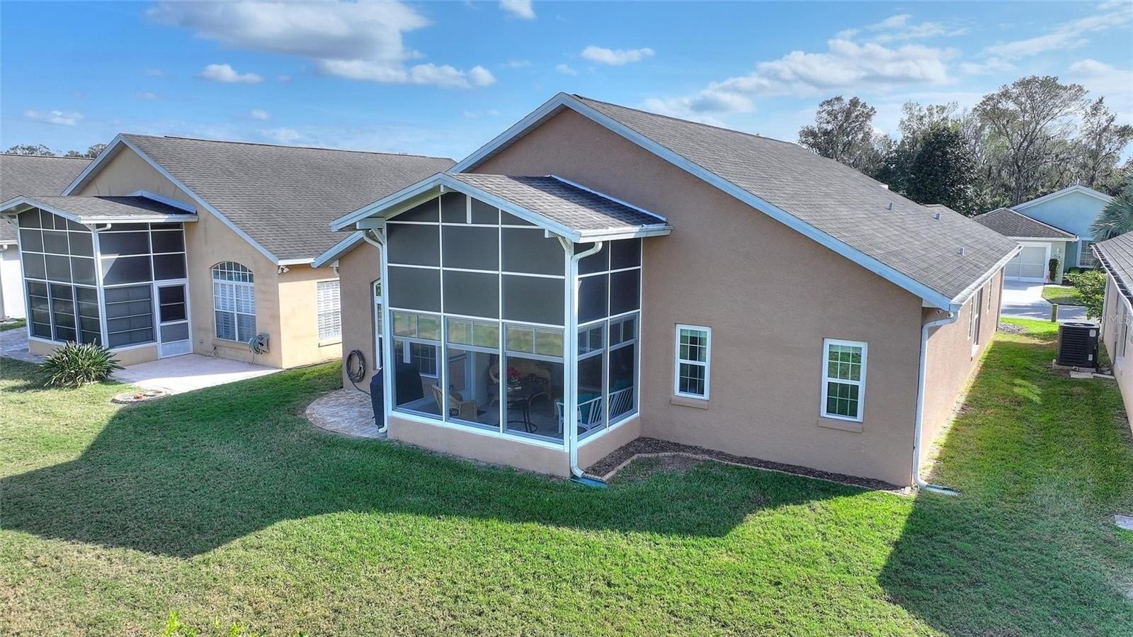 One or more photo(s) has been virtually staged. The Favorite RidgeDale 2/2/Den model with 190 SF North-Facing Covered Lanai with telescoping windows over screens, adjacent brick paver patio and no rear neighbors! Located just 0.2 miles from the High Vista 55+ private clubhouse and amenity center, the home has replacement windows, a remodeled primary en-suite bathroom and expanded brick paver driveway and walkway to front door. 12 FT ceiling in central Great Room with a wall of patio doors to lanai. Eat-in kitchen has stainless-steel appliances, Corian countertops, roll-out drawers in lower cabinets, built-in desk, breakfast bar with pendant lighting, vaulted ceiling, closet pantry and broom closet. Cathedral ceiling in primary bedroom with walk-in & linen closets. Split bedroom design offers a private guest area with adjacent full bath and linen closet in front of house. Den with plantation blinds is nestled between bedrooms. Corridor laundry room to garage has cabinets over the washer & dryer, utility sink and storage closet. Extra refrigerator in garage with sliding screen doors, 2 ceiling fans, storage cabinets and pegboard, pull-down ladder access to attic and keypad entry. Select furnishings available for sale separately. Sold As-Is. $230 monthly High Vista HOA fee includes Spectrum internet and basic cable TV with 2 cable boxes, lawn mowing and exclusive access to resident-owned 12,000 SF private High Vista clubhouse and amenities. $425 semi-annual Ridgewood Lakes HOA fee provides 24x7 staffed security gate and master association-owned private road maintenance. Adjacent to 18-hole White Heron Golf Club with The Nest restaurant, privately owned and open to the public. High Vista is a 55+ community with outdoor heated pool and spa, fitness center, library, pub & many organized activities. Pickle ball, tennis, bocce and shuffleboard courts. Miles of biking and walking trails within Ridgewood Lakes gated community. Shopping, Disney, Universal, Orlando & Central FL entertainment nearby, easy access to I-4, medical facilities, airports & Sunrail Station. Advent Health hospital is 3 miles away.