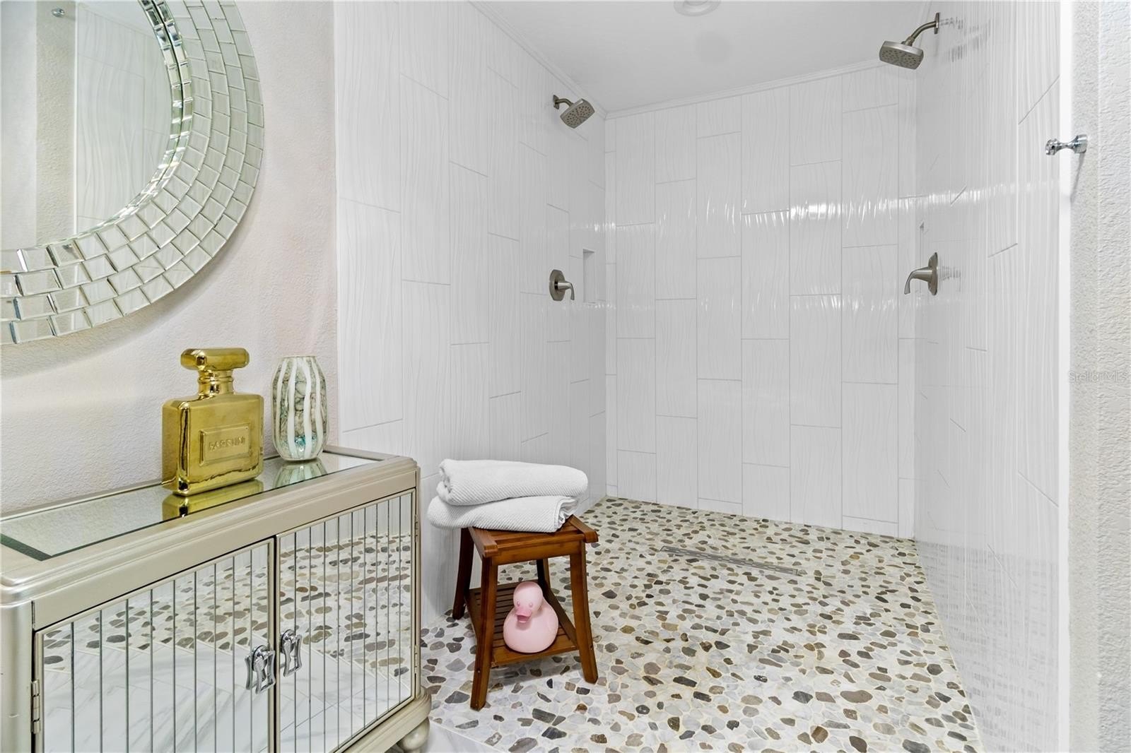 Outside is where this home really shows off with amenities including a heated saltwater pool / lap pool with markers on the bottom, lighting and water features, added style with a surfboard outdoor shower, screened in with panoramic panels because this view deserves center stage. The outdoor summer kitchen is outfitted with a refrigerator, table top ice chest, bar area, and a grill supplied by a 99-gallon propane tank, making it well-suited for entertaining all year round.