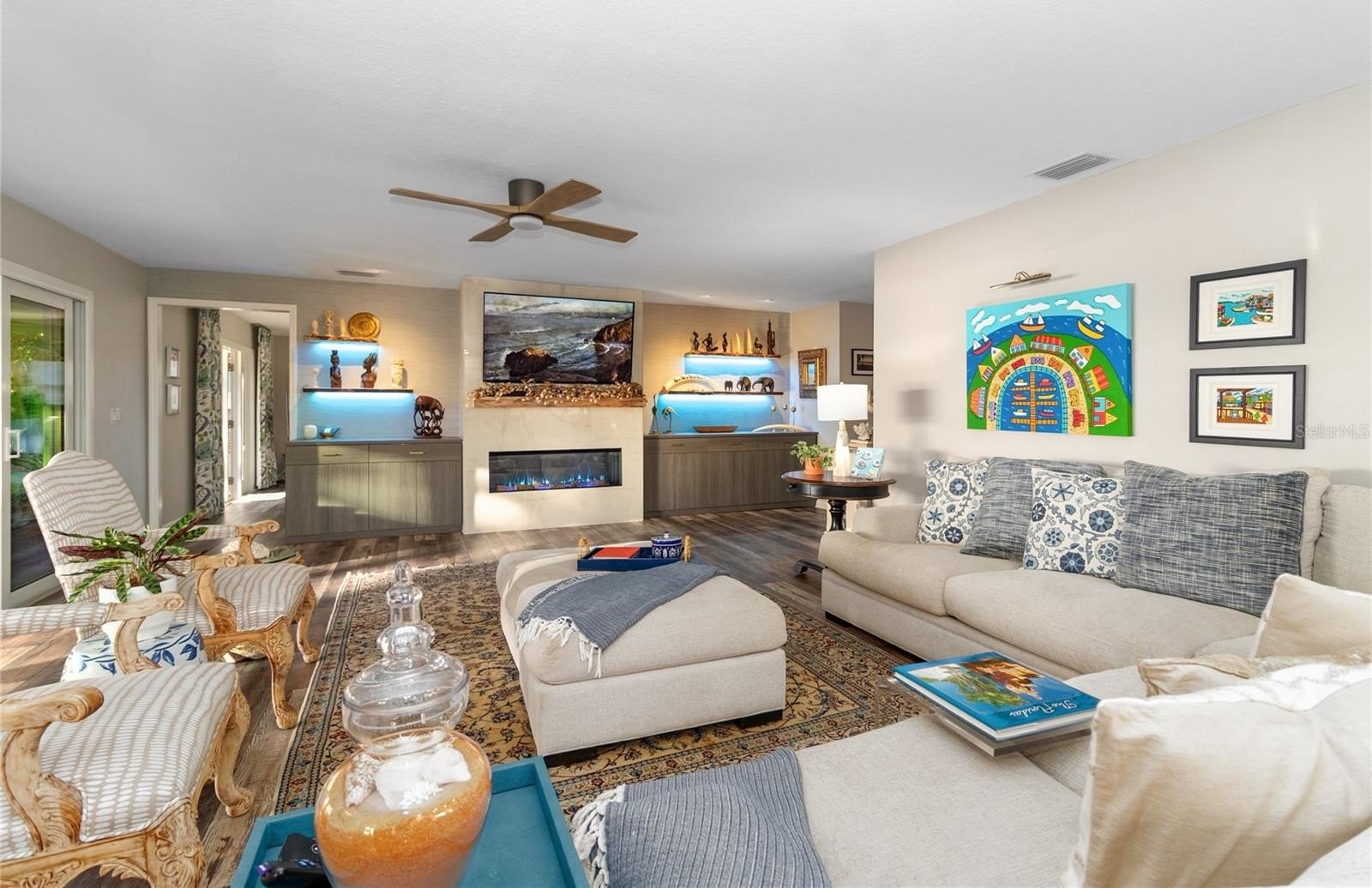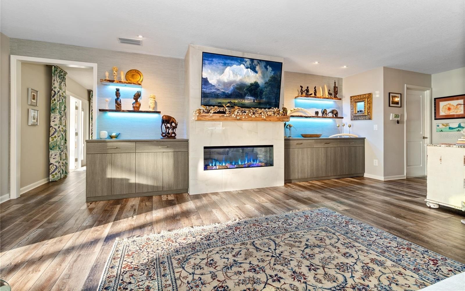 Inside, the vibe continues with an electric fireplace with customizable lighting (because ambiance matters). Live-edge floating shelves with integrated lighting adds a designer touch. Double-pane replacement windows, custom drapes, California Closets, luxury vinyl and ceramic tile throughout, laundry closet for added convenience. The kitchen brings the function and the flair with an island, generous storage, new cabinetry, quartz countertops, a natural gas range with hood ventilation, along with a built in microwave, electric oven, and refrigerator/freezer.