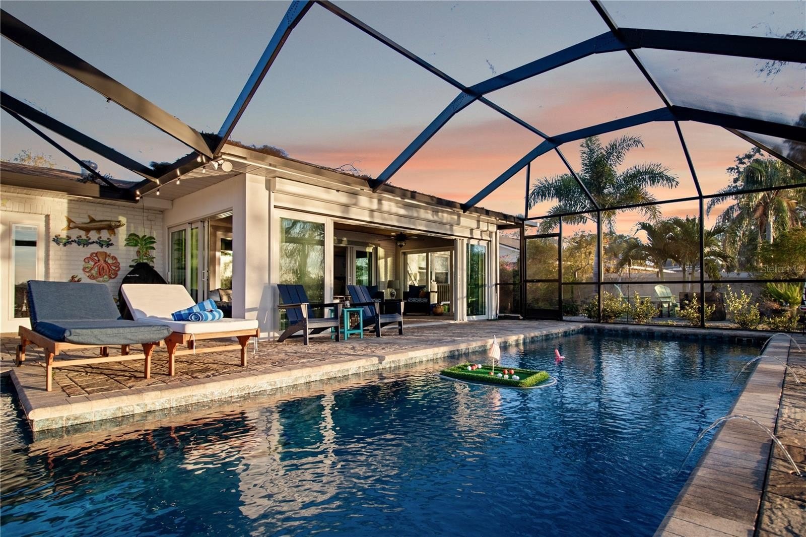 The lanai is glassed in with cedar tongue and groove ceiling wrapped with motorized retractable sunshades, while enhanced landscape lighting and mature palm trees set the tropical tone. Additional exterior upgrades include a composite dock, fenced in yard, seamless gutters with leaf filters, and recently replaced garage and front entry doors.