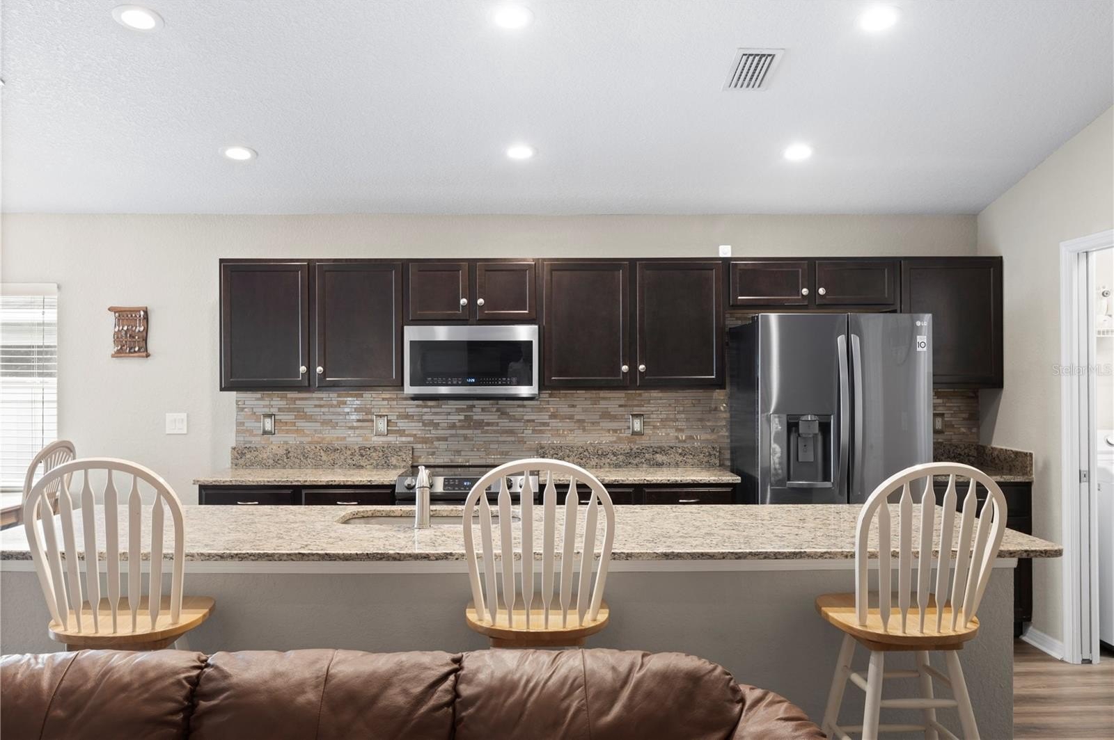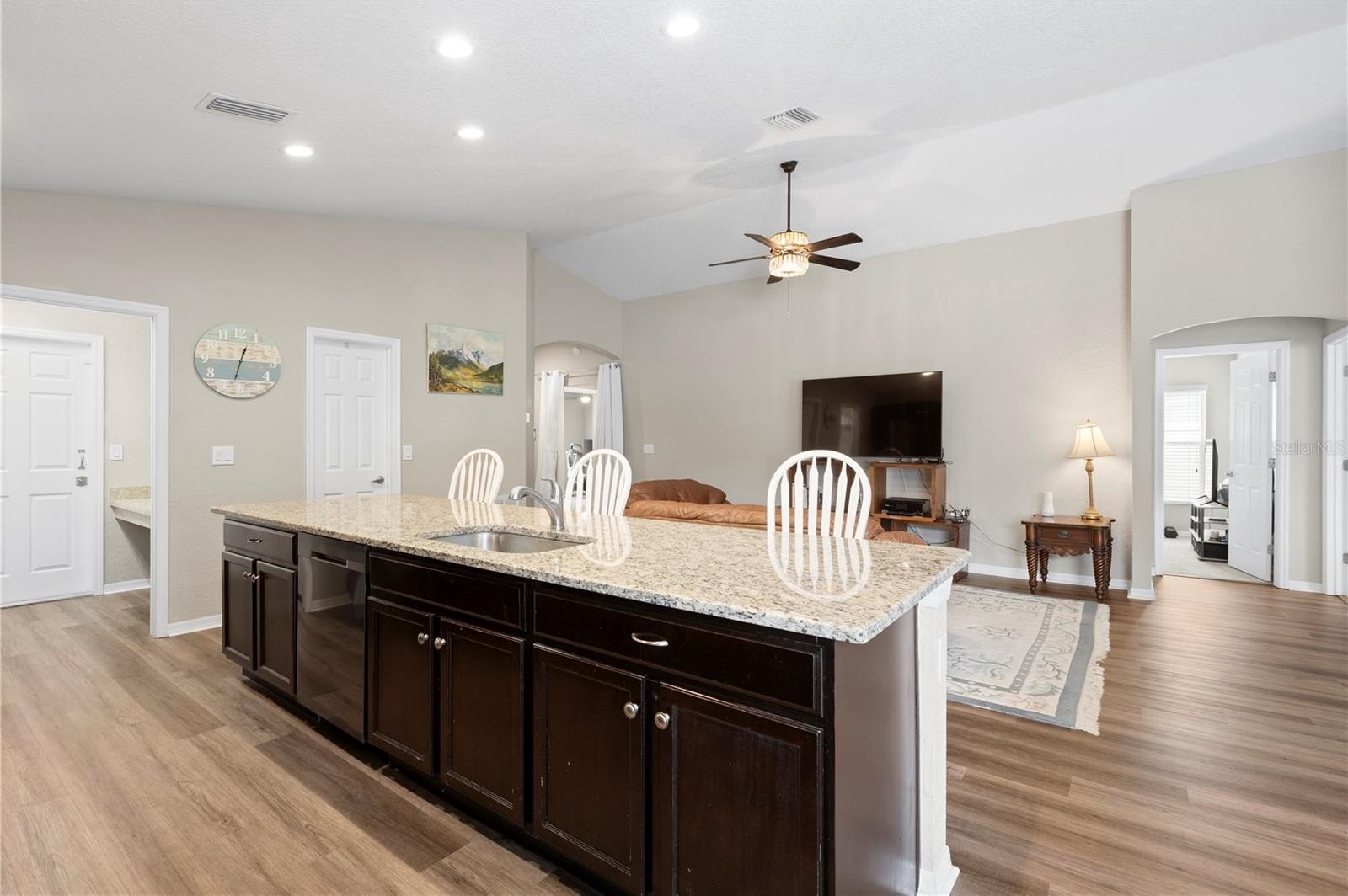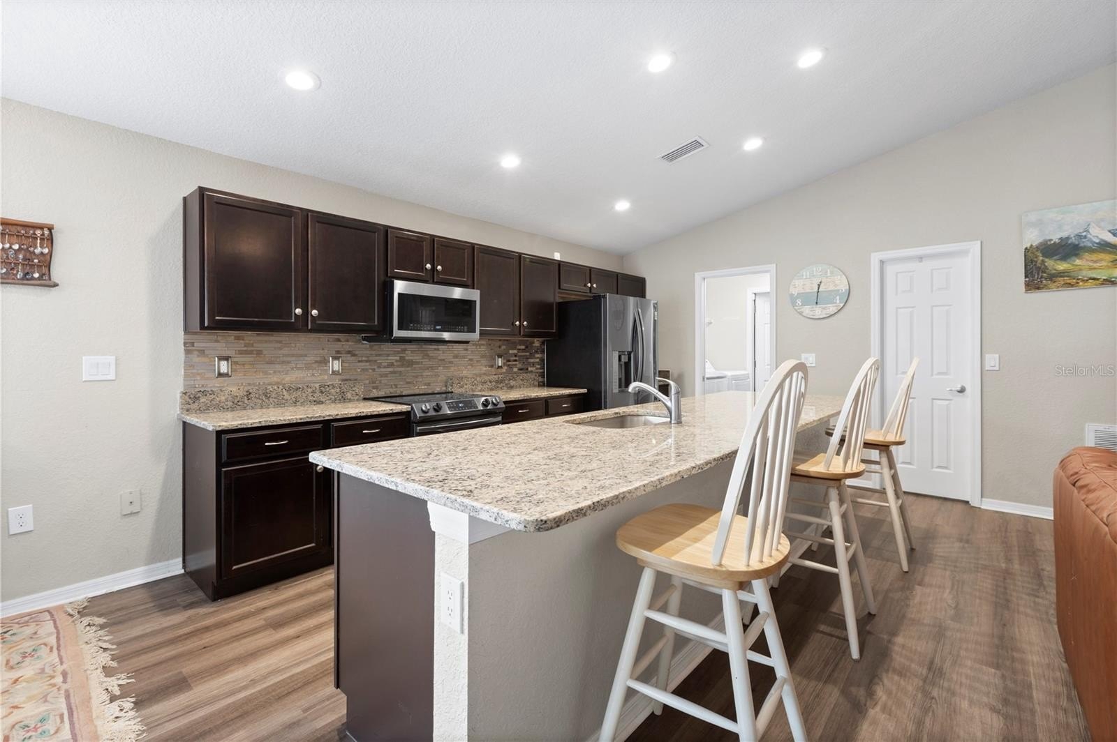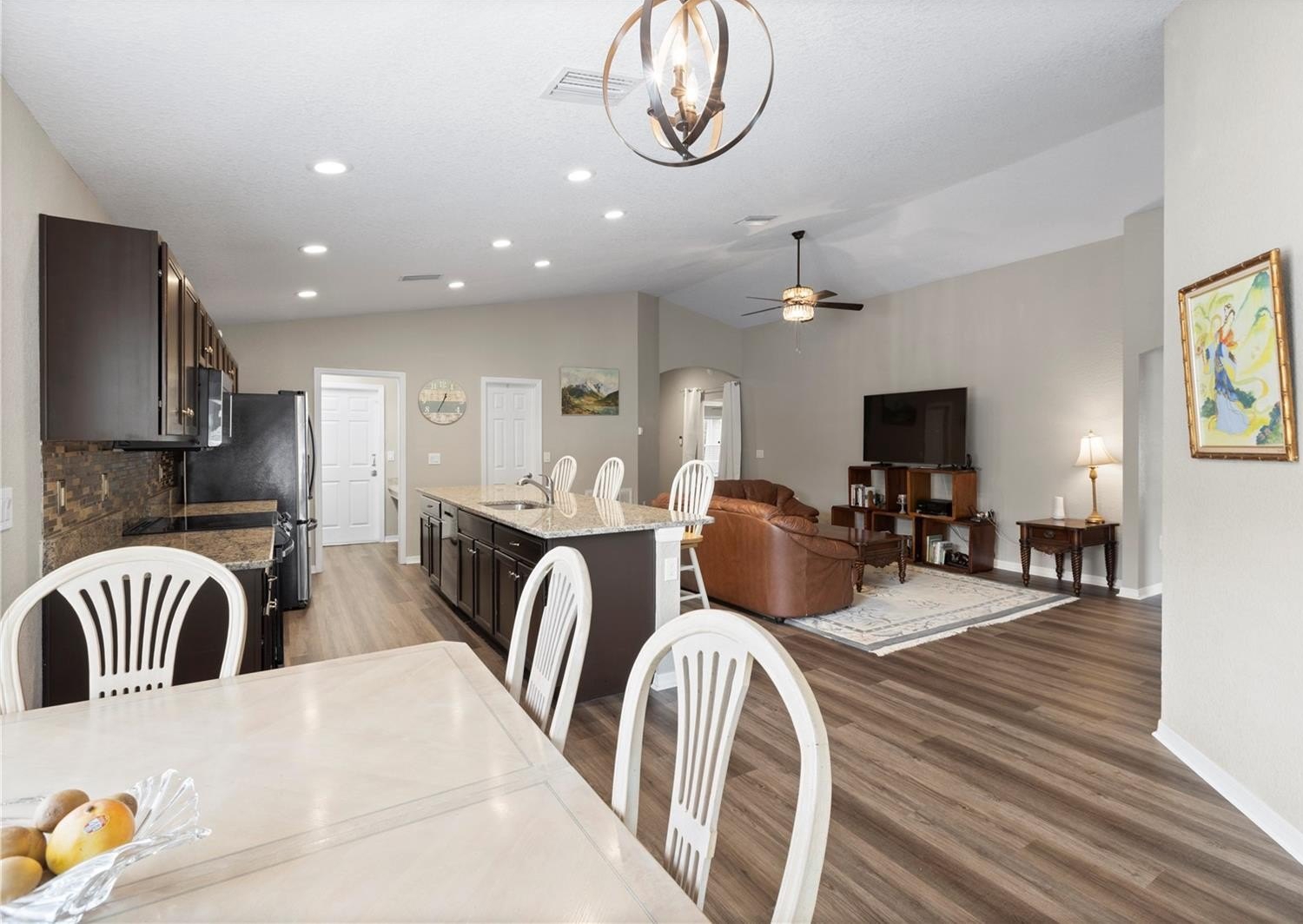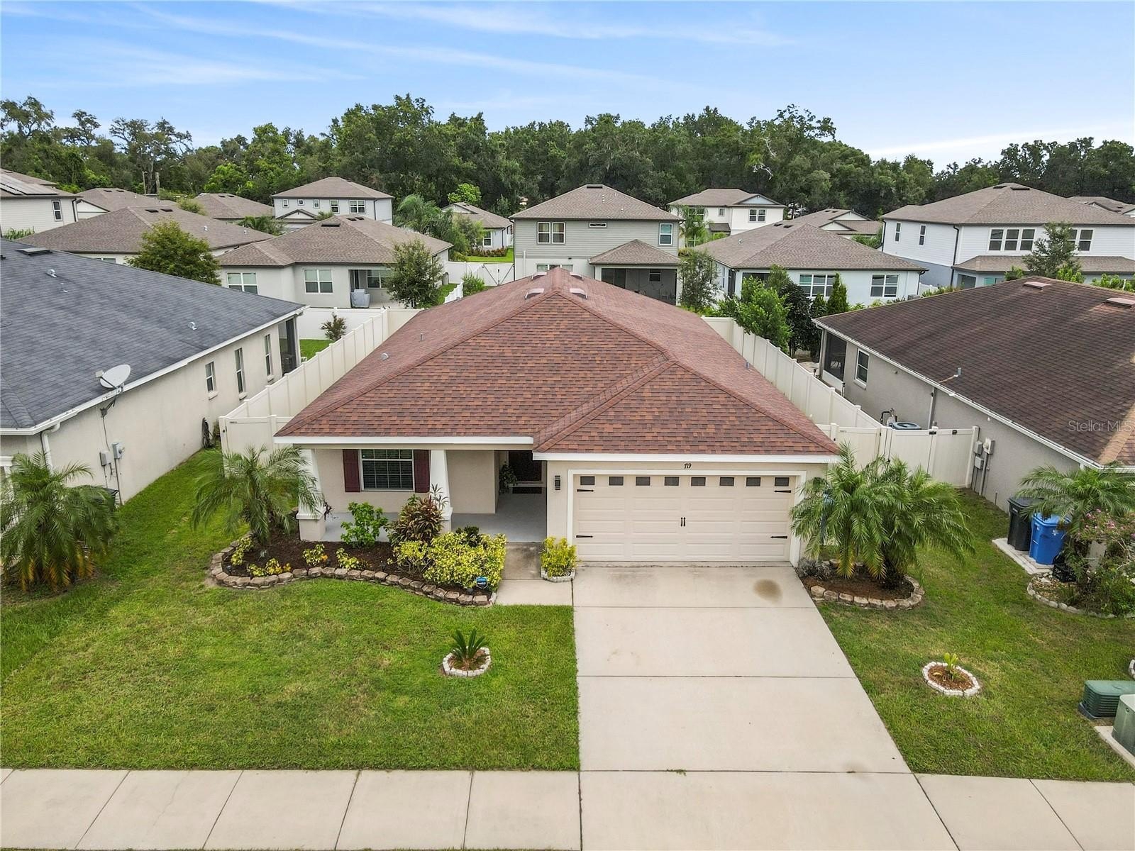Welcome to this stunning 2018-built single-story home in the highly desirable Vineyard Reserve community. With 4 bedrooms, 2 bathrooms, and a thoughtfully designed split floor plan, this property has been refreshed and upgraded to feel brand new. As you step inside, you’re greeted by a foyer that flows into the open-concept kitchen, dining, and living area. Vaulted ceilings and abundant natural light from the windows and glass sliding doors create a bright and spacious atmosphere, perfect for everyday living and entertaining. The home has just been painted on the interior and features brand new luxury vinyl plank flooring in the main living areas, giving it a fresh, modern feel. The kitchen is the centerpiece of the home, featuring an oversized granite island with a breakfast bar, espresso cabinets, stainless steel appliances, new granite counters, and a walk-in pantry. Just off the kitchen, you’ll find the laundry room with direct access to the 2-car garage. The primary suite is a true retreat with a large walk-in closet and an en suite bathroom boasting dual sinks, a walk-in shower, a garden soaking tub, and a private water closet. Bedroom 2 sits nearby, while bedrooms 3 and 4 are accessible from the main hallway, sharing a full bathroom with a tub/shower combo. Outside, enjoy Florida living on the covered and screened lanai overlooking the fully fenced backyard, complete with a cozy outdoor fireplace and a Tuff Shed for extra storage. Conveniently located near I-4, I-75, and US-92, this home offers an easy commute to downtown Tampa and is surrounded by shopping, dining, and schools. With low HOA fees and no CDD fees, Vineyard Reserve is the perfect place to call home.