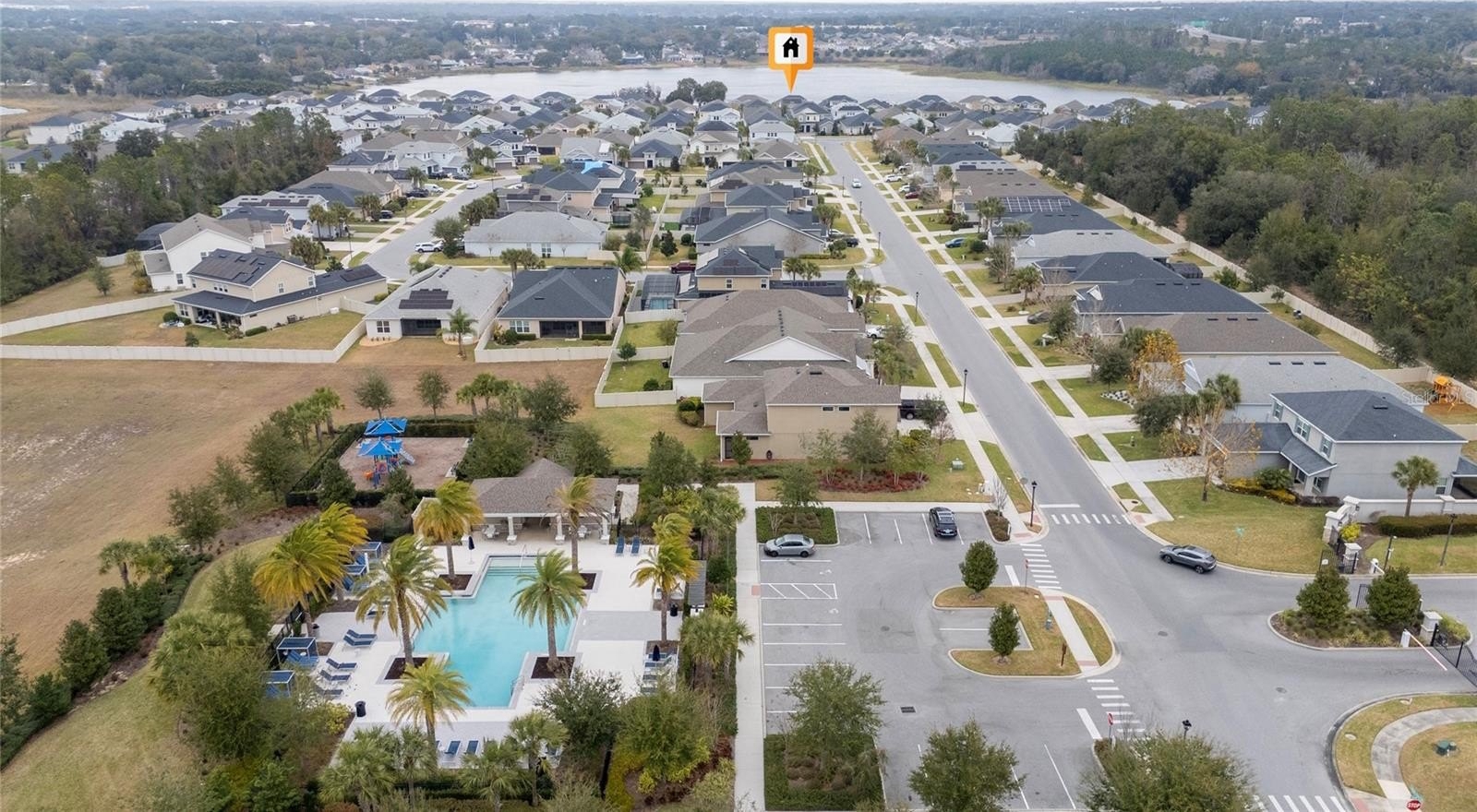The residence features 4 bedrooms, 3.5 bathrooms, and approximately 2,713 square feet of thoughtfully designed living space, ideal for both everyday comfort and entertaining. The primary suite serves as a private retreat, complete with a spa-inspired bathroom featuring a soaking tub and a dual-head walk-in shower. A welcoming entryway opens to expansive living and dining areas, accented by refined crown molding throughout the home. At the heart of the home is the elegant Café-style chef’s kitchen, showcasing a top-of-the-line gas range with a fully vented hood, farmhouse sink, Bosch refrigerator, upgraded backsplash, and a custom center island—perfect for gatherings large and small. The open-concept layout flows seamlessly to triple sliding glass doors that lead to an extended covered lanai, where elevated lake views create an exceptional backdrop for relaxation and outdoor entertaining. The lanai is prepped with gas, water, and electrical connections for a future outdoor kitchen. The property includes a fully fenced backyard and side yards, ideal for pets, play, or outdoor enjoyment. Additional highlights include solar panels for energy efficiency and long-term savings, a high-quality water softening system, an expansive three-car garage with built-in shelving, and a well-appointed laundry room featuring premium appliances and a convenient pet-washing station.