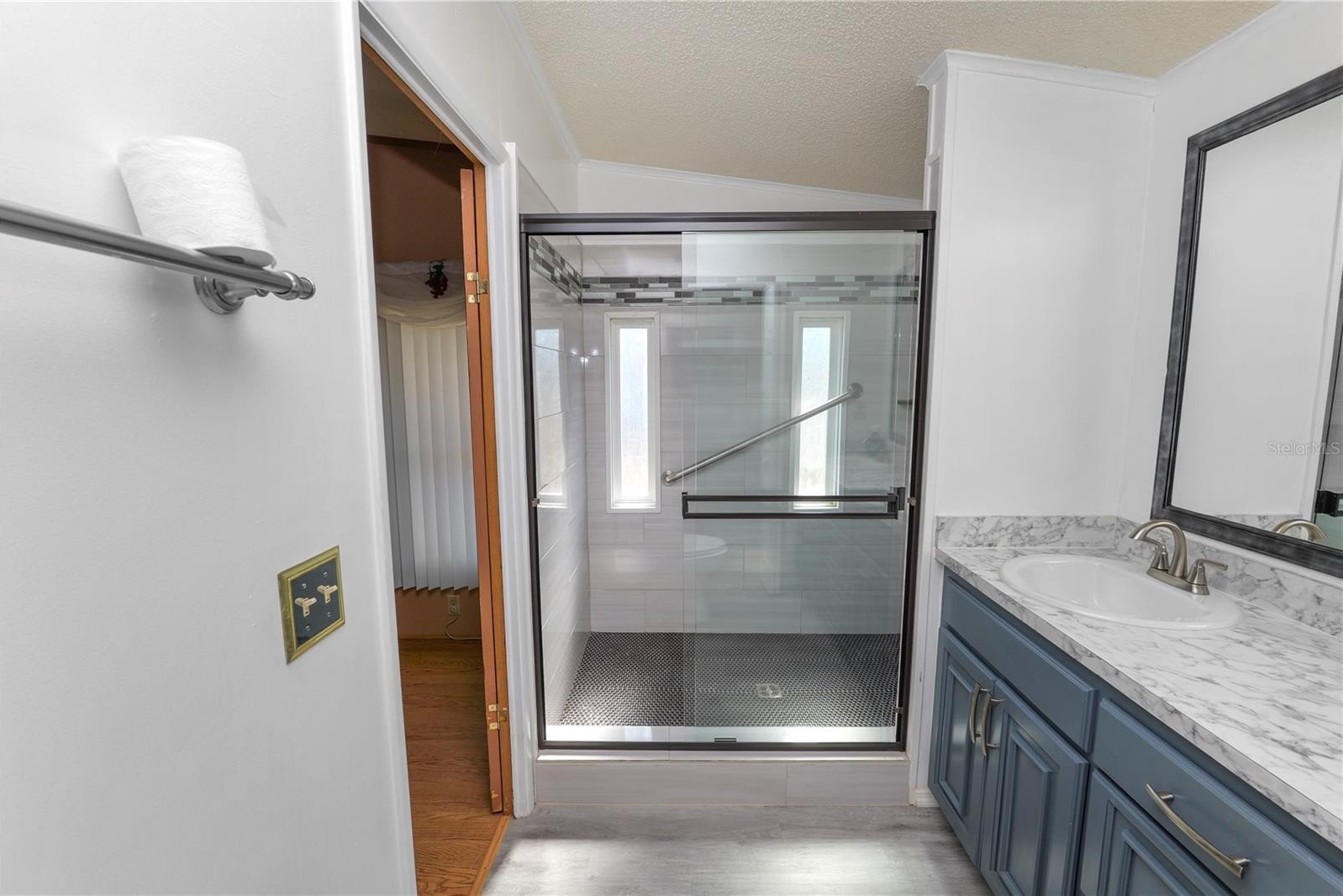 The central living area includes a large bay window and connects to a living room and dining room space with a built-in buffet and an updated galley kitchen featuring stone countertops, ample cabinetry, and a lower eat-in island. The primary bedroom is well sized with a built-in closet and ceiling fan. The updated en suite bath includes dual sinks, stone countertops, tile flooring, a tiled walk-in shower with grab bars, updated lighting, and a linen closet. The second bedroom includes a ceiling fan and built-in closet and is served by an updated guest bath with a tub/shower combination.