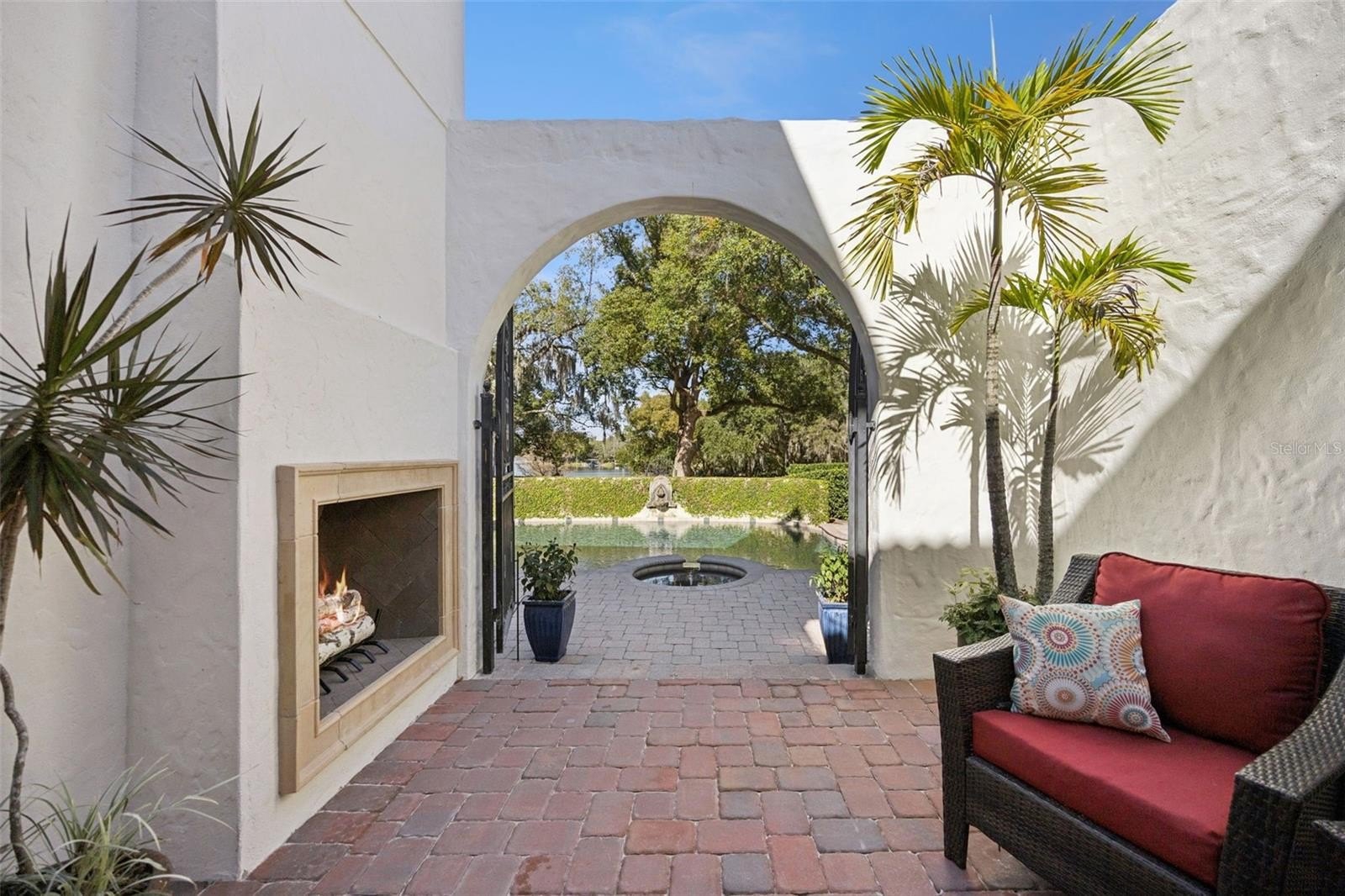 Wraparound double loggias surround a central courtyard with a wood-burning outdoor fireplace and lake views, creating seamless indoor-outdoor living. The lagoon-style pool and spa with wall fountain and programmable LED lighting are set within expansive, professionally landscaped grounds—perfect for relaxing or entertaining.