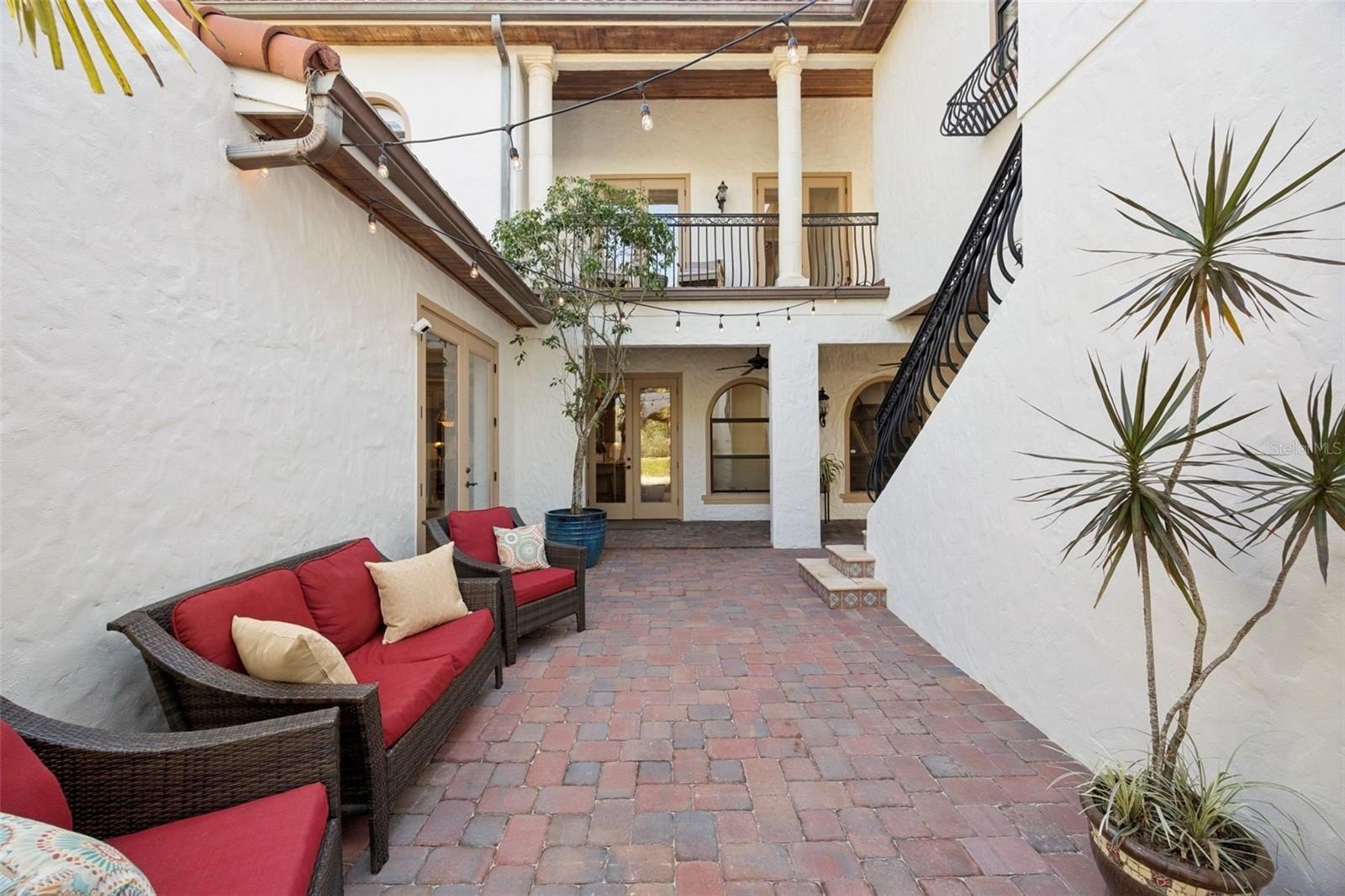 The four-bedroom, four-and-a-half-bath layout plus office is uniquely configured for separate, private bedroom spaces. A ground-floor bedroom connects to the main residence via a covered balcony, ideal for guests, extended family, or live-in support. The second-floor office is also accessed by a loggia and includes a private exterior stairway, offering potential for a home office, studio, or independent suite. The upstairs primary suite provides additional separation and privacy within a three-way split plan.