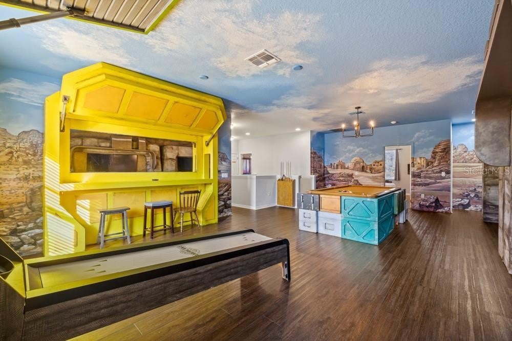 Turnkey, high performing luxury vacation rental in the sought-after Solterra Resort, offering a proven rental history with bookings secured through 2026. Built for short-term rental success, this home delivers strong guest demand through an impressive collection of immersive themed spaces, including Harry Potter, Disney’s UP, Stitch, How to Train Your Dragon, Disney Princess, Broadway, Marvel, Animal Kingdom, Sugar Rush (Wreck It Ralph) and additional themed bedrooms designed to encourage repeat stays. A Star Wars themed entertainment loft and a pirate and cave style private theater with hidden ship arcade elevate the guest experience and support premium rental performance. The open concept layout accommodates large groups and flows to a spacious covered lanai with private pool and spa, a highly desirable feature for vacation guests. Located minutes from Orlando’s world class attractions, the property is within Solterra, a gated destination resort with 24 hour manned security, offering a resort style pool with lazy river, fitness center, playgrounds, sports courts, and an on site café. Cable TV, high speed internet, and lawn maintenance are included. Ideal for buyers seeking a vacation focused property that generates rental revenue with the flexibility for personal use when not occupied.
