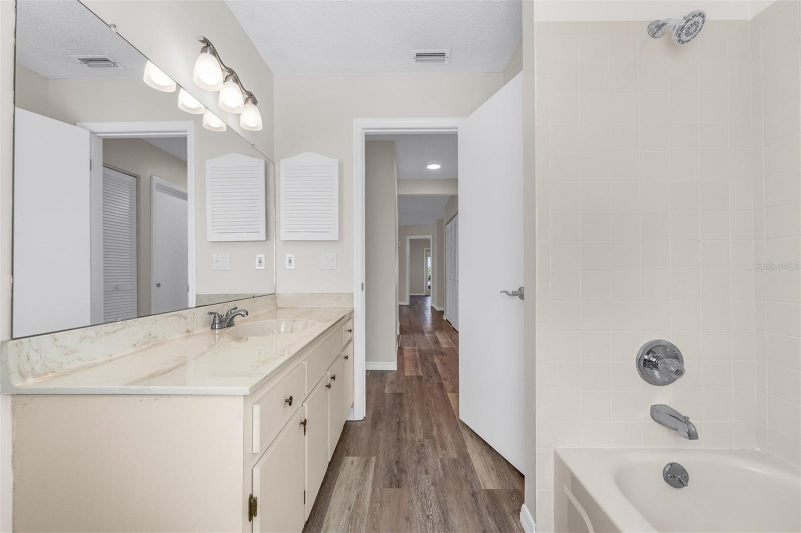 Recent homeowner improvements include a newly poured driveway (approx. 5 years), freshly painted garage walls, and updated door hardware—handles, locks, and hinges—throughout. The interior features fresh paint on doors, walls, and baseboards, gray oak–tone vinyl flooring throughout the main living areas and bedrooms (excluding the kitchen and primary bath), new plumbing in the laundry room, updated lighting and fixtures in both bathrooms and the kitchen, a new disposal, and new ceiling fans with integrated lighting in the living room, primary bedroom, and guest bedroom.