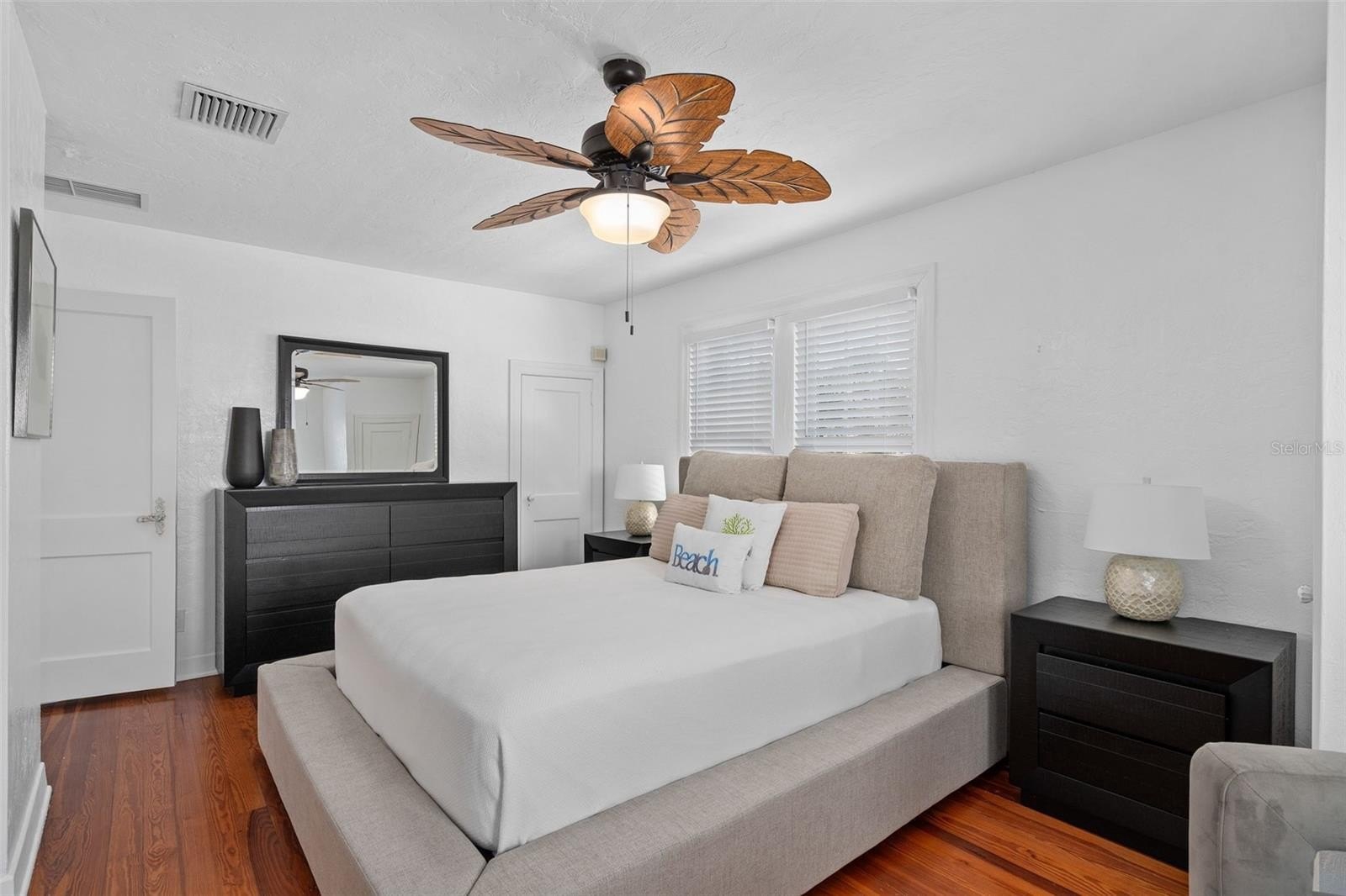 Inside, the home features two bedrooms and two bathrooms, including a second bath in the garage that offers an opportunity to add value. Both bedrooms function as primary suites and have multiple closets along with tranquil water views. Real wood flooring flows throughout most of the home with no carpet, creating a warm and timeless feel.