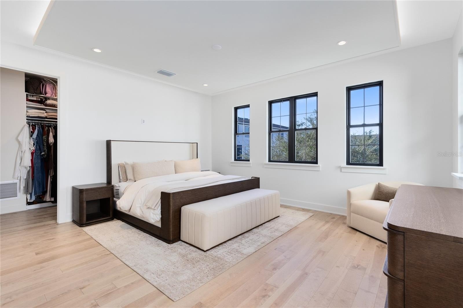 Tucked away on this level, the primary suite offers a private retreat featuring a spacious bedroom, a custom walk in closet, and a spa style bathroom with dual vanities, a freestanding soaking tub, and an oversized glass enclosed shower with multiple shower heads.