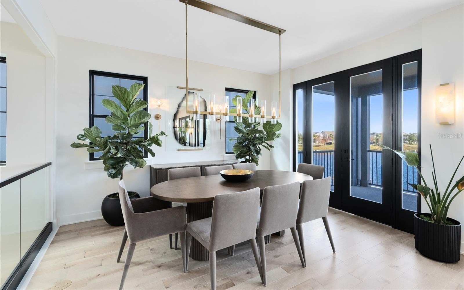 The second floor serves as the heart of the home with an expansive open concept living area ideal for entertaining and everyday living. Walls of windows create a bright and airy atmosphere throughout. The kitchen anchors the space with sleek cabinetry, custom refrigerator panels that blend seamlessly with the design, modern finishes, and ample prep and storage space. The kitchen flows effortlessly into the dining and living areas, while large glass doors open to a covered balcony overlooking the lake. From here, enjoy peaceful morning sunrises and stunning evening sunsets with water views as your backdrop.