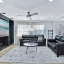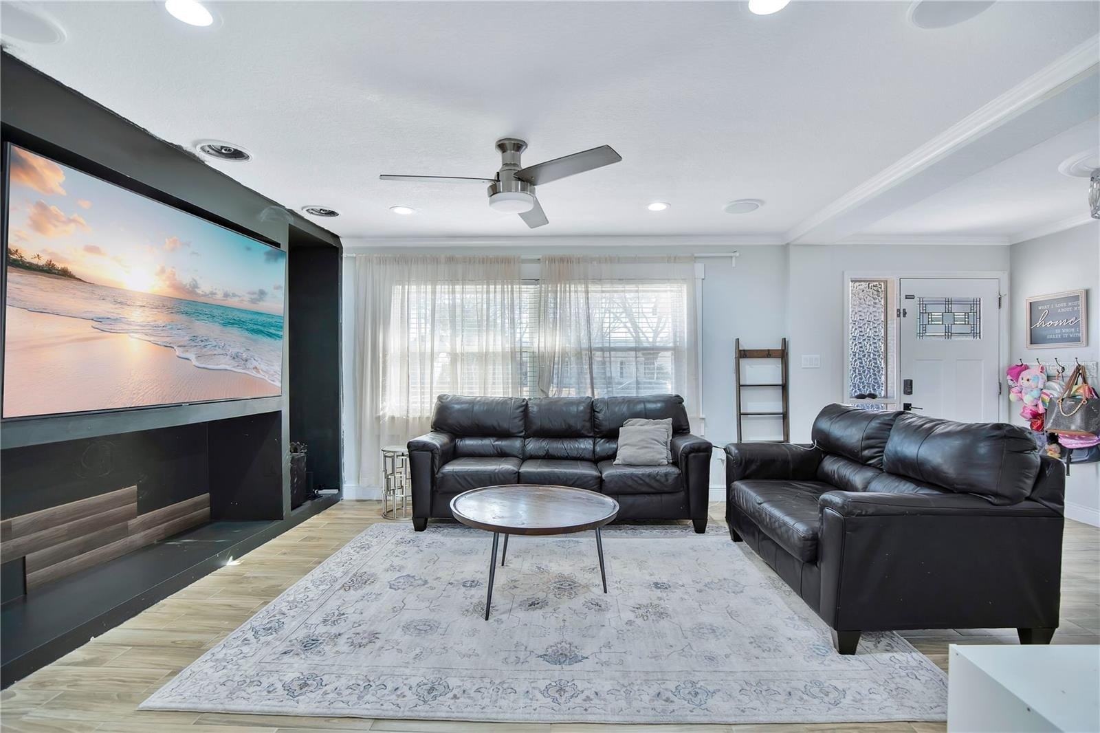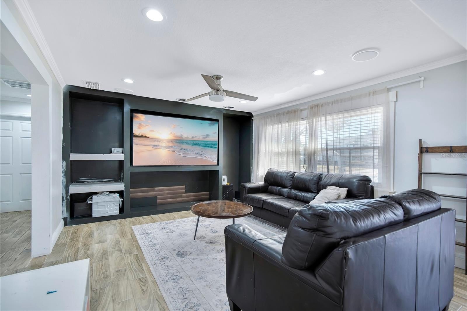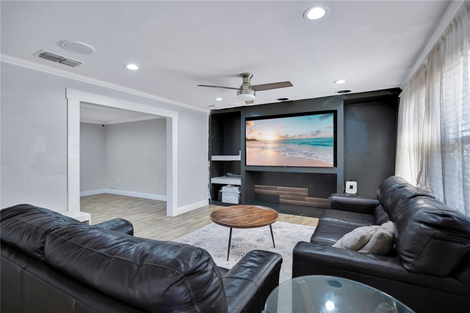 Across from the kitchen is the family room, showcasing a custom built-in entertainment center and flowing effortlessly into the formal living room. The formal living room features glass sliding doors that open to a screen-enclosed patio and fully fenced backyard, ideal for relaxing or hosting guests.