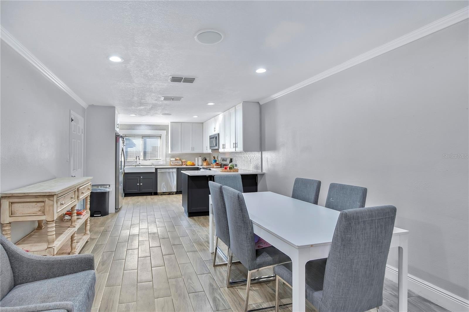 Short Sale. Welcome to your new home in Dover Shores! This recently renovated home features an open-concept floor plan with crown molding throughout and newer HVAC, solar water heater, windows, and wood-look tile flooring, creating a bright and welcoming atmosphere from the moment you enter. To the left of the entry, you’ll find a spacious dining area seamlessly connected to the upgraded kitchen, complete with renovated cabinetry, updated countertops, and an open layout perfect for entertaining.
