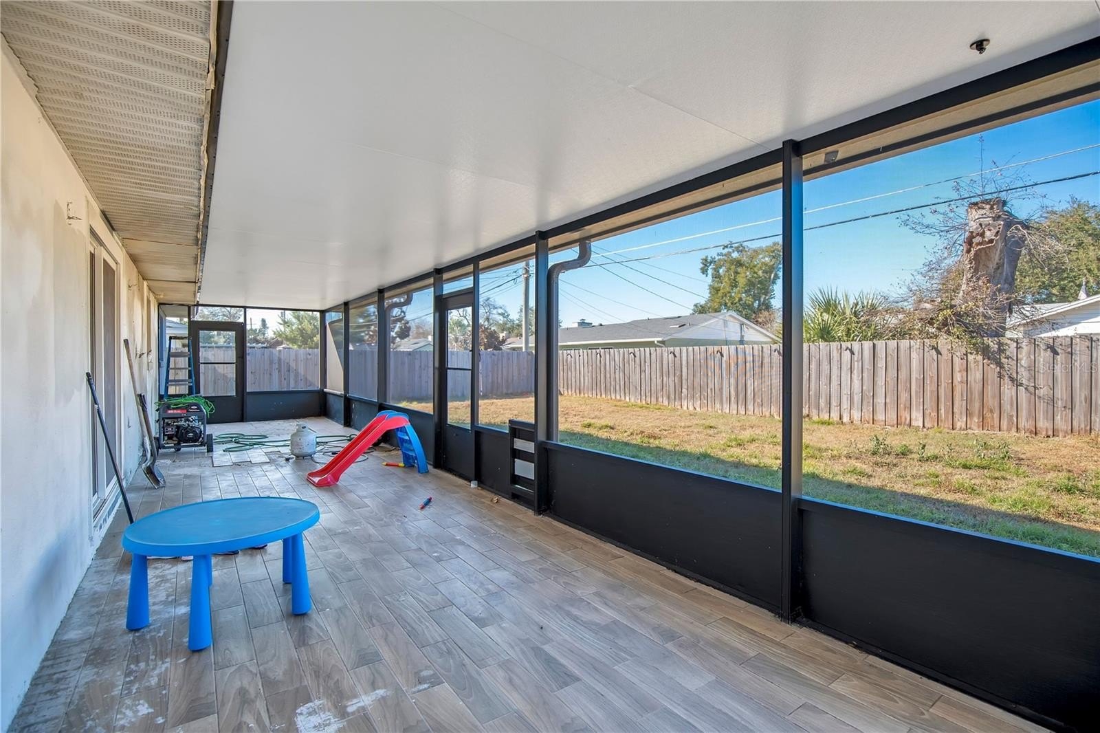 The split-bedroom layout offers privacy and functionality. Two secondary bedrooms with a shared full bathroom are located off the living room, while the primary suite includes an ensuite bathroom with unfinished areas that will be conveyed in their current condition, allowing for customization and added value. The screened patio also includes unfinished areas that will be conveyed in their current condition, providing an excellent opportunity for a buyer to complete remaining projects to their taste.