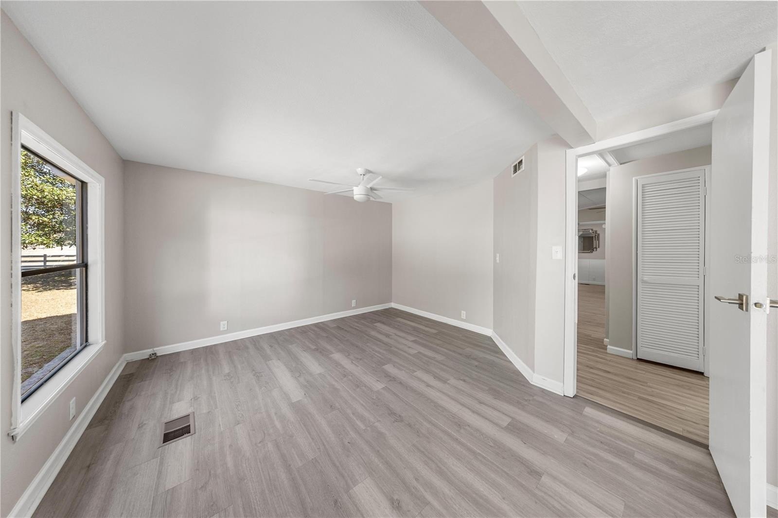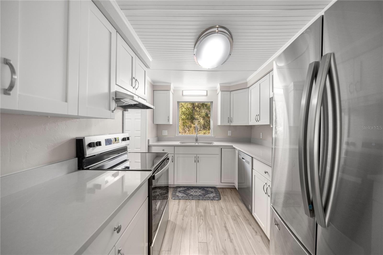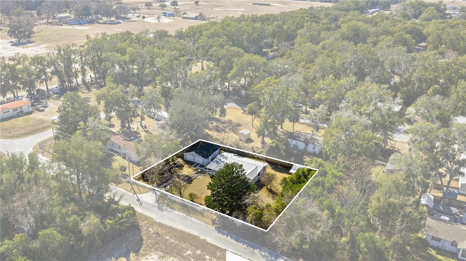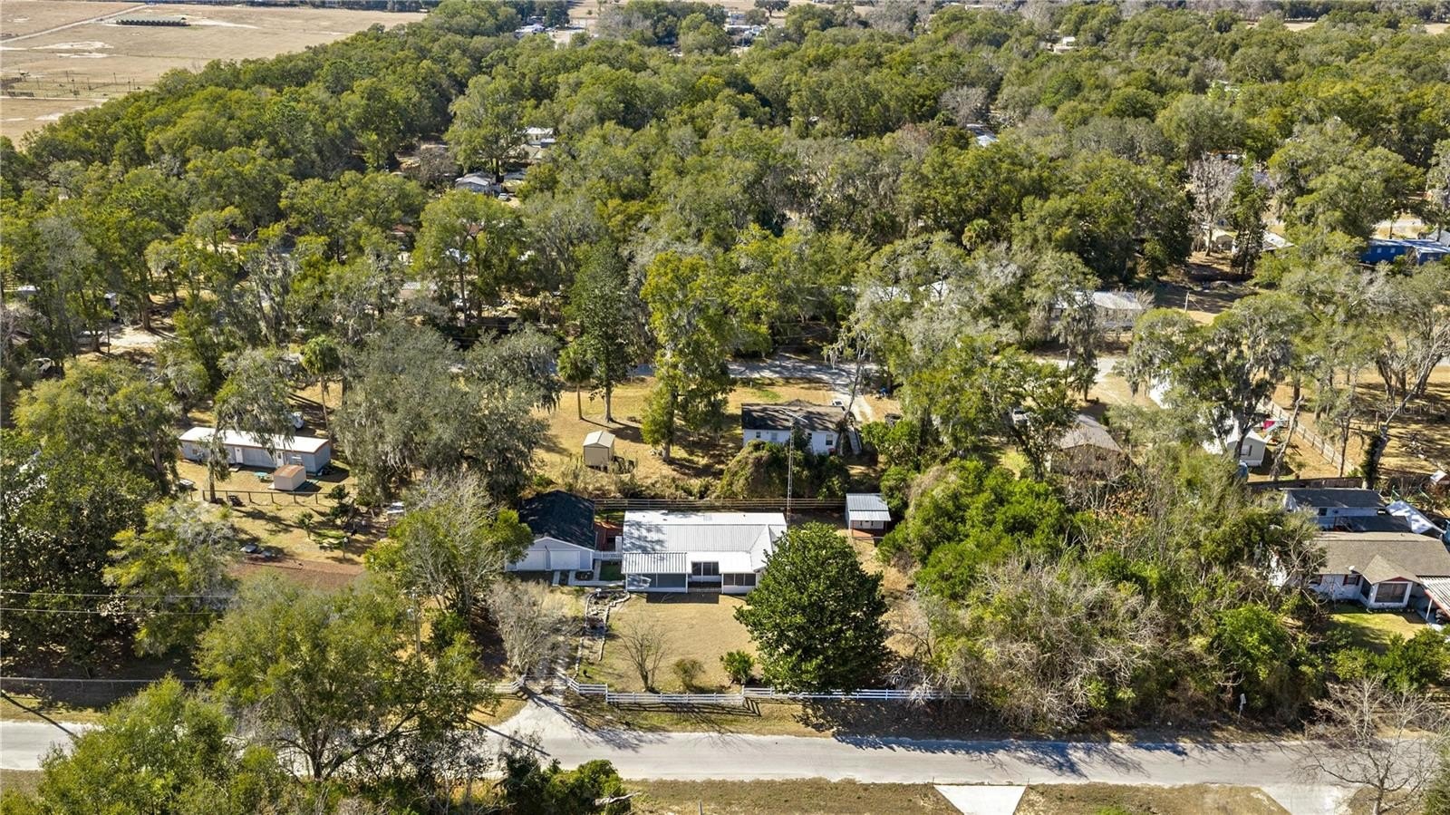 One or more photo(s) has been virtually staged. Welcome To This Renovated 3 Bed/2 Bath Double Wide Manufactured Home w/Huge Detached Garage, situated on nearly a half acre. NO Lot Rent and NO HOA! Located just 7 minutes from The Villages and a quick 10-minute drive to Ocala, this property offers not only a convenient location but also the flexibility of R-4 Mixed Residential zoning, allowing versatile usage including a two-family dwelling. Split floor plan, volume ceiling, luxury vinyl flooring, inside laundry, fenced backyard, and metal roof. The master suite includes a full bath and spacious walk-in closet. The 2nd bedroom is oversized with dual closets and the potential to be divided into an additional room. The 3rd bedroom features a private entrance, making it ideal for guests, in-laws, or a home office. Galley kitchen boasts new custom cabinets, Quartz countertops and stainless steel appliances. Outdoor features include; a front and rear porch, 12x12 cabin shed, 36x24 detached garage with washer & dryer hookup and the option to transform the space into a workshop or living quarters if desired. Upgrades include; HVAC 2017, LVT Flooring 2023, Kitchen/Bath 2025, Electrical/Plumbing 2025, Rain Gutters 2025, and Well Pump 2025. Freshly painted interior and exterior!