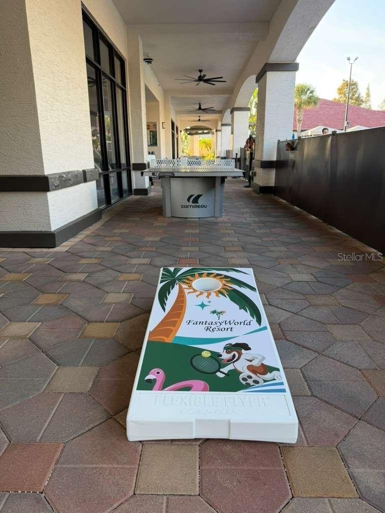 Community amenities include a lazy river, multiple pools including the Oasis Pool, hot and warm spas, fountains, fitness center, game room, splash pad, interactive water features, sports courts (volleyball, tennis, basketball, bocce), ping pong, pool tables, batting cages, playground, business center, owner services, EV chargers, poolside cabanas, charcoal grills, and more.