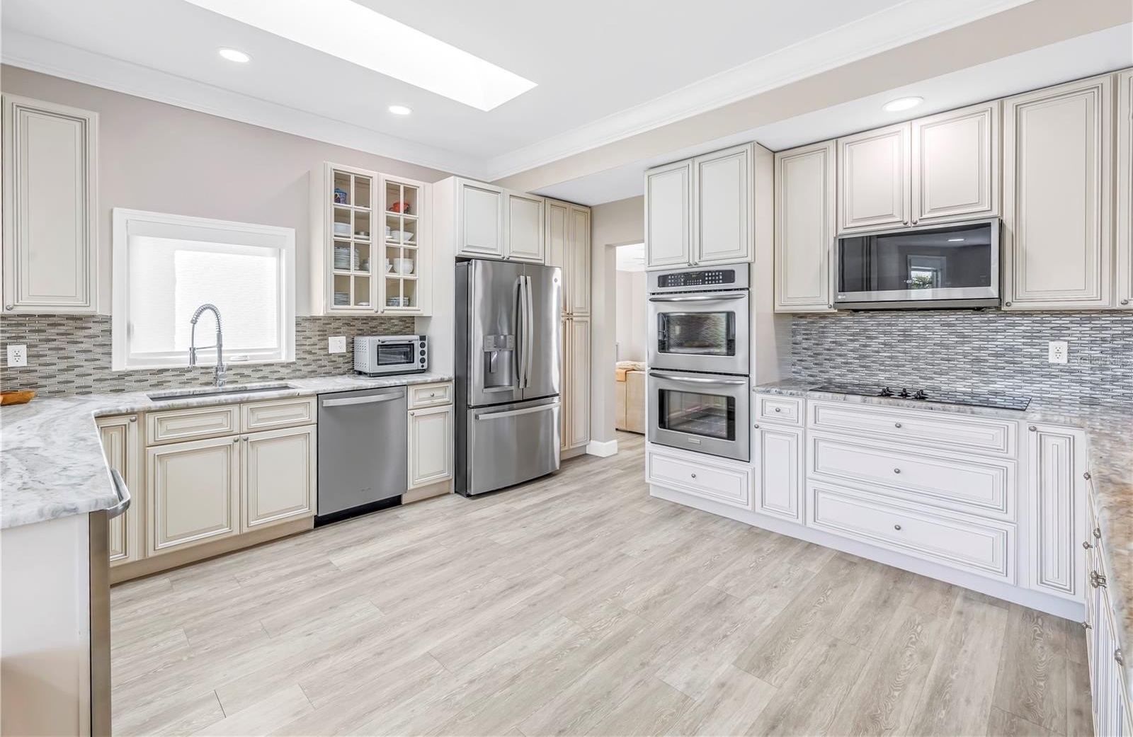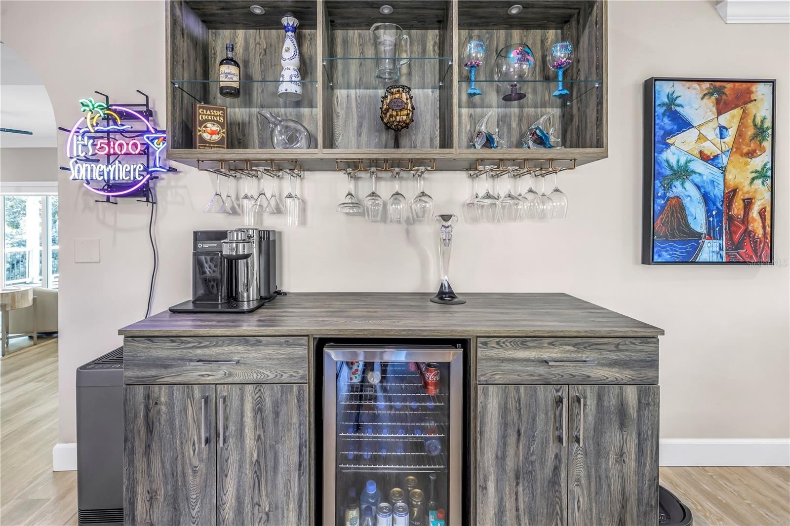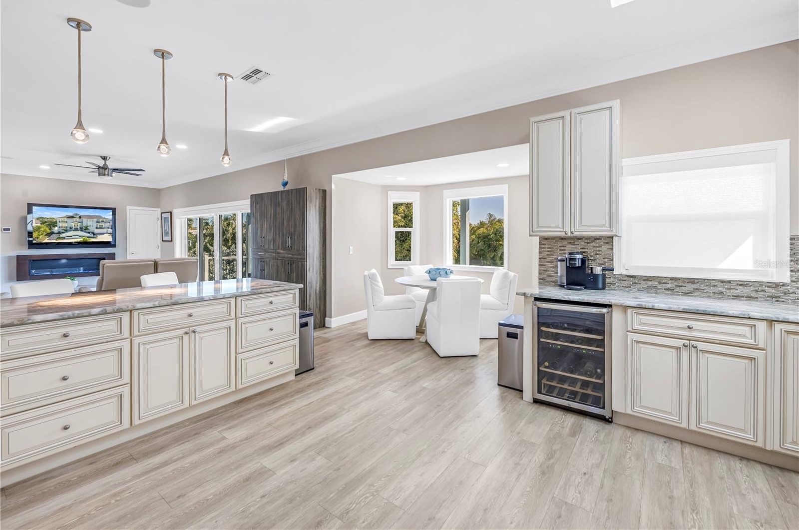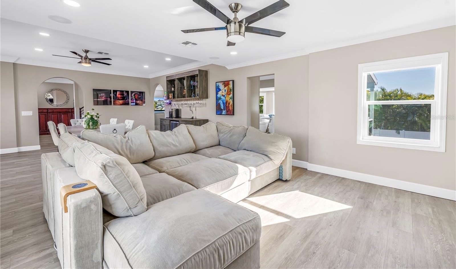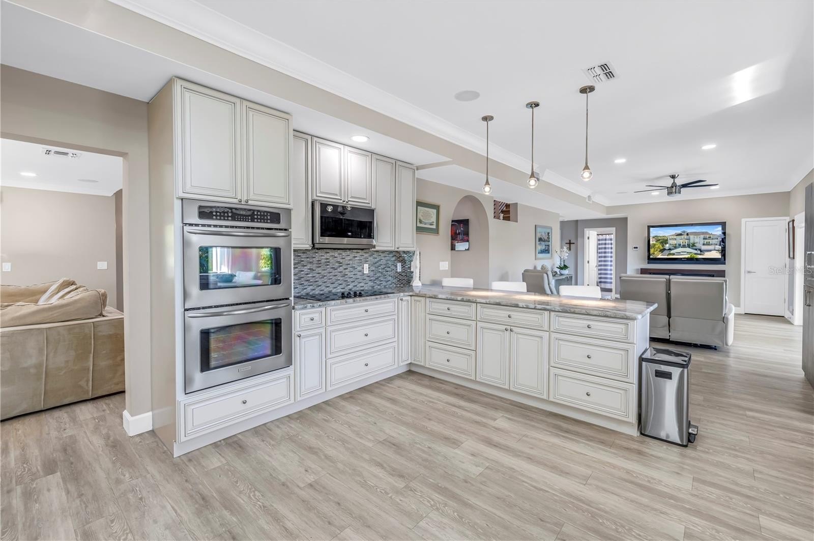 The home has benefited from over $250,000 in thoughtful upgrades combining comfort and quality throughout. Interior features include new flooring (2022), California custom closets in every bedroom, a remodeled laundry room with granite countertops, and an updated kitchen with a new refrigerator and microwave (2024), complemented by updated lighting and custom window treatments. Additional highlights include whole-house surround sound, a custom bar and pantry, whole-house water filtration system, ADT security system, and an updated garage opener.