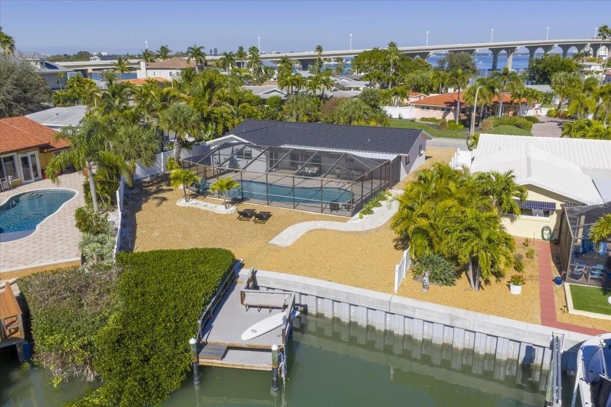 Fully opening hurricane-rated sliding glass doors (2024) lead to an oversized screen-enclosed pool and patio, enhanced by new pool pavers, mature landscaping, and serene water views. Enjoy the composite dock and new seawall with increased height (2025)—perfect for fishing, paddleboarding, dolphin watching, and unforgettable sunset gatherings.