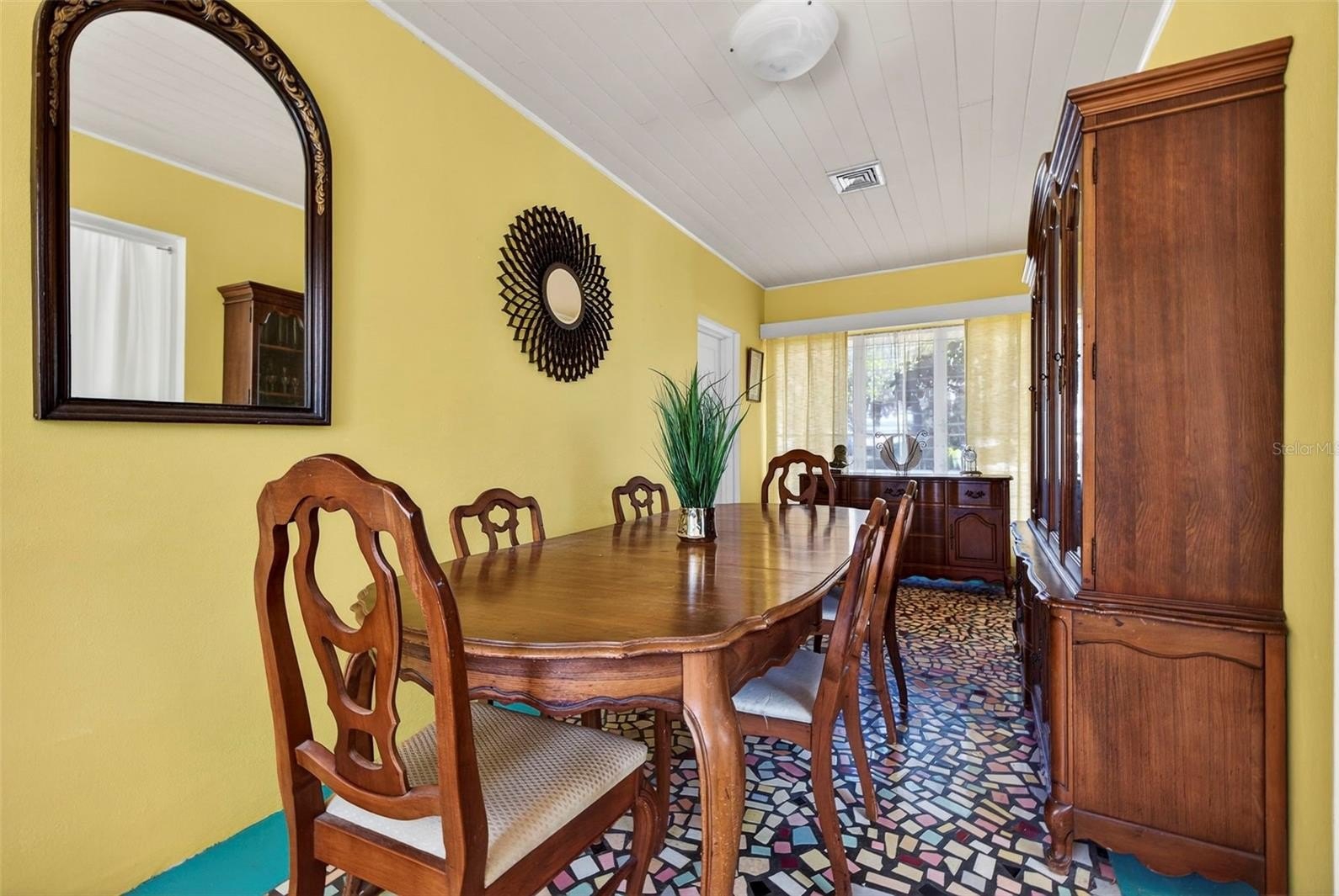 Inside, you’ll find original hardwood floors throughout, adding warmth and timeless character. The kitchen features marble flooring and newer granite countertops, while the dining room showcases an original mosaic floor that creates a beautiful focal point rich in craftsmanship and charm. The spacious living room is filled with large windows that invite abundant natural light, creating a bright, airy atmosphere perfect for everyday living and entertaining. The home is wired for an alarm system, and a well-fed sprinkler system keeps the yard looking its best.
