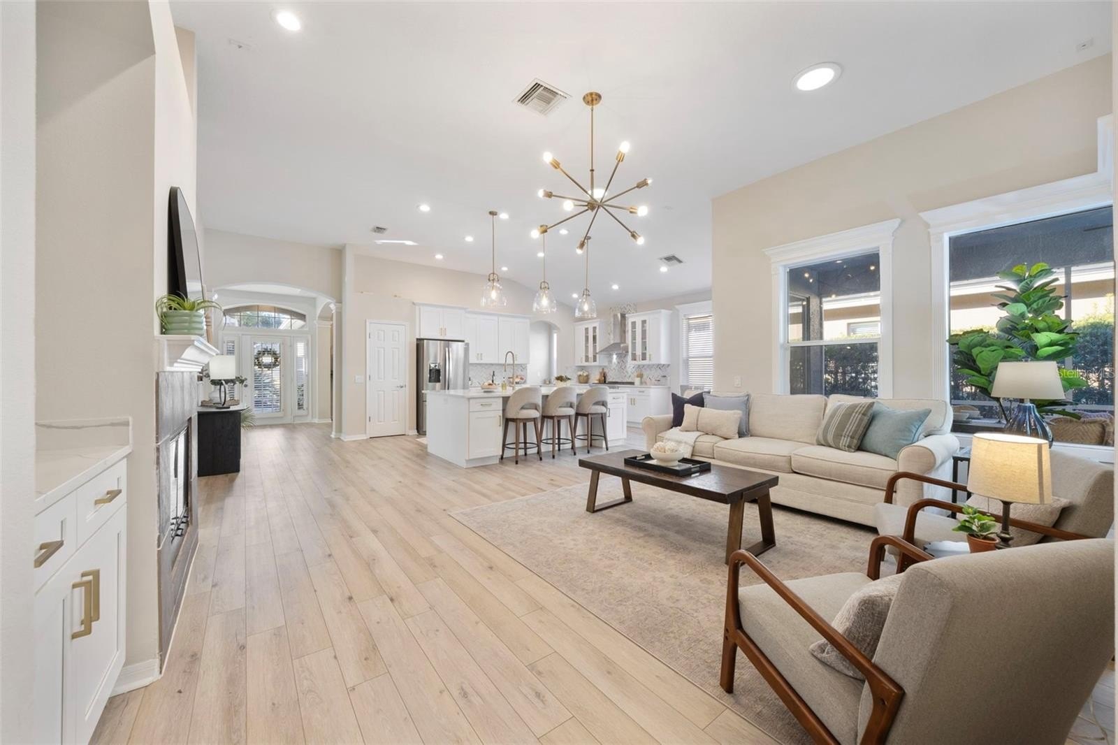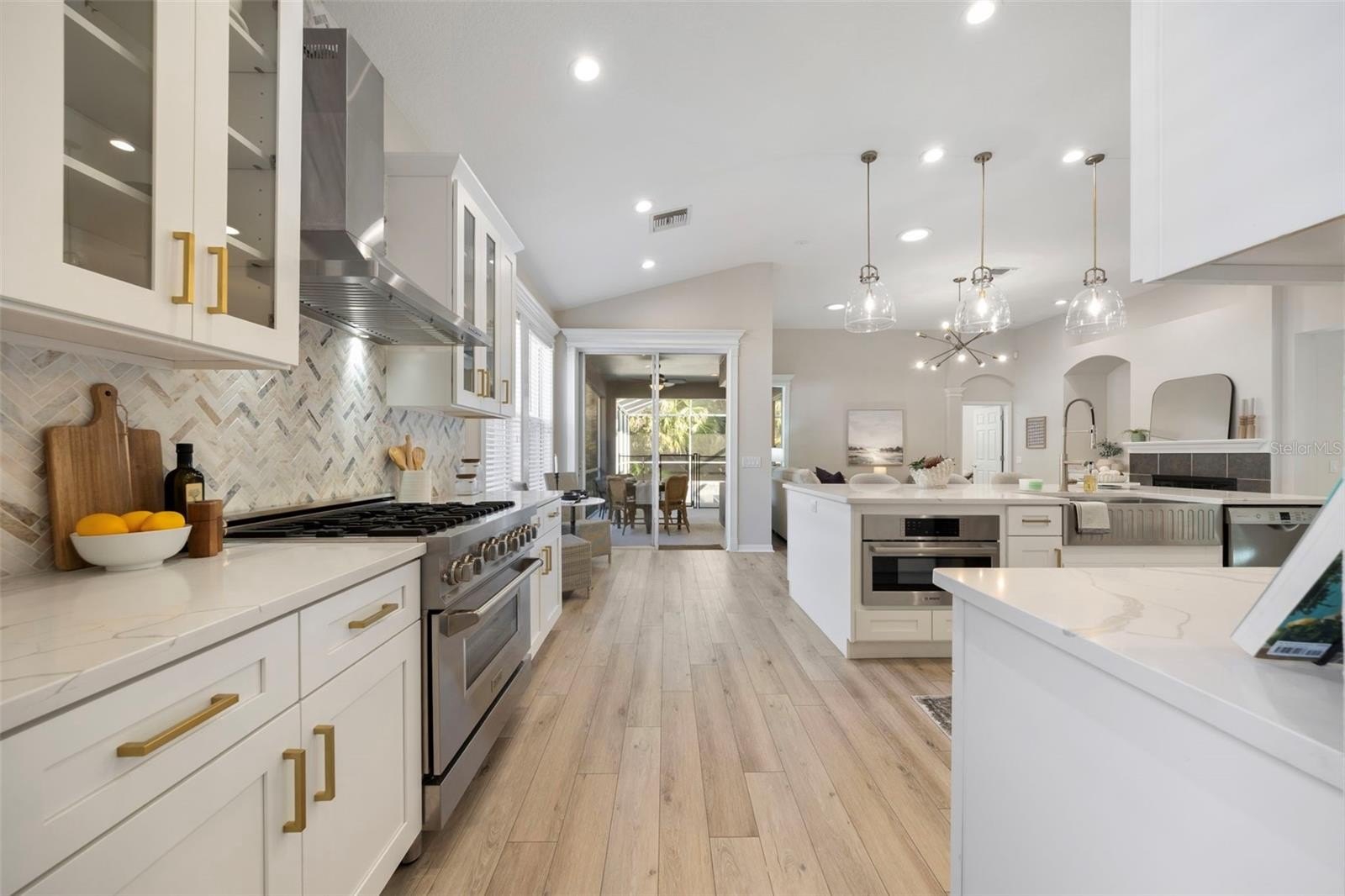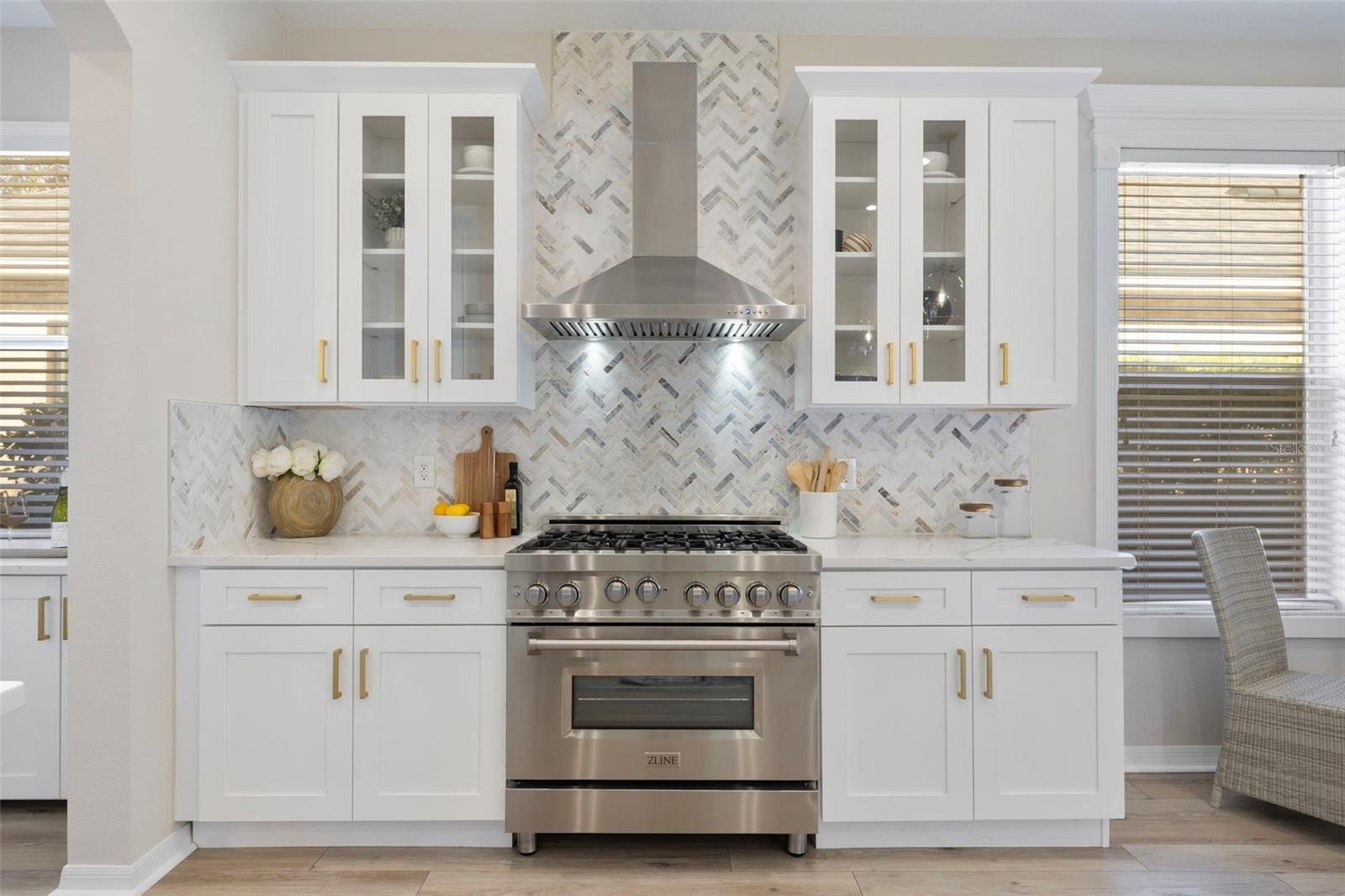 The show-stopping open-concept kitchen features white shaker cabinetry, quartz countertops, stainless steel appliances, a ZLINE gas range, and Bosch microwave and dishwasher—perfectly positioned to flow into the family room for effortless entertaining. Step outside to the screened backyard oasis, complete with a heated pool, ideal for year-round enjoyment.