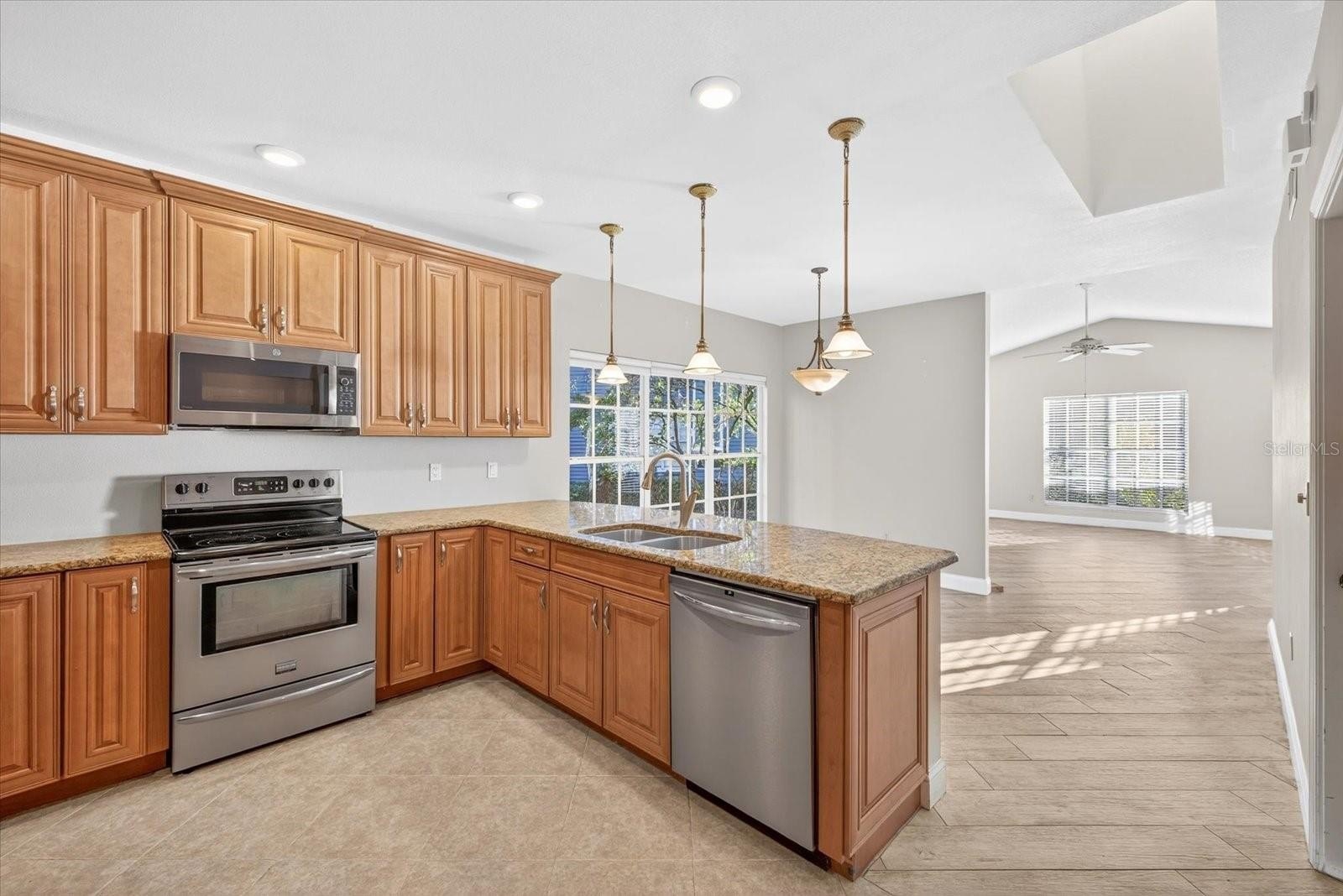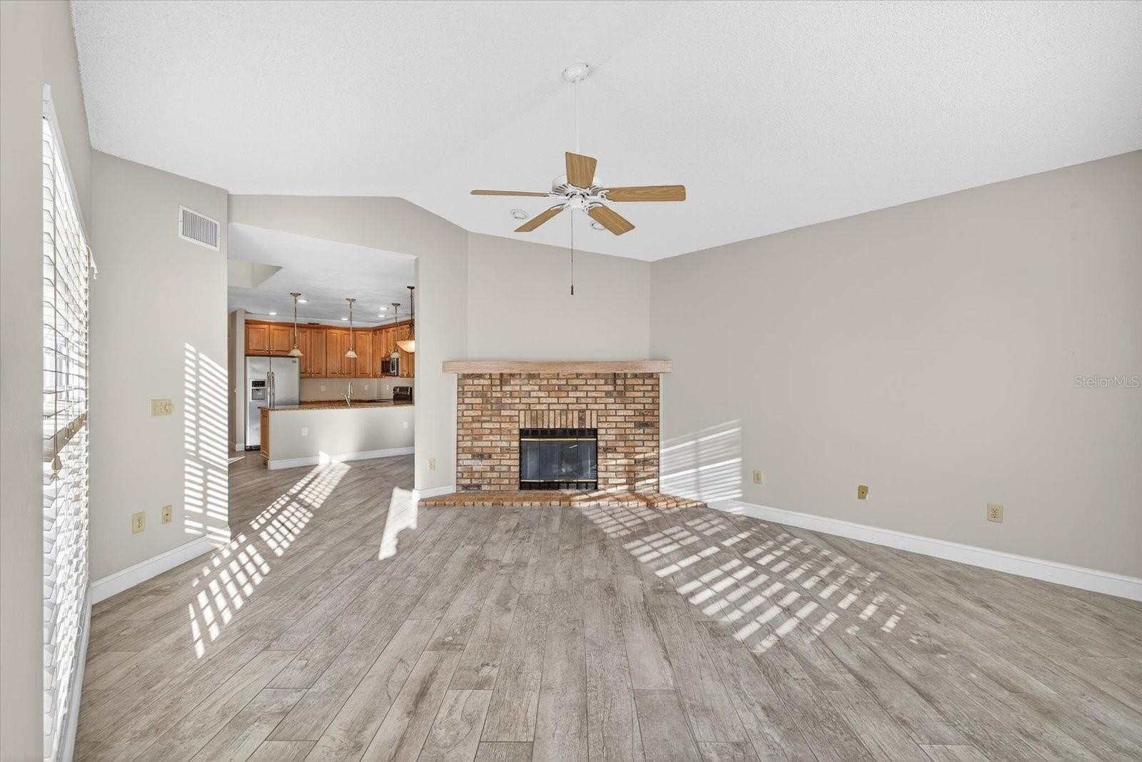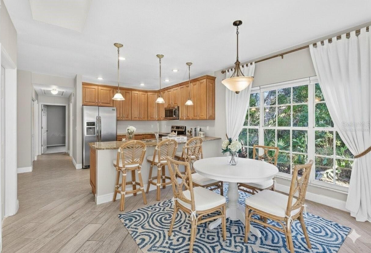 Enjoy peaceful, low-maintenance living in this impeccably kept, move-in ready end-unit villa backing to serene conservation views with rare yard space for added privacy. Inside, bright open living areas with cathedral ceilings, tile plank flooring, and a cozy wood-burning fireplace create a warm, modern atmosphere perfect for everyday living and entertaining. The updated eat-in kitchen features updated wood cabinets, granite countertops, stainless steel appliances, and a breakfast bar ideal for casual meals or hosting.This home also offers additional attic storage, a valuable feature that adds functionality and flexibility without sacrificing living space. Step outside to your private backyard retreat or stroll just steps away to the newly remodeled community pool. Currently located in top-rated Palm Harbor schools and Flood Zone X, this home offers true peace of mind. Per the seller the low HOA of $265/month covers the roof, exterior painting, landscaping, irrigation, and garbage, making ownership effortless. Major updates include a newer roof (2021–2022), HVAC with UV light, and newer water heater (2017)—delivering comfort, value, and confidence just minutes from shopping, dining, beaches, and everyday essentials.