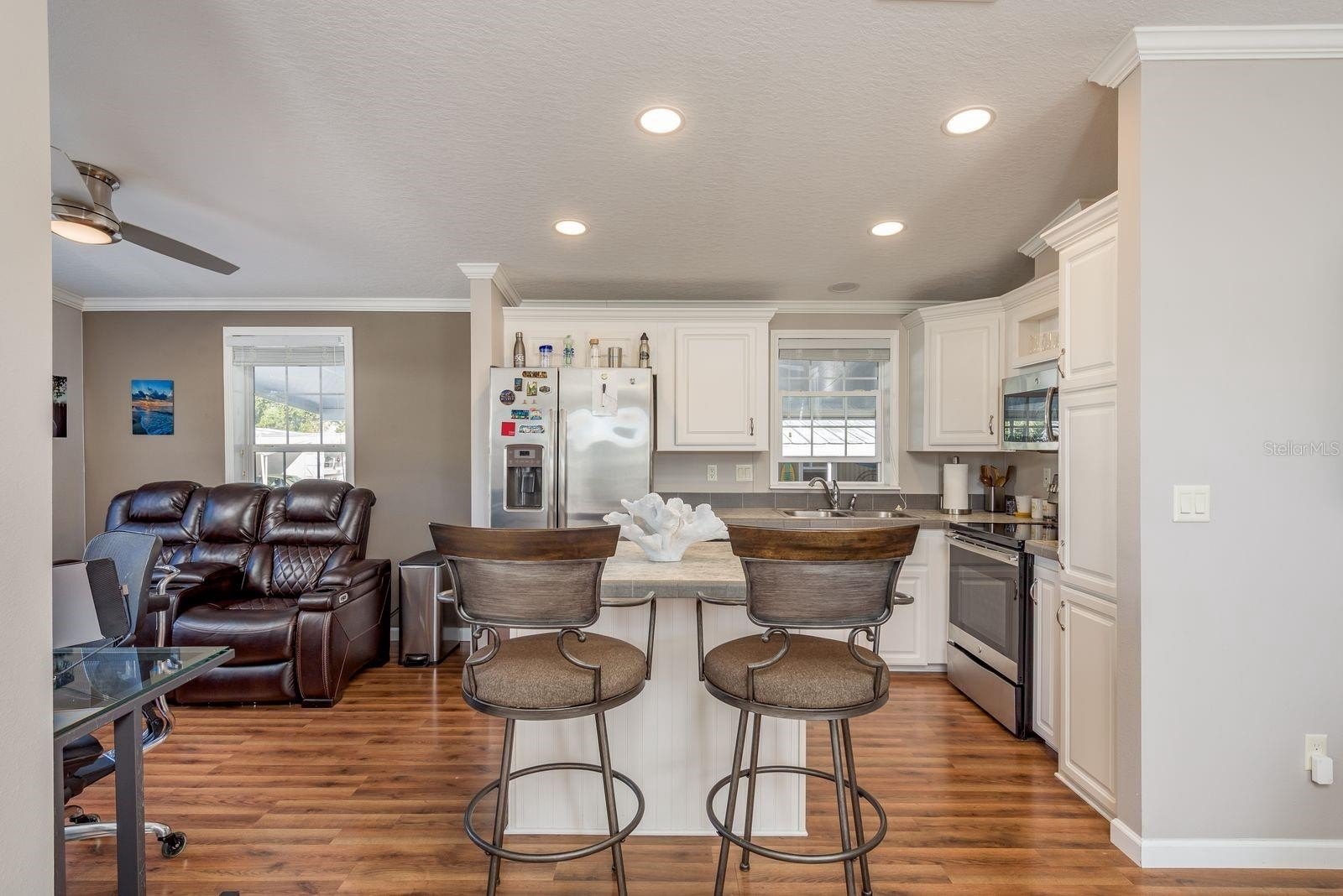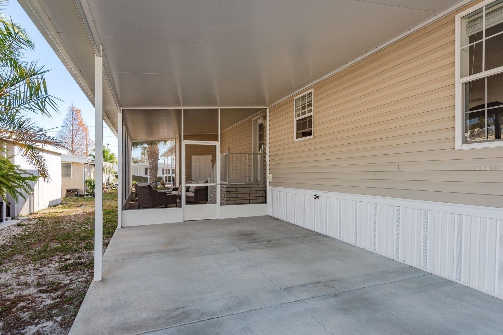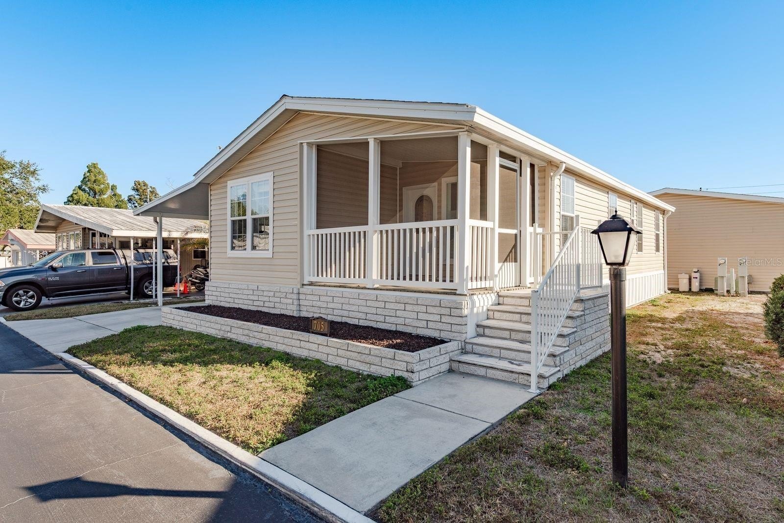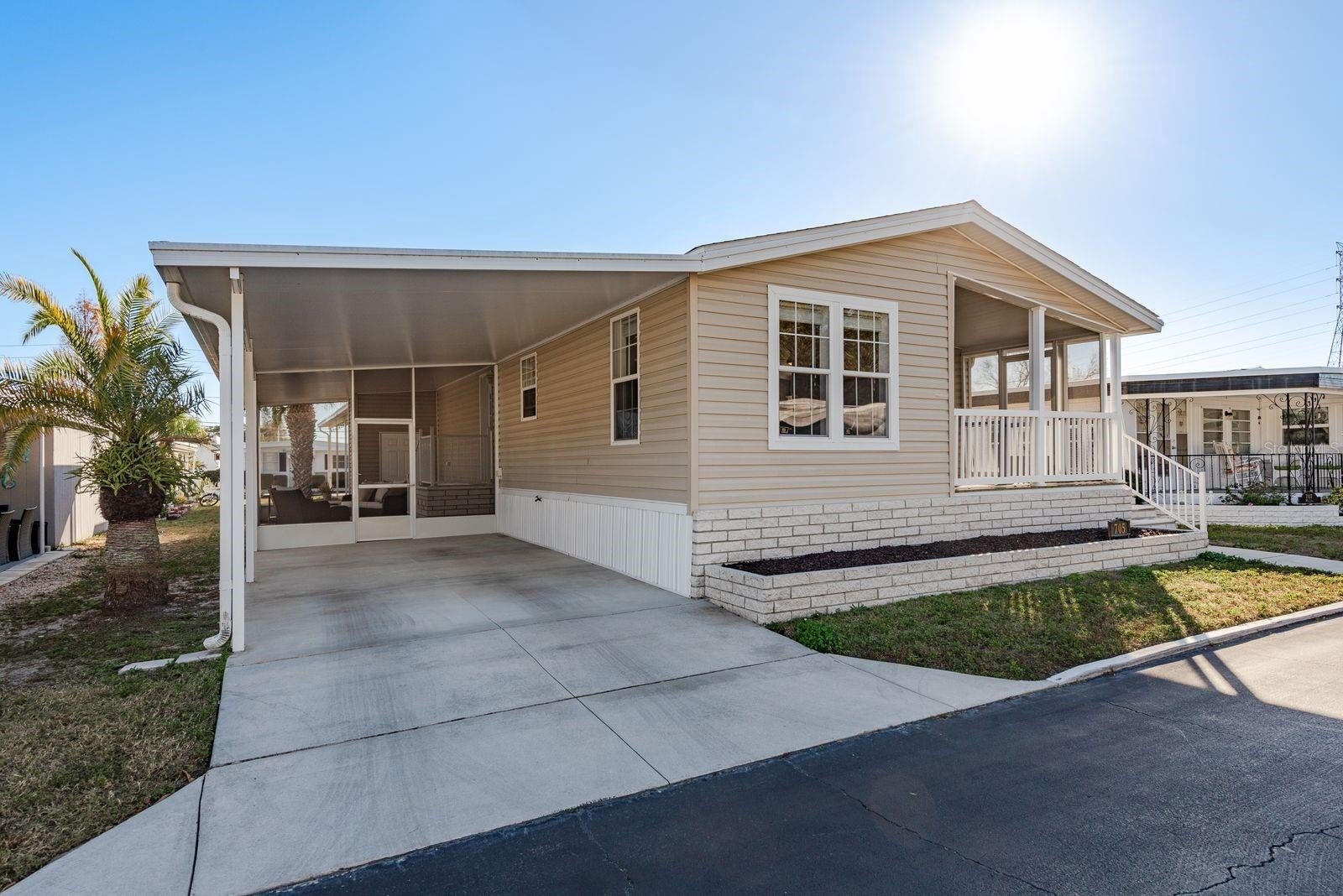 Inside, the home offers an open-concept layout with two comfortable bedrooms and two full bathrooms. Plenty of windows invite natural light, and the spacious living area flows easily. Enjoy stainless steel appliances and an island in the kitchen. Laminate flooring and neutral wall colors complement the warm feeling. You will enjoy Florida’s warm weather on your screened porch or carport lanai. Owners benefit from recent construction standards based on the 2017 manufacture date. This home has just under 1000 sq ft of living space. 2020 HVAC system, updated ceiling fans, enhance comfort, and a gutter system with a transferable leaf-filter keeps maintenance low. Regular pest treatments and a water softener system add to the worry-free lifestyle.