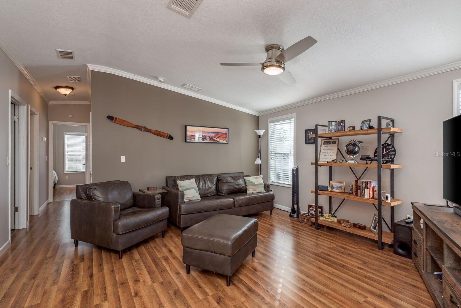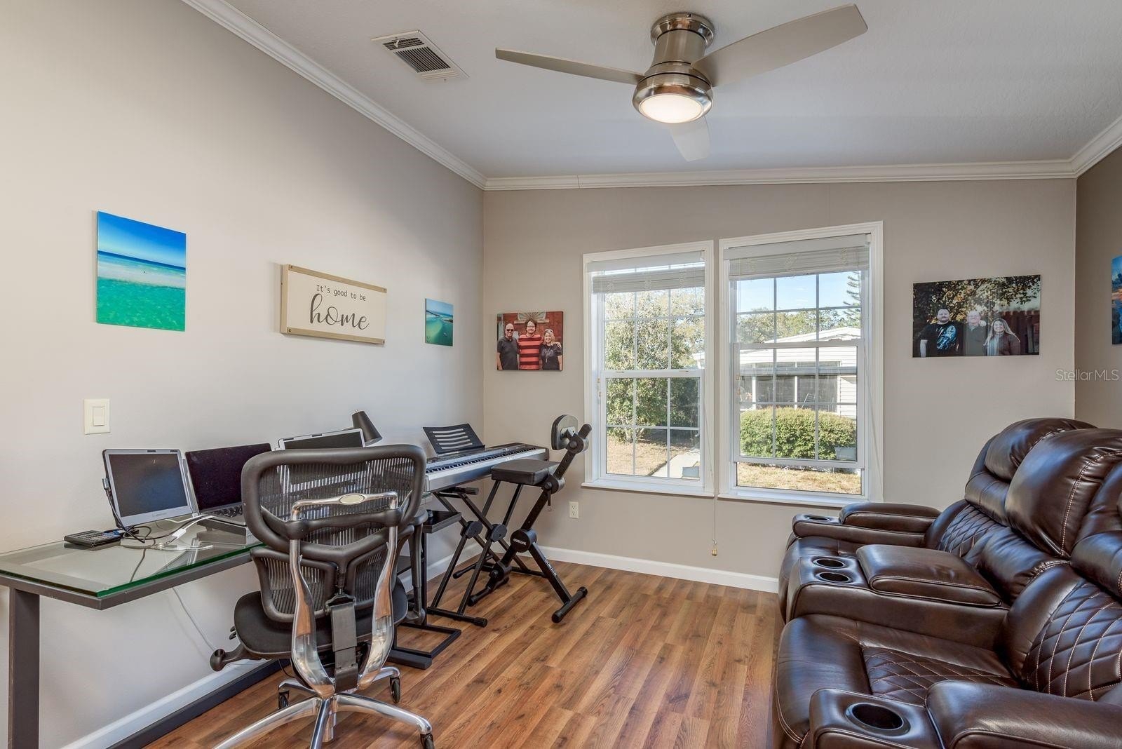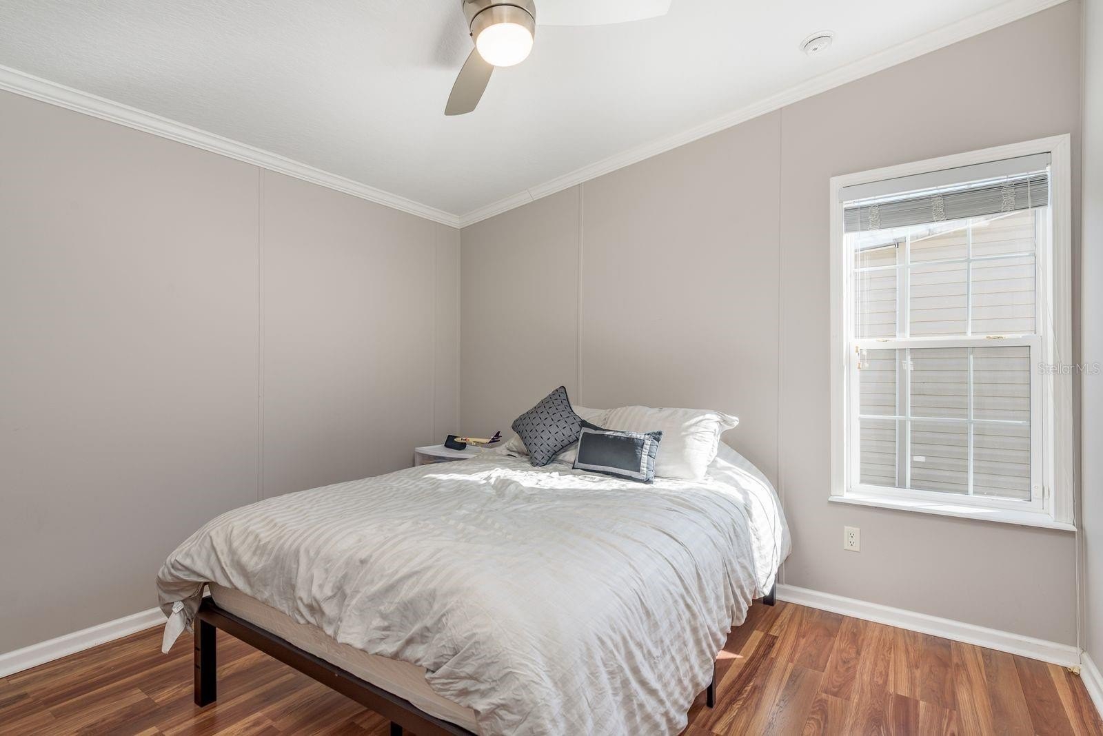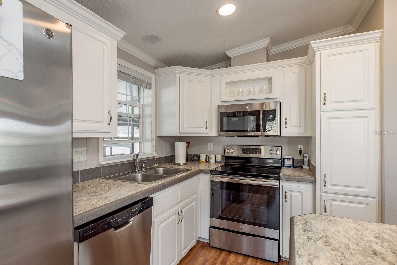 Inside, the home offers an open-concept layout with two comfortable bedrooms and two full bathrooms. Plenty of windows invite natural light, and the spacious living area flows easily. Enjoy stainless steel appliances and an island in the kitchen. Laminate flooring and neutral wall colors complement the warm feeling. You will enjoy Florida’s warm weather on your screened porch or carport lanai. Owners benefit from recent construction standards based on the 2017 manufacture date. This home has just under 1000 sq ft of living space. 2020 HVAC system, updated ceiling fans, enhance comfort, and a gutter system with a transferable leaf-filter keeps maintenance low. Regular pest treatments and a water softener system add to the worry-free lifestyle.