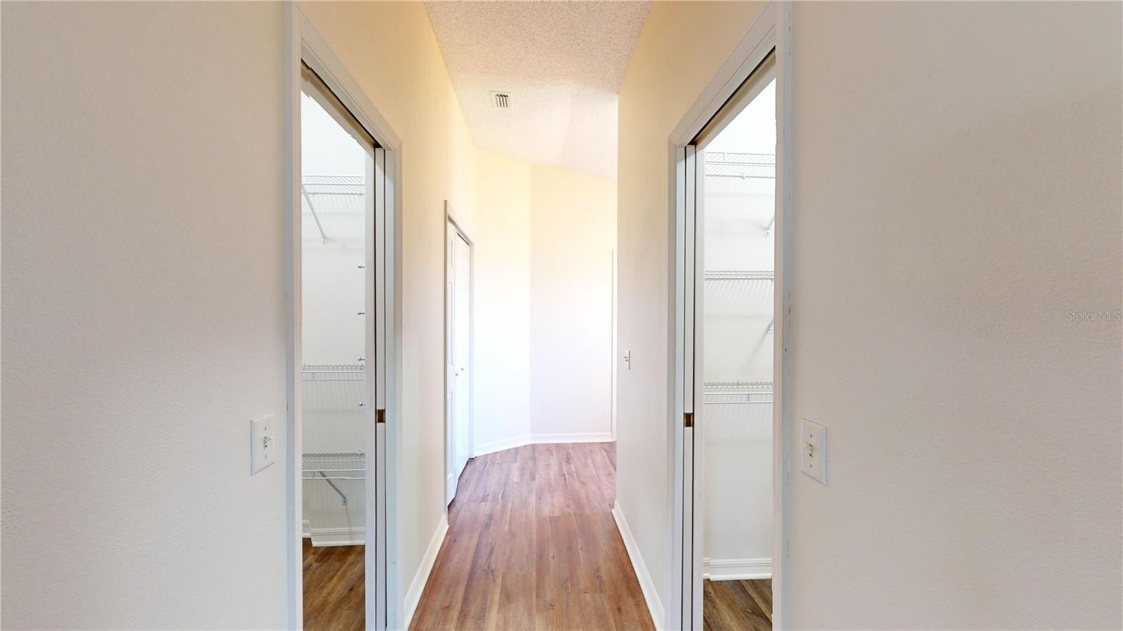 The split-bedroom layout offers privacy for guests. The front den/study (3rd bedroom option, no closet) features built-in cabinetry and desk space, ideal for a home office. The spacious owner’s suite includes vaulted ceilings, two walk-in closets, and private lanai access. The en-suite bath offers dual sinks, a makeup area, linen storage, private water closet, and a tiled walk-in shower with bench and grab bars.