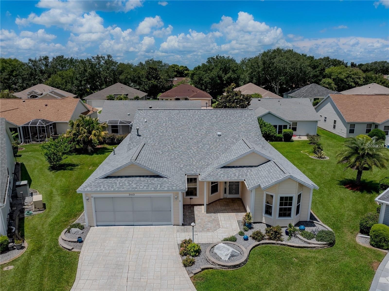 Come look at this beautifully maintained Camellia Designer model located on a quiet cul-de-sac in the desirable Village of Santiago in The Villages. This spacious gas home offers excellent curb appeal with a custom hand-stamped driveway and walkway, extended paver front porch, stacked stone landscape beds, and mature landscaping.
