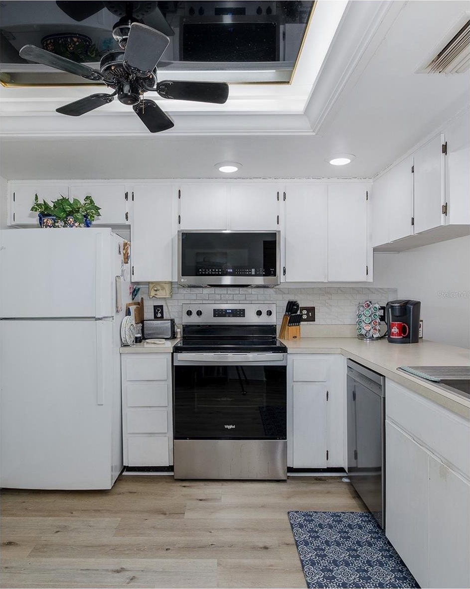 Cold, snow, ice...no more! Instead sit on your front porch enjoying the glorious Florida weather enjoying the birds on the pond. This split bedroom 2/2 has newer vinyl plank floors in the main living area and new carpet in the Primary Bedroom complete with a en-suite bath and walk-in closet. The kitchen with a newer stove, dishwasher, and microwave has ample counters and is open to the Dining Room and Living Room for seamless entertaining. All this is located in a small neighborhood surrounded by lush landscape. The community has many amenities...a heated pool, tennis courts, shuffle board, a fitness center, and even a public golf course. There is also a clubhouse with many events....you can decide what level of social interaction you want. You can be a hermit (not suggested) or a social butterfly at all of the numerous activities and clubs. Call your real estate professional today to see this great opportunity to live in a place you will be happy to call home!