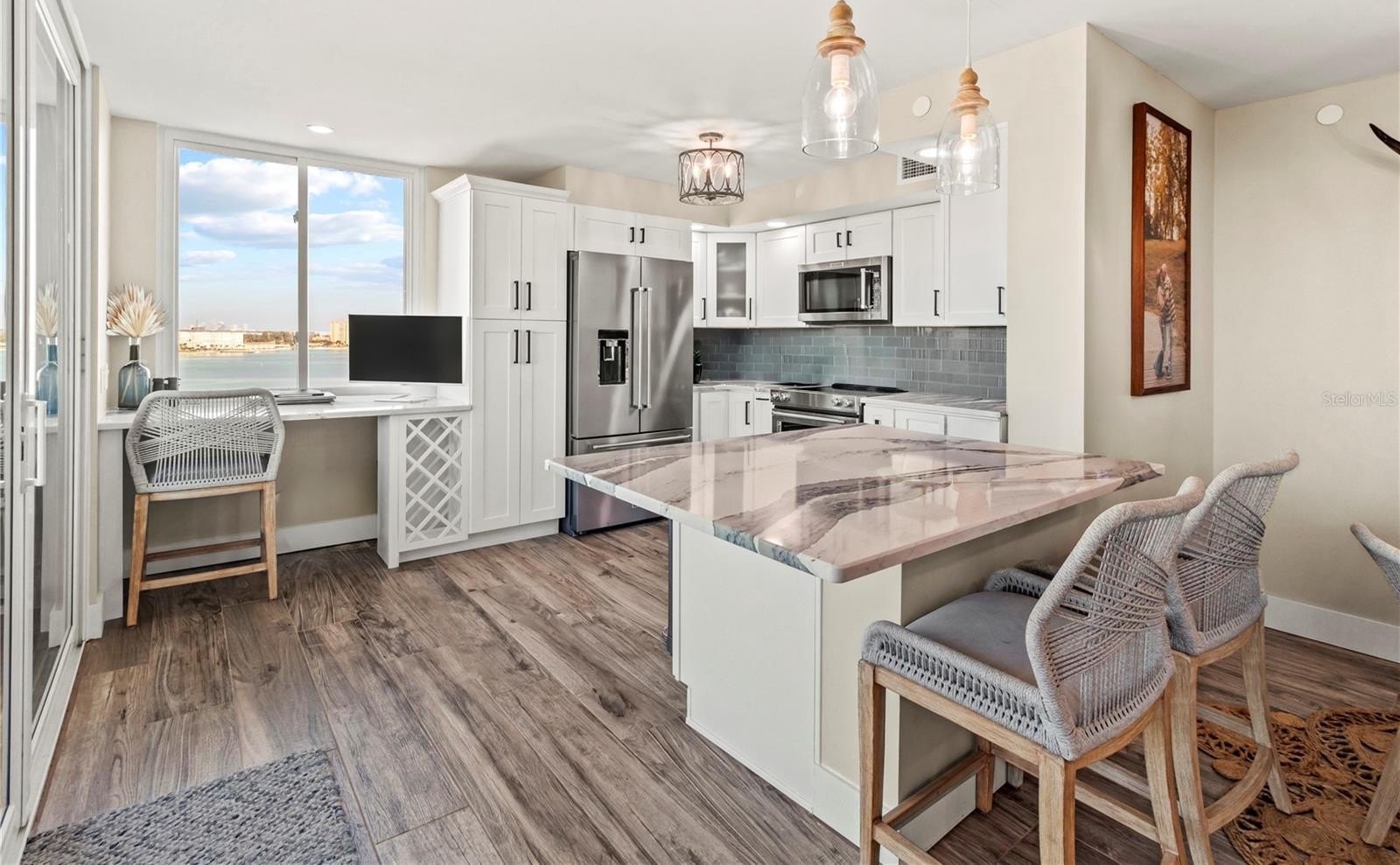 Looking for your ideal home? Start living the dream with these breathtaking, panoramic water and golf views watching the sun rise in the morning and set in the evening. Homes of this caliber that are warmly inviting offers an impressive lifestyle in a premier location – a rare find for the discerning buyer. When you step inside the front door you will note that the home has been entirely renovated from top to bottom with every finish, fixture, and detail reflecting luxury and style. The chef’s kitchen displays quartz countertops, solid wood cabinets, and Kitchen Aid appliances. The high impact windows, hurricane shutters, water heater, and Trane HVAC were all replaced in the 2023-2024 timeframe including the top-notch Miele washer and heat pump dryer. Special highlights include large ceramic tile flooring with a sound barrier underlayment, a soaking bathtub in the guest bath, and a continuous cartridge water softener. The split-bedroom floor plan offers lots of closet space including an additional storage unit. This home is absolutely move-in ready! Other conveniences include an assigned covered parking space, laundry facility, and community room. Palma Del Mar offers all the amenities including a water-front heated pool and spa and storage for your bikes. The HOA fee includes security, water, sewer, trash, internet, and cable. ALL MILESTONE AND STRUCTURAL REVIEW INSPECTIONS HAVE BEEN COMPLETED. Just minutes away are walking and biking trails at Ft. Desoto Park, St. Pete Beach, and multiple boating marinas. But best of all, after a full day of activities, simply savor the moment and enjoy the sunset while sitting on your balcony. Patio furniture included! Everything you need is here or just a short distance away including a lively downtown, shopping, restaurants, and easy access to I-275 and the airports.