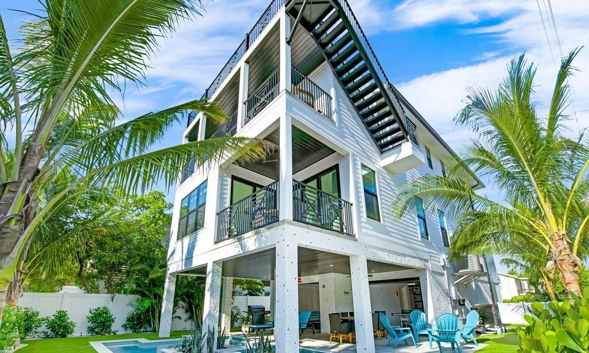 Thoughtfully constructed with elevated design and timeless coastal architecture, the home welcomes you with light-filled interiors, expansive gathering spaces, and seamless indoor-outdoor flow. The open-concept main living area is perfectly suited for entertaining, featuring a chef-inspired kitchen with premium appliances, generous counter space, and an effortless connection to spacious dining and lounge areas. Multiple balconies provide inviting settings to enjoy Gulf breezes, morning coffee, or spectacular island sunsets.