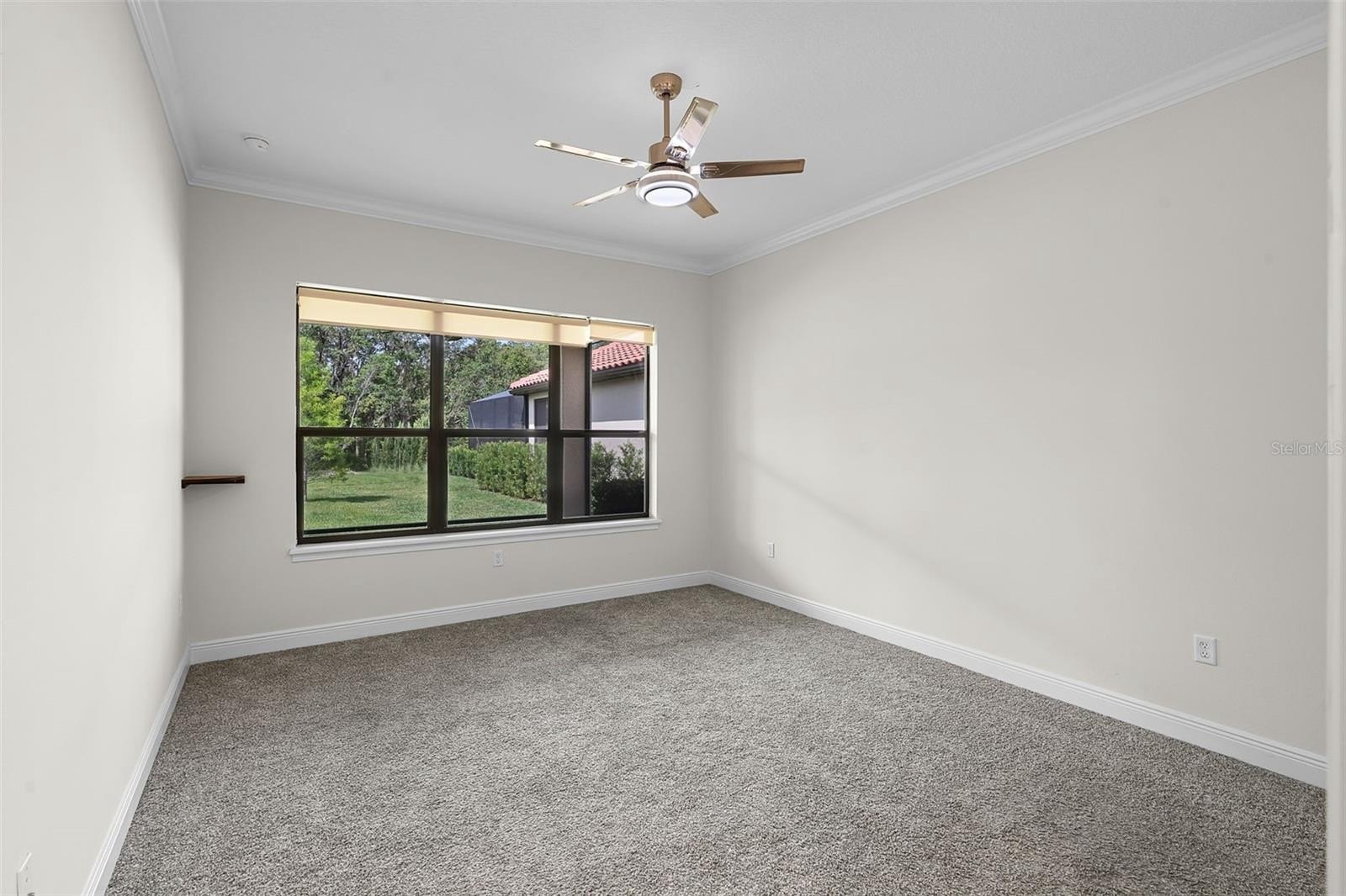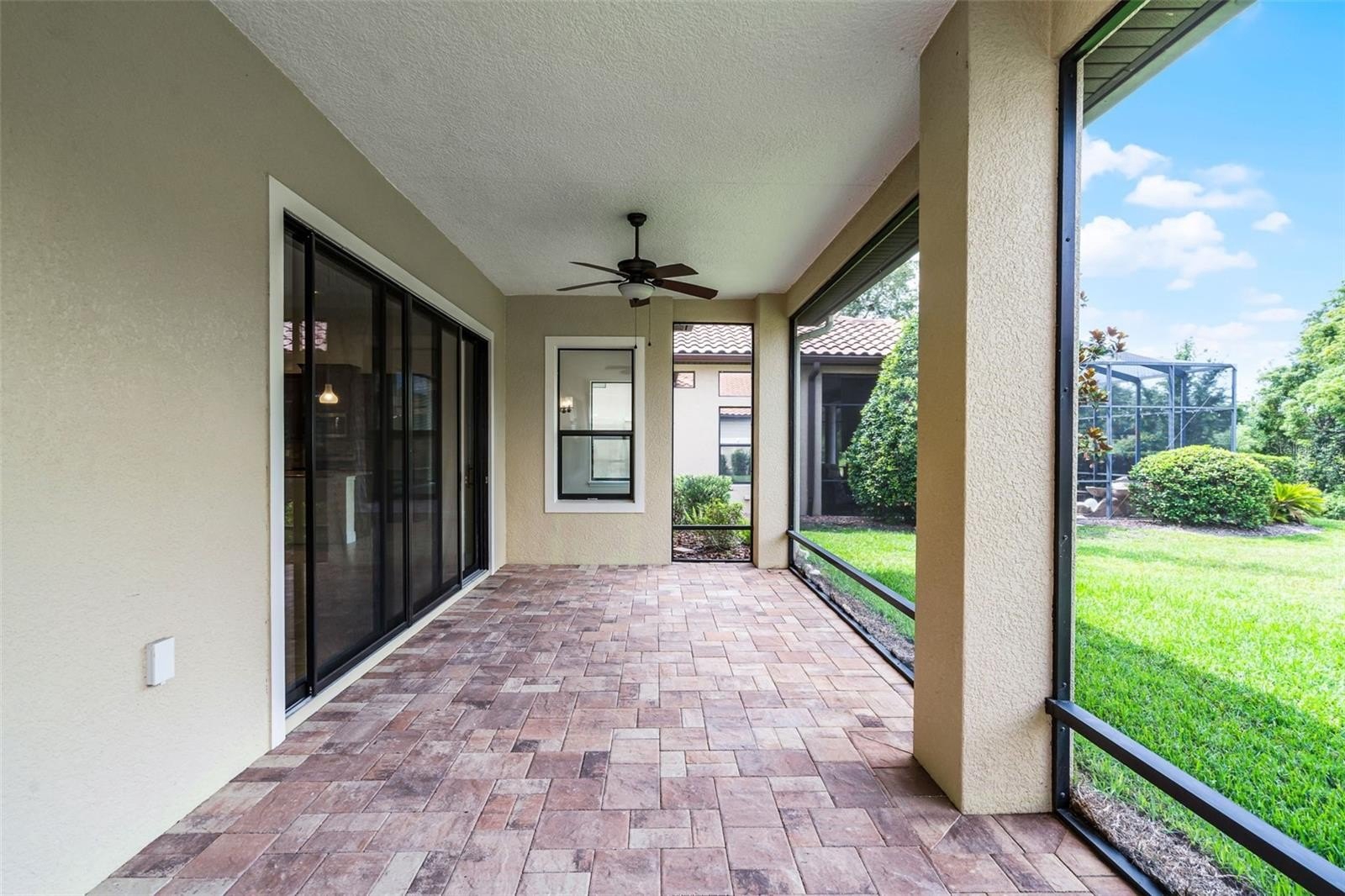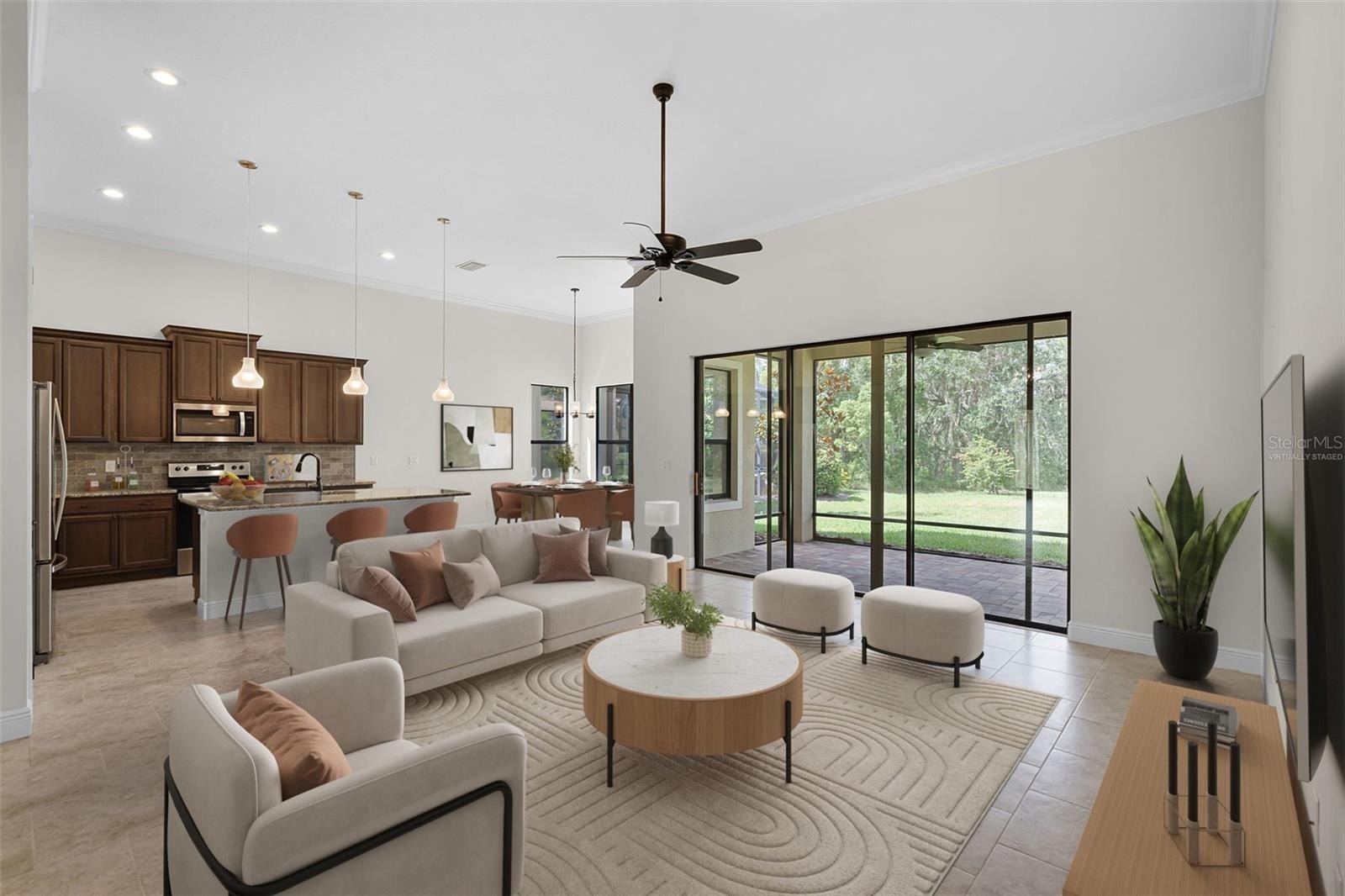 One or more photo(s) has been virtually staged. This beautifully crafted KEVCO-built residence offers timeless Mediterranean design paired with quality craftsmanship and thoughtful details throughout. One of only a limited number of KEVCO homes within Las Colinas, this 3-bedroom, 2-bath split floor plan blends elegance with everyday functionality. Step through the impressive leaded-glass double entry doors into a light-filled interior highlighted by soaring 12-foot ceilings with crown molding in every room, solid wood interior doors accented with detailed architrave trim and casing, custom softwood cabinetry, and granite countertops throughout. Expansive triple glass sliding doors open to a covered rear lanai overlooking a deep, private backyard with peaceful greenbelt views and ample room to design and build your own pool. Beyond the home itself, residents enjoy the distinctive charm of Las Colinas, a professionally maintained enclave known for its tile-roof custom homes and beautiful tree-lined streets. The neighborhood is located within the gates of the newly renovated Mission Resort + Club, set among the rolling hills, majestic live oaks, and scenic lakes of Lake County.