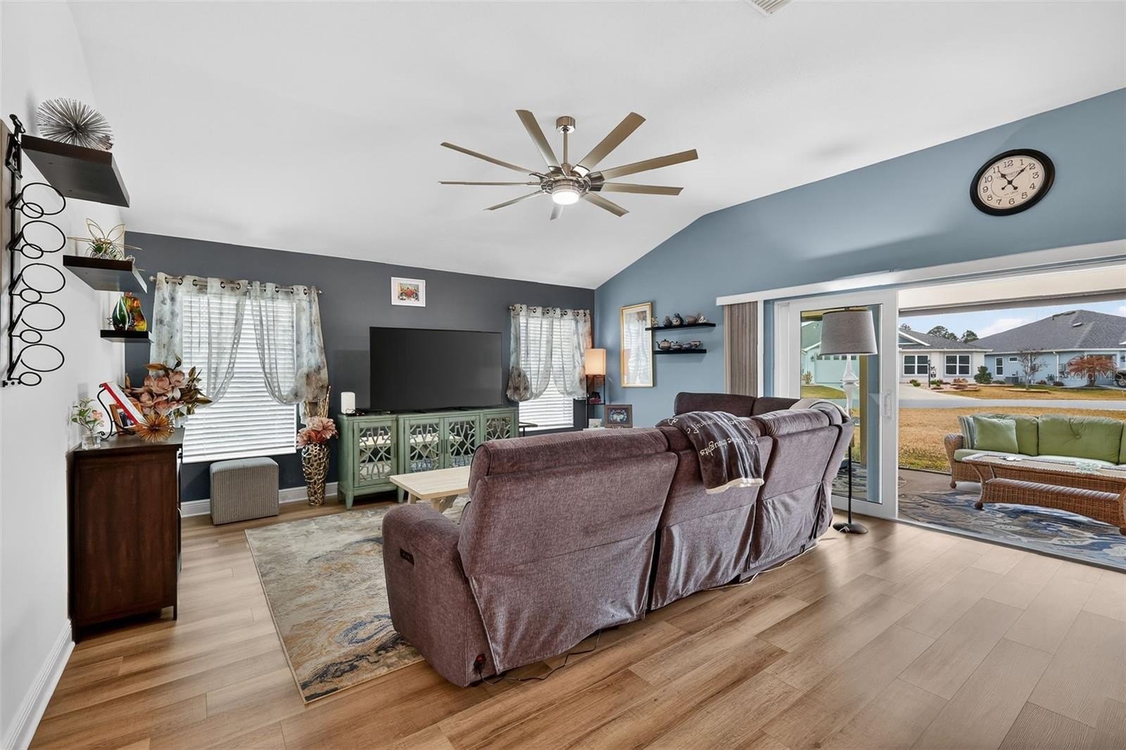 As you walk into this sanctuary of a home you will see a thoughtfully designed living space that offers an open concept attracting the natural lighting and presenting a functional space for entertaining and relaxing. This 3-bedroom, 2-bath masterpiece is Lake Denham’s Spoonbill Model, which was built in 2023 and offers 2,048 of climate controlled square footage. The total square footage is approximately 3,278, including the garage, lanai, and front entry. Along with the welcoming curb appeal, this home has St. Augustine grass, a full irrigation system, and gutters surrounding the home. Inside you will walk into an entreating foyer, a chef’s dream of a kitchen with all stainless-steel appliances, gas range, ample cabinetry, backsplash, and an high-top quartz countertop, perfect for decorative barstools. The living area gives a warm down-home feeling which is adjacent to the spacious dining area that is positioned perfectly for entertaining many or just a small quiet dinner with family.