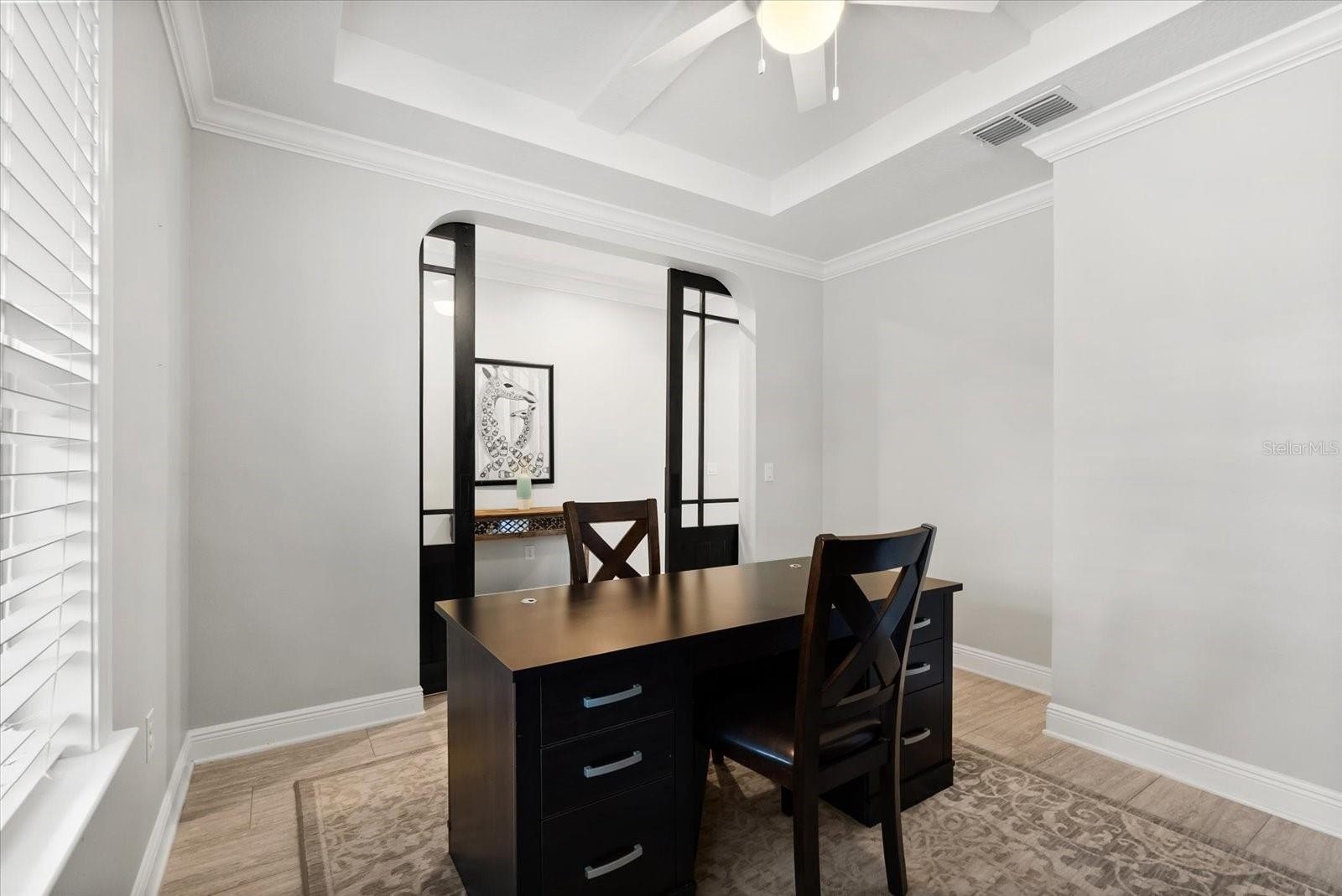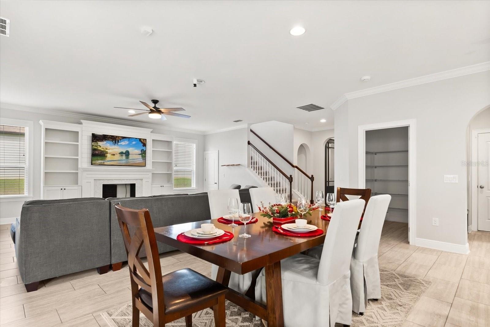 Step inside to find a functional mudroom, a private home office with dual soft-close barn doors, and an elegant half bath. The heart of the home opens into a spacious family room showcasing a custom faux fireplace and built-in TV unit, creating the perfect setting for entertaining.