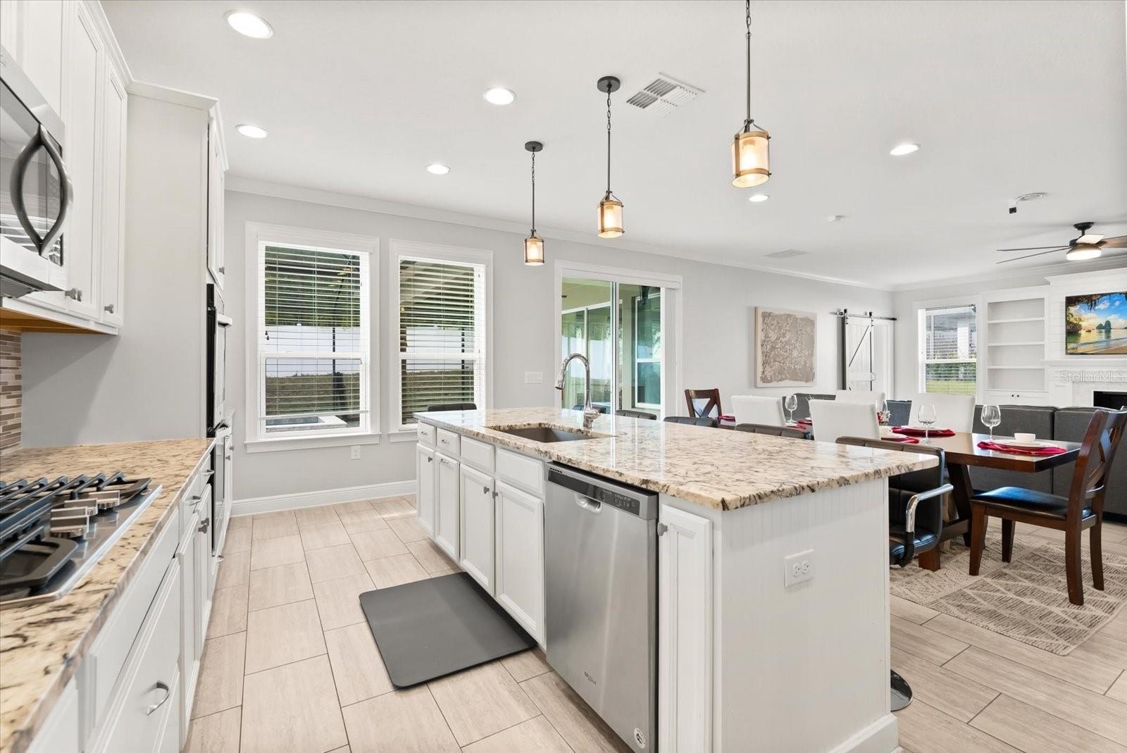 The gourmet kitchen is a chef’s dream, offering granite countertops, abundant cabinetry, double ovens, a gas range cooktop, and an oversized extended island, ideal for both everyday living and hosting gatherings.