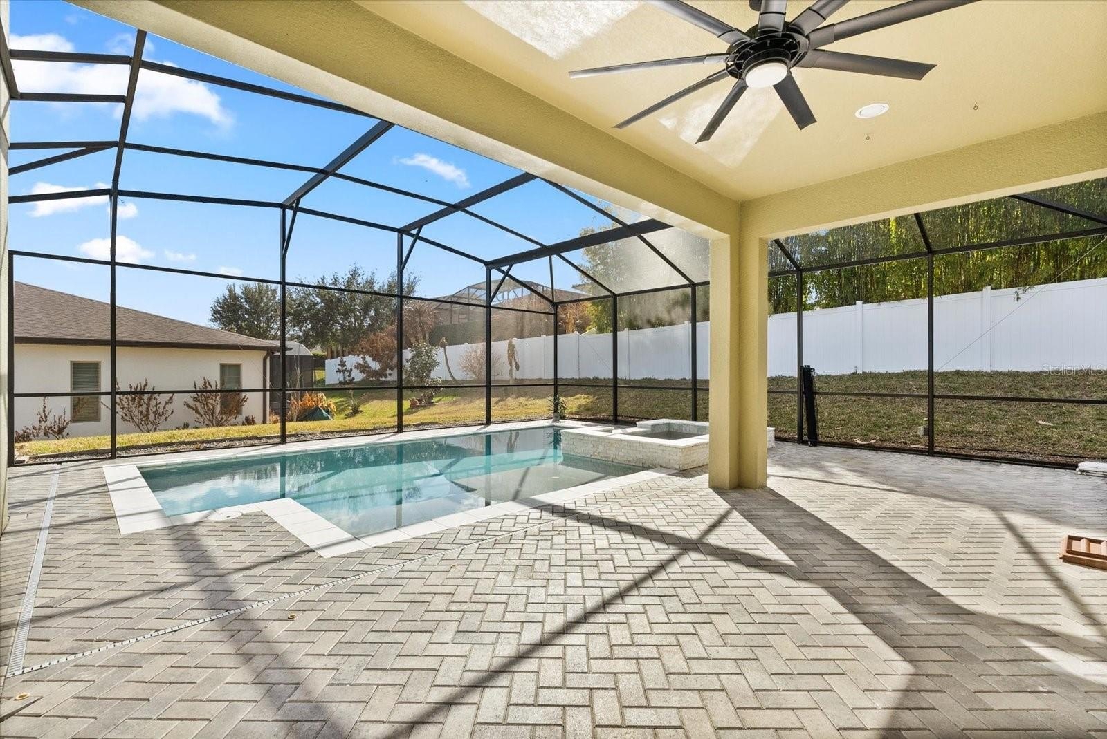 Step outside and unwind in your custom-built screened pool area, complete with beautiful stone tile, pavers, and tranquil surroundings—your personal retreat at home.