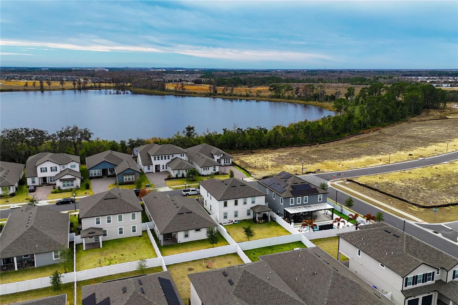 Outside, the residence impresses with a large covered and screened veranda, perfect for relaxing and enjoying leisure time, with direct access to the backyard and an enchanting lake view that creates a peaceful and welcoming atmosphere.
