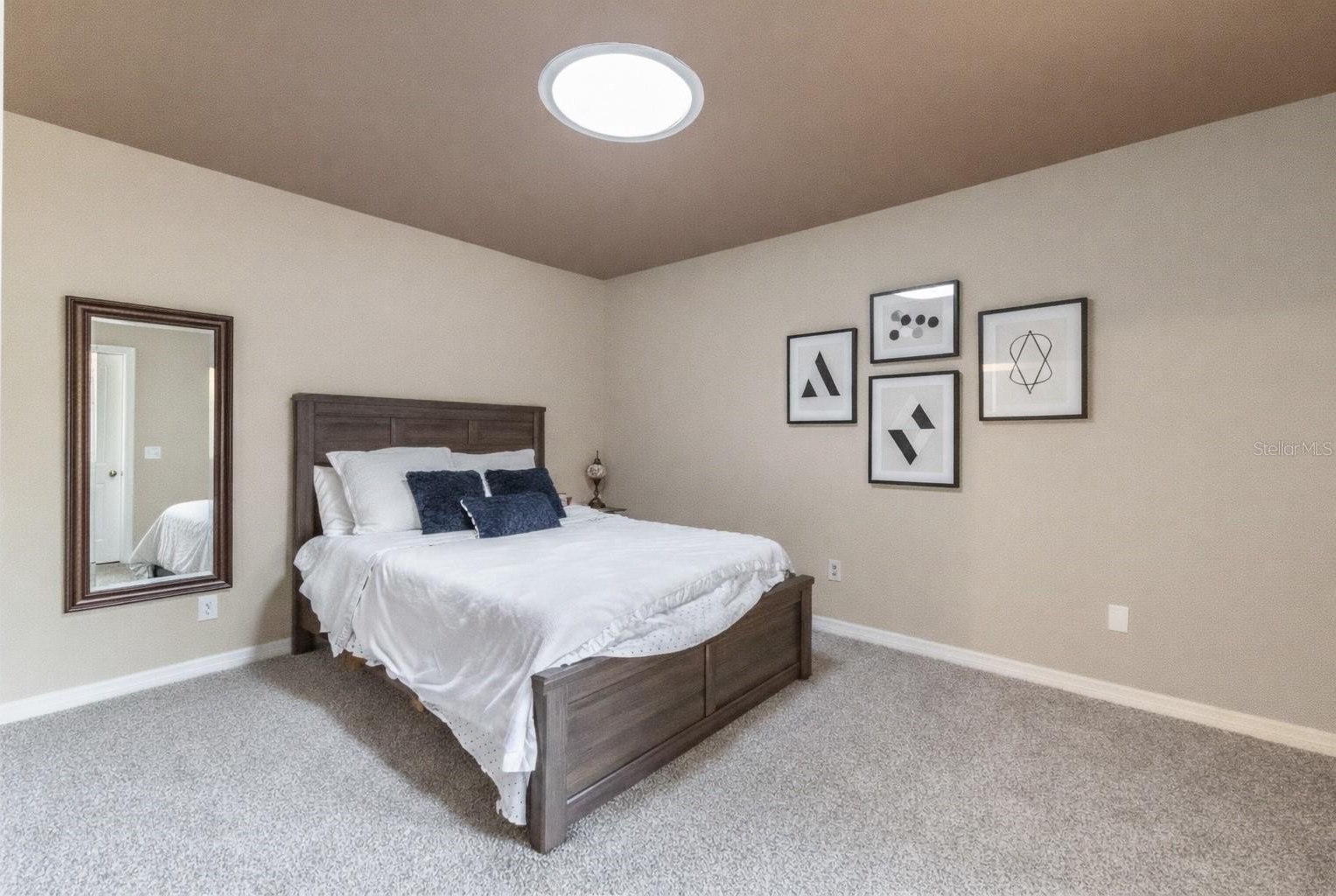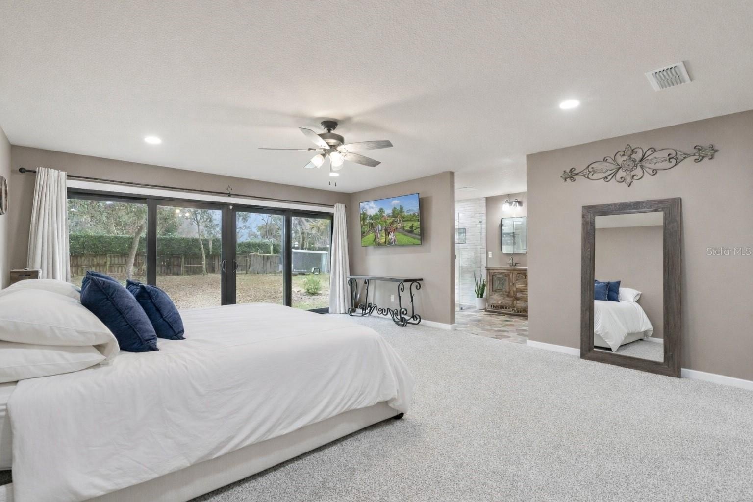 The expanded primary suite serves as a private retreat, thoughtfully configured to include a dedicated office or versatile flex space. Oversized sliding glass doors open directly to the backyard, filling the room with natural light and connecting indoor and outdoor living. A brand-new primary bathroom, an oversized custom walk-in closet, and new carpet complete this private sanctuary.