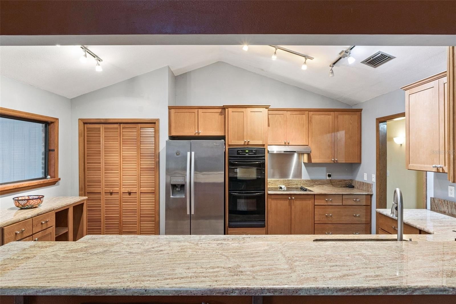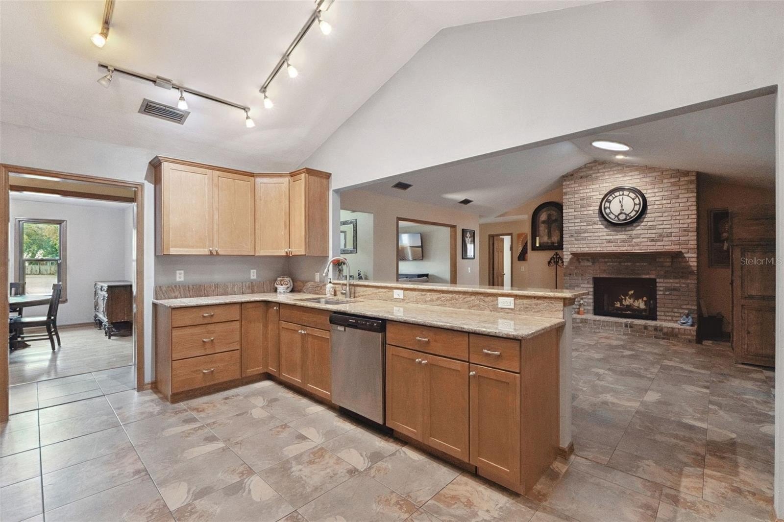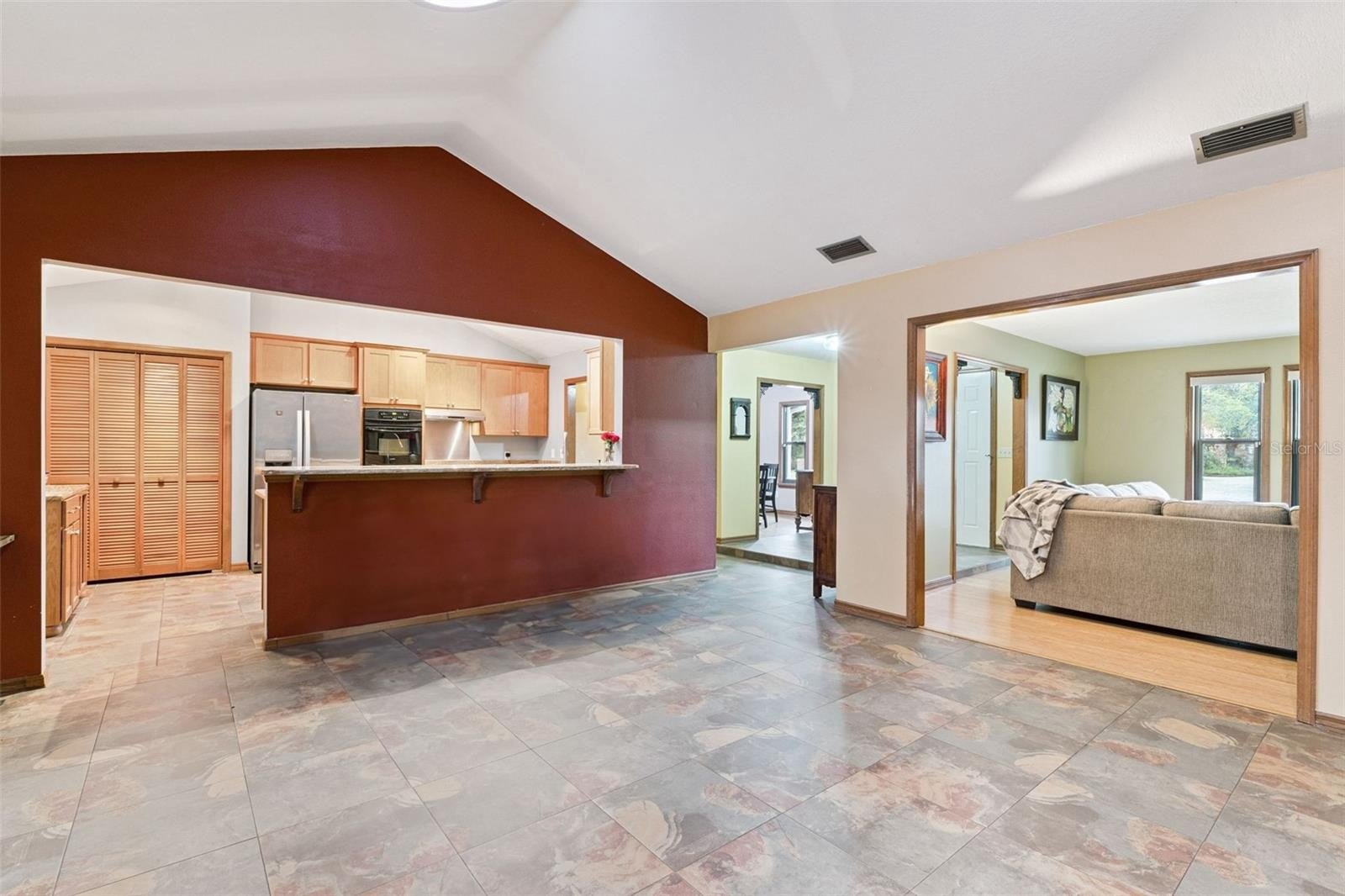 The remodeled open kitchen serves as the heart of the home, featuring granite countertops, stainless steel appliances, a breakfast bar for casual seating, and a generous walk-in pantry. Seamlessly connected to the living and dining areas, the layout allows for effortless entertaining and comfortable everyday living.
