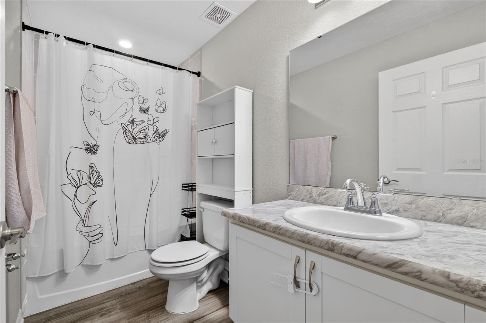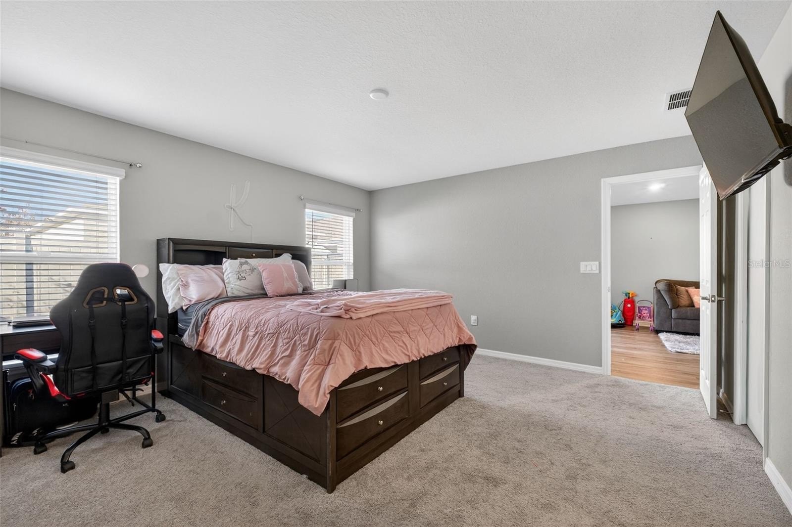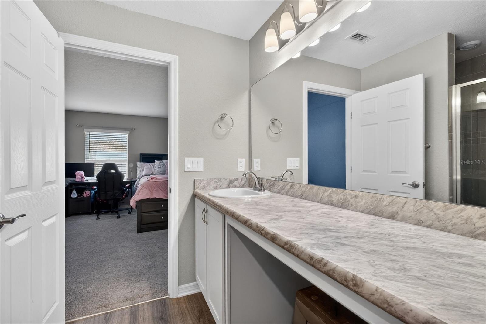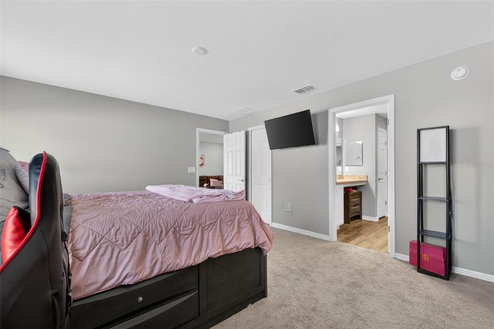With three bedrooms and two bathrooms, this home offers flexibility for a variety of lifestyles. Whether accommodating guests, creating a home office, or designing a playroom, the space adapts beautifully to your needs. The primary suite provides a relaxing retreat, complete with a spacious walk-in closet and a well-appointed bathroom featuring a dedicated vanity seating area — a small but meaningful touch that enhances everyday routines.
